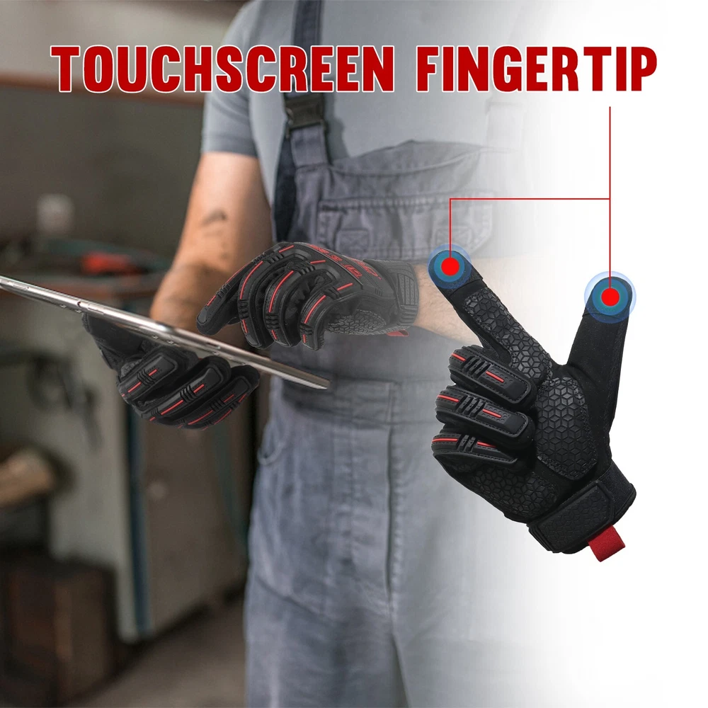 SBR Palm for Effective Anti-Vibration:5mm SBR on the palm provides excellent anti-vibration properties, These anti vibration gloves effectively cut down on the vibrations caused by tools like a random orbit sander and chainsaw, providing relief for workers with nerve damage aggravated by extended tool use. TPR Back for Enhanced Impact Protection: Thermoplastic Rubber (TPR) on the back of the gloves offers superior impact protection, impact-reducing gloves safeguarding your hands from potential impacts or crushing hazards. Enhanced Grip for Safety Work: Improved GRIP NEO palm and fingertips deliver superior grip and wear resistance, ensuring precise handling of tools and equipment. Flexibility for Unrestricted Movement: Designed with flexibility in mind, these heavy duty work gloves allow for natural hand movements, ensuring dexterity and comfortable while working. Touch Screen Compatible: Touch screen work gloves are capable of your phone or tablet without having to take the gloves off.