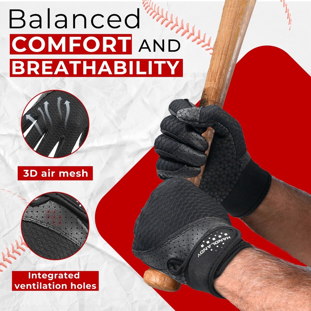 Perfect Fit:The shell-textured stretch-spandex on the gloves back ensure unmatched comfort, superior flexibility, and precise tactile feedback during gameplay.Each pair of HANDLANDY youth and adult baseball batting gloves hugs the skin snugly, allowing your hands to flex and sense the bat with the natural precision of bare skin. Trusted Performance: HANLANDY batting gloves feature diamond-textured grip palms that deliver all-weather control,grip and comfort. Engineered for tournament-ready precision, they enhance swing stability and power transfer for peak performance. Focus On Every Detail: Double-stitch design enhances durability and the lifespan of gloves.The hook and loop wrist strap provides a snug fit and great range of motion, making it easy to adjust the gloves to your liking. Play Together, Stay Together: Available in sizes for kids and adults with a vibrant range of colors, our batting gloves are designed to unite the whole family. These gloves are more than just gear; they're a tool for family bonding. Whether it's weekend games or daily practice, these gloves create unforgettable moments and lasting memories for you and your loved ones. Meaningful Gift:HANDLANDY gloves are engineered for baseball and softball players of all ages and skill levels. These gloves make the perfect gift for athletes, coaches, teams, or enthusiasts—ideal for Christmas, birthdays, or any occasion celebrating a love of the game.