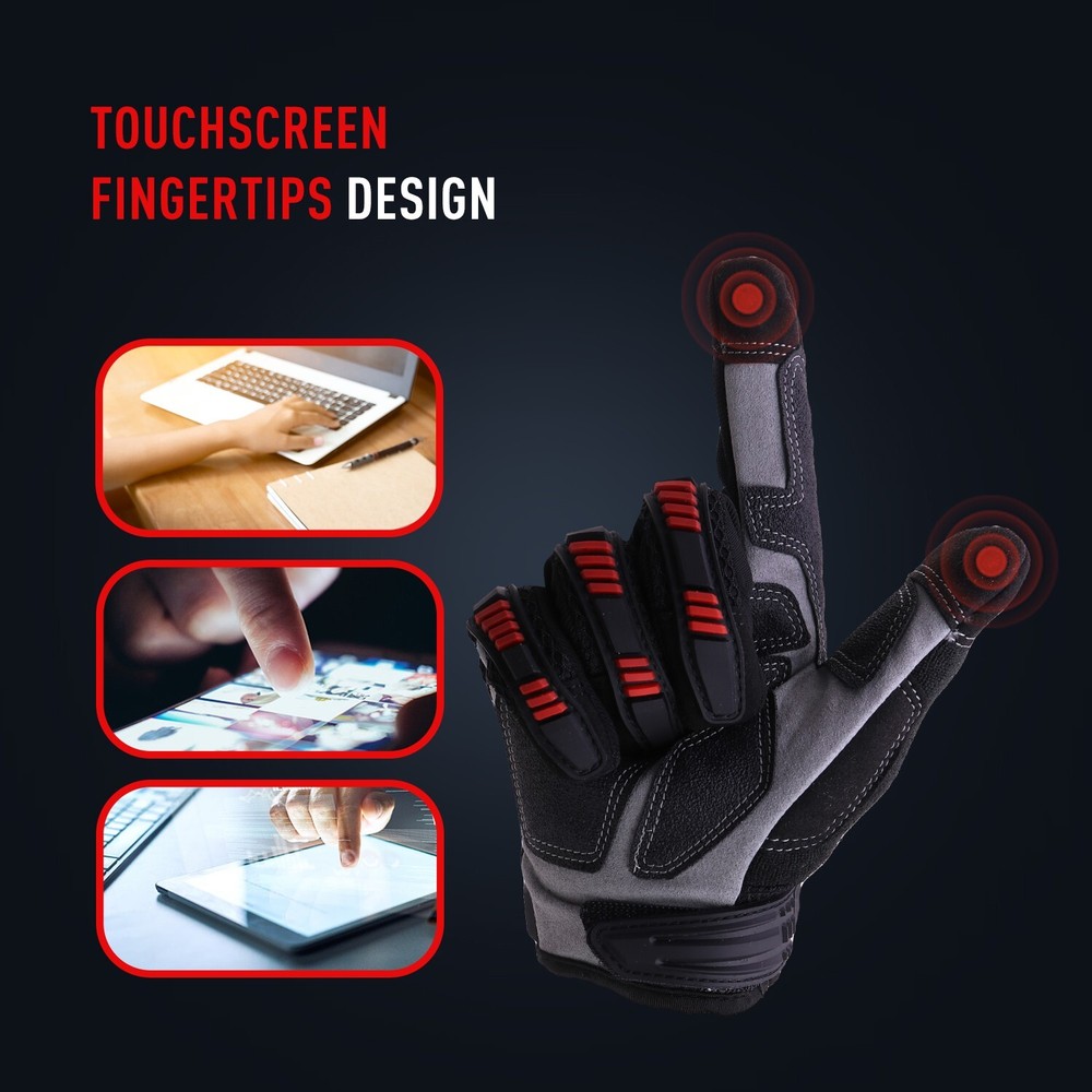Pack of 12 Pairs Reinforced Anti Abrasion & Anti Slip Work Gloves: Synthetic leather with PVC reinforced palm patch, thumb and fingertips for extra durability and protection. Upgraded TPR Protector on Back: Impact resistant mechanics gloves with back-of-hand impact protection safeguards against knocks and bumps without impeding flexibility or dexterity. These work gloves for men could run SMALL, please choose a size up or contrast the Size Chart in the picture 6th before order. Breathable Spandex & Mesh Back: Stretchable spandex back keep your hands cool and comfortable for all day use. Ideal for hand tool use, package handling, tool pushing, heavy construction and so on. Uwrist Design: Exclusive U-shape adjustable wrist closure works perfectly with your watch, keep eyes on your time and your healthy during work, do not need to take off your gloves, and also provides ultra comfort and flexibility fitting. The most important, It can better hold your wrist and also offer the protection on your wrist from the risk of impaction. Touch Screen Fingertips & Terry Cloth Sweat Wipe: Provide instant touchscreen access, and more convenient to wipe your face and sweat away while staying focused on the task at hand.