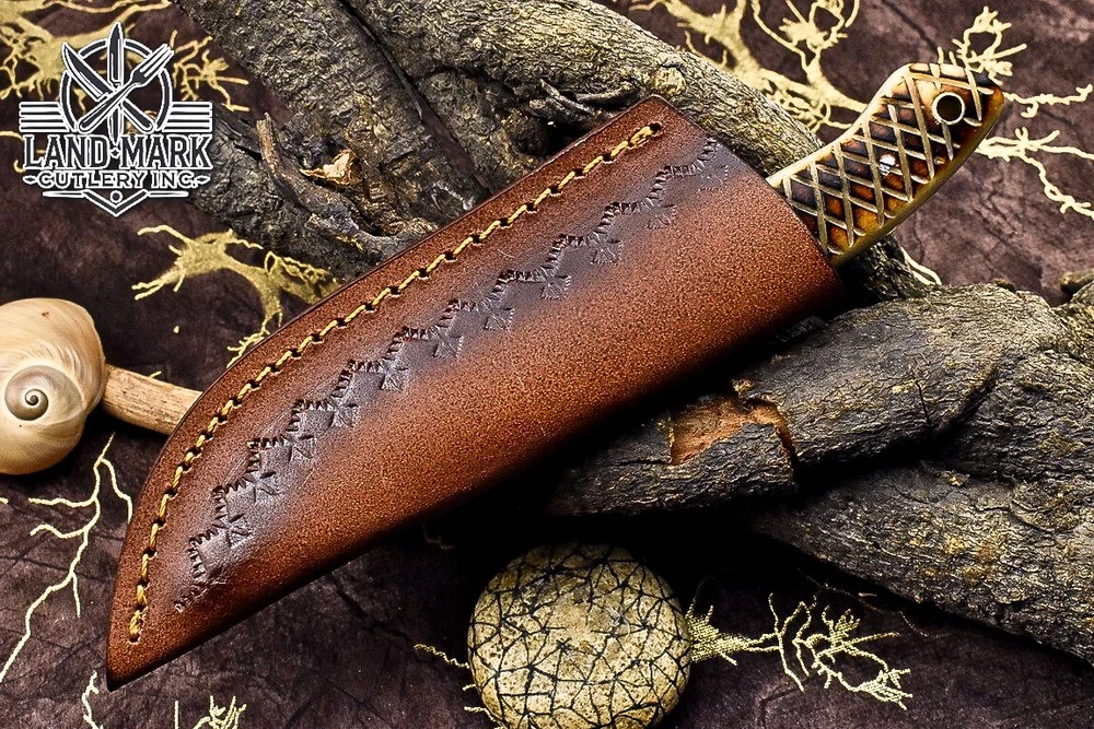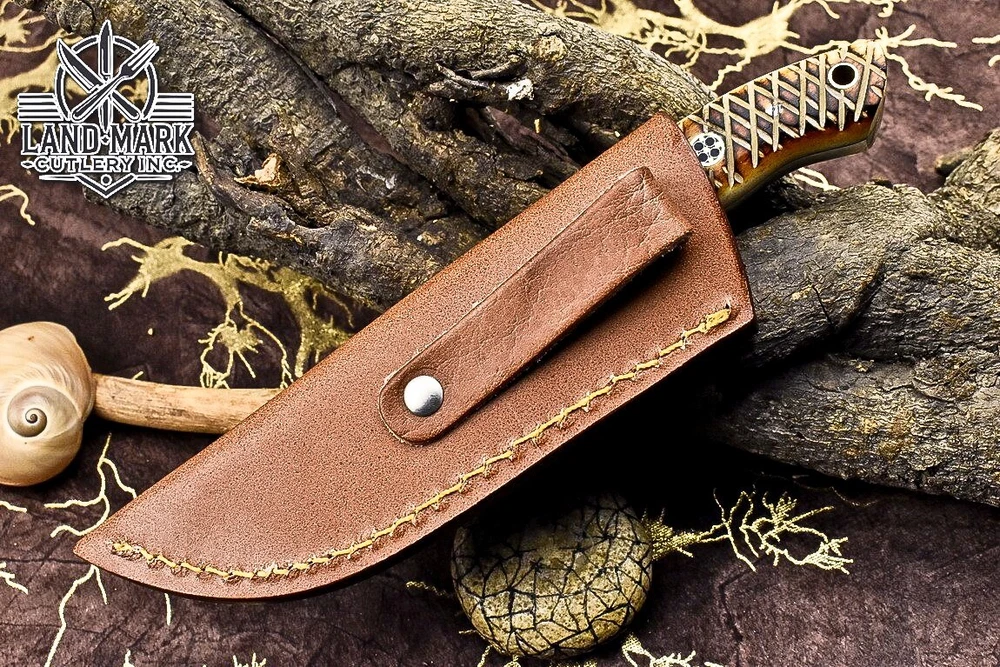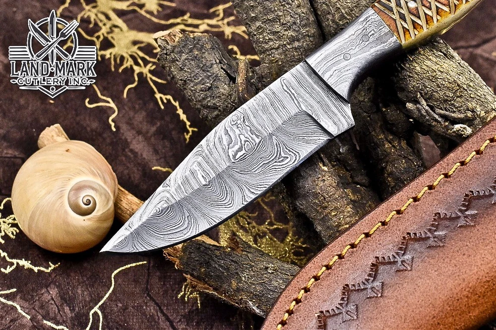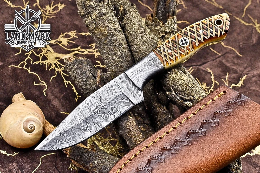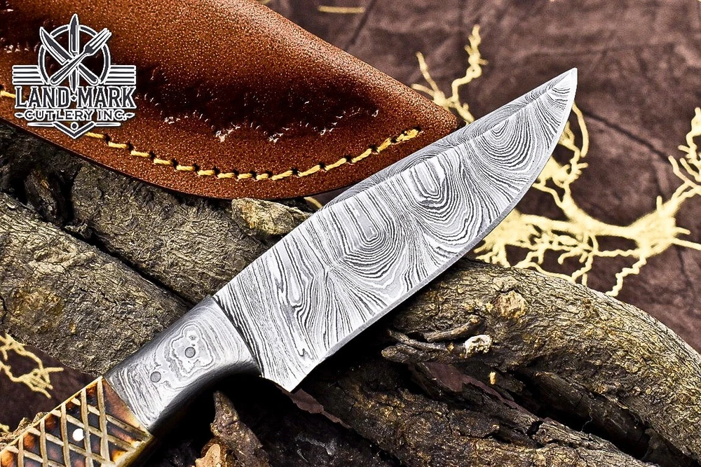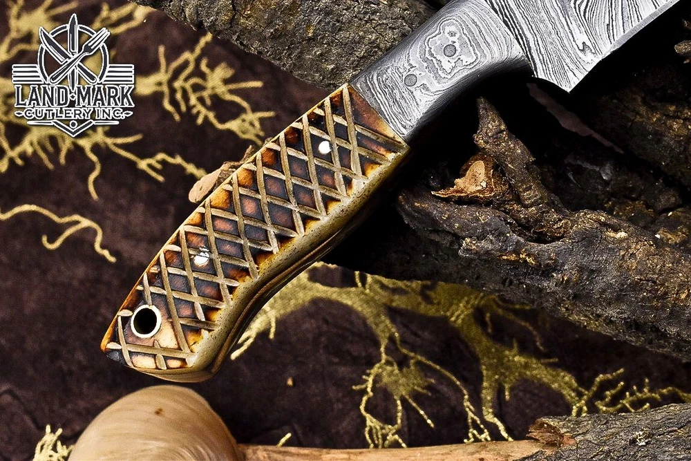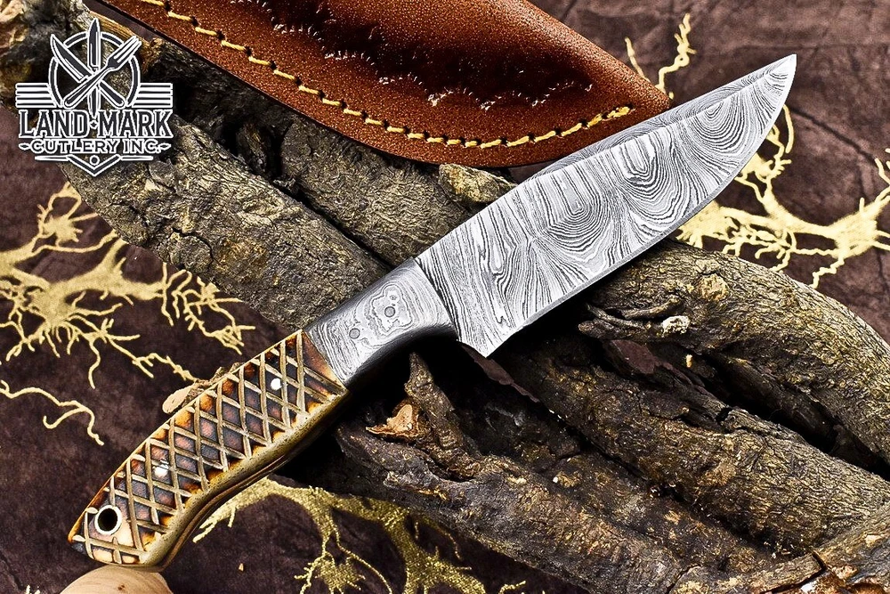 Custom Hand Made DAMASCUS STEEL HUNTING KNIFE WITH FULL CAMEL BONE HANDLE We offer a shipping discount for More then one purchased . And discount will be apply on combine invoice, Discount will not apply on separate payment. ITEM DETAILS OVER ALL LENGTH 9.0 inches long (Approx) HANDLE LENGTH 4.5 inches long (Approx) BLADE LENGTH 4.5 inches long (Approx) BLADE HARDNESS 58-60 HRC Which Holds The Sharp Edge For Long Time. HANDL CAMEL BONE WITH DAMASCUS BOLSTER COVER LEATHER SHEATH This Awesome custom made KNIFE has a nice hand forged with the combination of 4340 & 1080 steel. HOW OUR DAMASCUS IS MADE: All our Damascus is real and not just an acid etch. Damascus is a mixture of 1080HC and 4340 nickel carbon. You heat them up together and then fold the bar over and over to get the desired layers, ours are 396 layers. Then you burn the blade in acid, and it turns the nickel satin color and the high carbon turns blackish gray. This is how the layers are exposed to show the layers of the new steel created coined "Damascus". All Damascus is acid etched to show the layers. If you high polish the metal it will be shinny satin like all steels. Only after you burn the sides of the blade with acid do you see the layers of the two steels. Makes sense? After we make our knives we high polish the handles and put an edge on the blade. The high polishing buffs off the acid burned layer of the handle, and the blade edge is sharpened and the acid burned edge becomes satin. You can re-burn the tang of the blade near the handles and the edge of the blade and it will show the layers once more. All our knives are hand made, durable and unique ***** YOU WILL RECEIVED THE SAME KNIFE Qality Standards Our Damascus blades are made from high quality non-stainless steels which rival or exceed any Damascus blade made from the 10 series with 4340. Our Damascus combination has taken years to perfect and has been tested under a variety of application which will offer professional performance in categories of toughness, strength (lateral stress) and edge honing and holding ability. In a 5 spot Rockwell test our blades will average near or close to 58 which offers a perfect balances between its toughness and strength.Our blades due to carbon content need to be regularly treated with wax and/or 3 in 1 oil to maintain its superior quality. Questions if you have any question feel free to send us message we aim to answer all questions within 24 hours Feedback If you are not satisfied with our service please contact us before leaving any negative or natural feedback. We will resolve all issues as quickly as possible. Disclaimer We are not responsible for any injuries associated with the use of our tools. Our products are intended for legal use only by responsible buyers. Therefore, we will not sell our products to anyone under the age of 18. Before bidding please check your country laws as some countries Custom don't allow this. If your purchase is held by Custom Authorities in your country/State we will not be responsible for that and no refund will be issued Shipping We offer a 20% shipping discount for More then one purchased . And discount will be apply on combine invoice, Discount will not apply on separate payment We ship within 24 hours after receiving complete payment but this can be delayed due to week ends or Governments and Religious Festivals . . This is beyond our control and we apologize for this inconvenience. Precautions Our Tools are very sharp so open and use them very carefully We are not responsible for any injuries associated with the use of our tools Tips to Care knife 1. NEVER STORE YOUR KNIFE FOR LONG TIME IN LEATHER SHEATH. 2. LEATHER CAN ABSORB WATER, WHICH WILL RUST THE KNIFE. 3. ALWAYS CLEAN THE BLADE AFTER USING WITH OIL OR WAX
