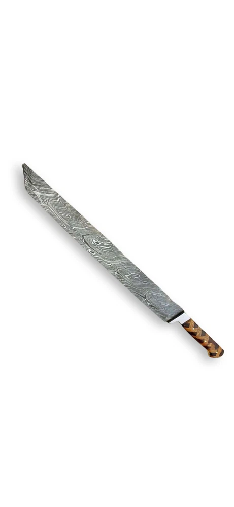 HAND FORGED DAMASCUS STEEL BUTCHER/BRISKE T CHEF KNIFE Blade of this knife has a nice file work and is made of 256 layers of stainless steel and high carbon steel with hardness 56-58 HRC. This process takes approximately 48 hours to complete. Specifications: Handle Material : ROSE AND OLIVE WOOD Lanyard Hole : ------- Blade Material : Damascus steel Overall Length :17.5" inch Handle Length : 5.5" inch Blade Length : 12" inch Layers: 256 Sheath Material: Leather Hardness: 56-58 HRC Package Includes: Knife and Leather Sheath Packing: Our products are packed after oiling and finishing as per tool requirements which are safe and reliable AGE RESTRICTION: WE DON'T SELL KNIVES TO ANY ONE WHO IS UNDER AGE 18. WHEN YOU BUY A KNIFE FROM US YOU ARE CONFIRMING THAT YOUR AGE QUALIFIES FOR THIS PURCHASE AND THIS IS A LEGAL PURCHASE. Warning: Take care when removing product from packaging. Keep fingers clear of blades. Keep away from children. We are not responsible for injuries caused by the use of this item. FEEDBACK POLICY: YOUR FEEDBACK IS VERY IMPORTANT FOR US, IF THEIR IS ANY KIND OF PROBLEM PLEASE GIVE US OPPORTUNITY TO SORT THE ISSUE