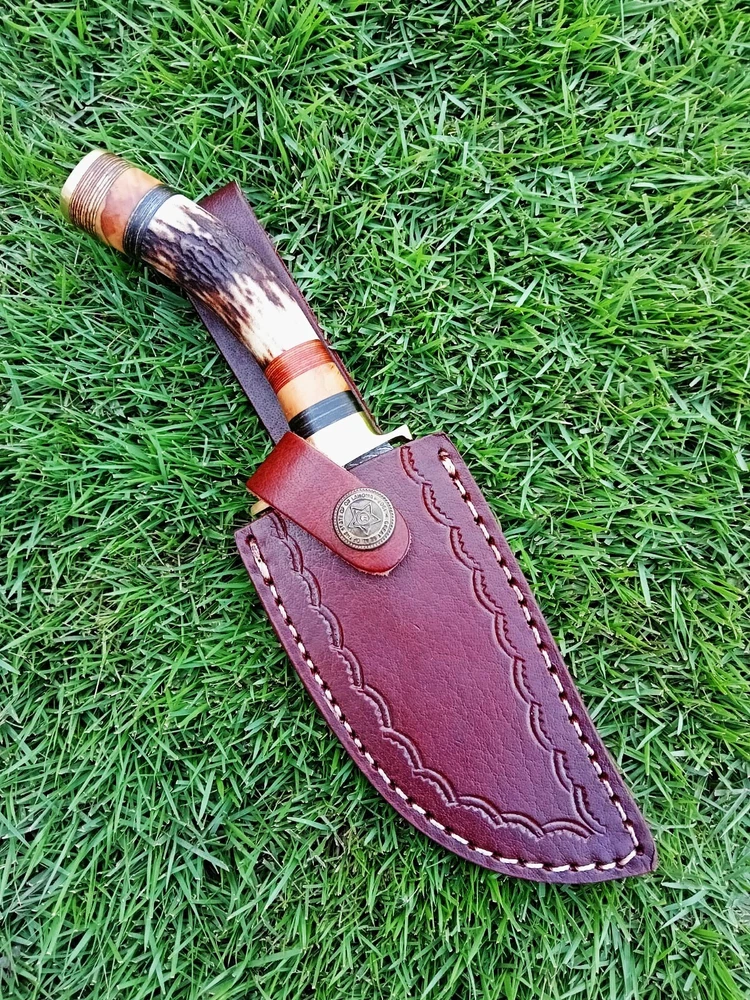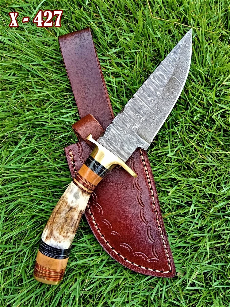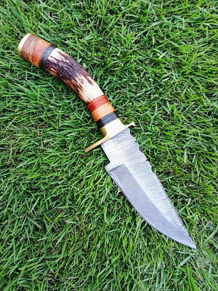 CUSTOM HANDMADE HAND FORGED DAMASCUS STEEL HUNTING KNIFE STAG With Brass GUARD Handle This superb design knife is hand forged. Blade of this knife has a nice file work and is made of 512 layers of 4340 stainless steel and 1075 high carbon steel and hardness 55-58 HRC . This robust knife is lab tested under intense conditions, the balance and shape of this knife ensures perfect grip. Overall Close Length: 8" Inches Blade Length: 4" Inches Damascus Design: Twist Pattern Layers: 512 Sheath: Leather Hand Forged