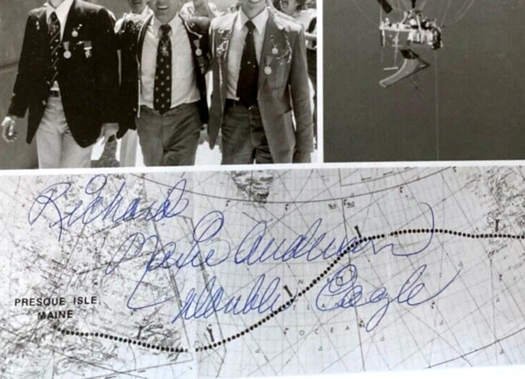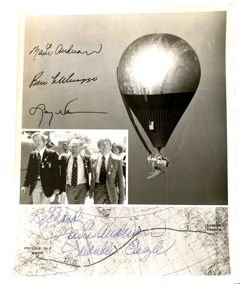 Bottom autograph is HAND SIGNED by Maxie Anderson "DOUBLE EAGLE" balloonist ~FIRST ATLANTIC OCEAN CROSSING~ Please see photos. Very good condition. DOUBLE EAGLE - Signed and inscribed 8 x 10 photograph by MAXIE ANDERSON. Ben Abruzzo (1930-1985), Maxie Anderson (1934-1983) and Larry Newman (1947-2010), were the pilots of the first balloon to cross the Atlantic Ocean in 1978. The composite image depicts the balloon in flight, a map charting the route of the flight and an image of the three crew members in together. The photo is signed in blue ball point pen on the bottom image by Maxie Anderson and is inscribed to "Richard". The photo also features "facsimile" signatures of each of the crew but Maxie Andersons signature is authentic. Autographs of Maxie Anderson are scarce following his untimely death in a flying accident in 1983. This unique item is a signed piece exemplifying the ingenuity of humanity. The signature belongs to the pioneering balloonist Maxie Anderson, and the item is titled "DOUBLE EAGLE". This piece is an original and was produced in the United States. It is a wonderful addition to any collection of Science or Inventor memorabilia as well as for Autograph collectors.