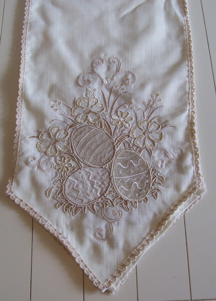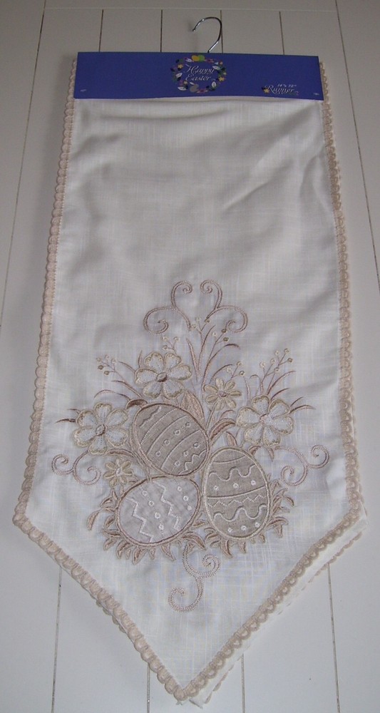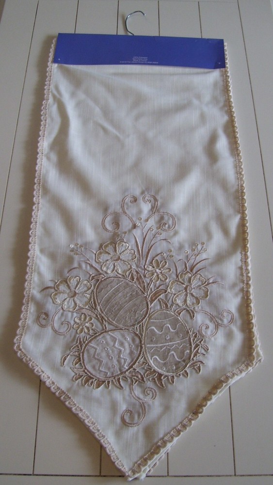 HAPPY EASTER IVORY Easter Egg Floral Lace Trim Embroidered Table Runner. 14" X 72". New with tags/hanger. Smoke and Pet free home. Winning bidder to pay within 3 days listing end. Check out my other listings for more great deals! RETURN POLICY DETAILS Returns are accepted with prior approval ONLY if item is misrepresented in the listing. You must contact me first before returning an item. I do NOT accept returns for buyer choosing the wrong size/item not fitting. There are NO returns/refunds on pageant and special occasion wear.
