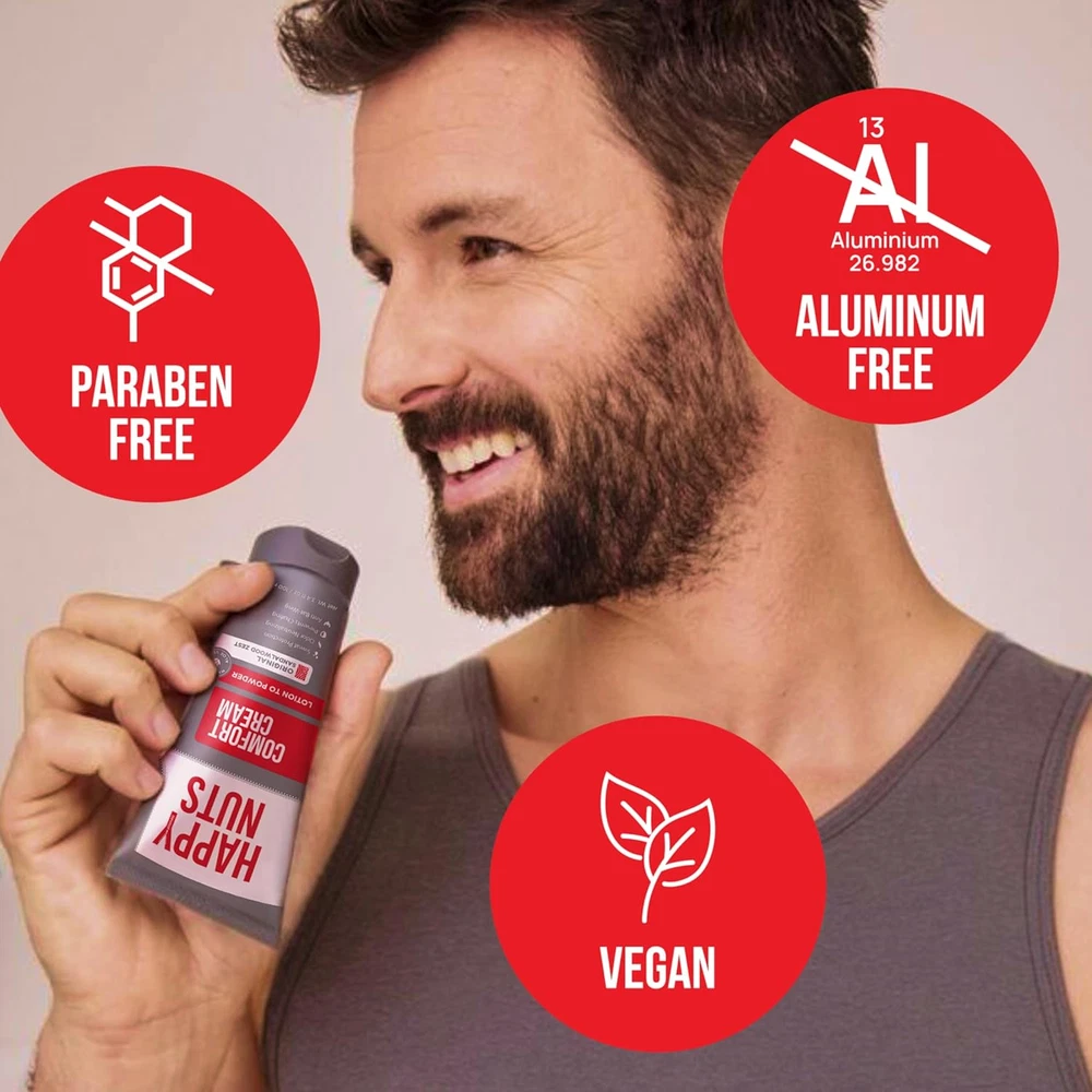 Store New Arrivals Add to Favorite View Feedback Contact HAPPY NUTS Comfort Cream Deodorant for Men: Anti-Chafing Sweat Defense, Odor Control, Aluminum-Free Mens Deodorant & Hygiene Products for Men'S Private Parts 3.4Oz, Original Description Manufacturer Suit Up Brands LLC Item Form Cream Special Feature All Day Protection, Odor Blocking, Gentle Formula, Travel Size, Dermatologist Tested Brand HAPPY NUTS Country of Origin USA Size 3.4 Fl Oz (Pack of 1) Scent Original Package Dimensions 5.91 x 1.89 x 1.54 inches; 4.66 ounces Material Type Free Talc Free, Sulfate Free, Gluten Free, Aluminum Free, Paraben Free EXTRA STRENGTH PROTECTION - An aluminum-free cream that provides long-lasting odor and sweat protection, keeping you feeling fresh and confident with unparalleled comfort in between the legs all day long to keep up with any active lifestyle. LOTION-TO-POWDER TECHNOLOGY - Comfort Cream applies as a lotion, and dries as a powder to absorb your sweat and create an anti-friction layer, all while keeping you smelling like you just got out of the shower, even if you didn’t. CLEAN INGREDIENTS - Our deodorant is made with clean ingredients to help keep your private parts safe and healthy. We use coconut, aloe, tapioca, and sandalwood aroma to nourish and protect your skin delivering maximum odor protection. Its formulated with aloe to soothe the area from any chafing, itching, or irritation. GENTLE FORMULA - Formulated for even the most sensitive skin and easy to apply. Its lightweight, non-greasy lotion-to-powder technology with no strong odors or fragrances gives you all-day protection without irritation or discomfort. MENS GIFTS FOR VALENTINE'S DAY - A fun and functional gift for him, ideal for husbands, boyfriends, and any man who has everything wants to stay fresh and comfortable this year. Product Description The video showcases the product in use. The video guides you through product setup. The video compares multiple products. The video shows the product being unpacked. Discover Happy Nuts Products Add to Cart Add to Cart Add to Cart Add to Cart Add to Cart Add to Cart Customer Reviews 4.6 out of 5 stars 275 4.4 out of 5 stars 218 4.0 out of 5 stars 277 4.6 out of 5 stars 129 4.5 out of 5 stars 1,769 4.2 out of 5 stars 5,829 4.6 out of 5 stars 2,907 Price $18.00 $ 18 . 00 — $39.00 $ 39 . 00 $15.00 $ 15 . 00 $18.00 $ 18 . 00 $59.00 $ 59 . 00 $18.00 $ 18 . 00 Key Feature Chafing Prevention Toning & Cooling Body Spray Nut-Safe Blade Traditional Non-Talc Formula Innovative Non-Aerosol Powder Nut-Safe Pivoting Blade pH Balanced Body & Nut Wash Scent Unscented Original N/A Original or Unscented Original N/A Sandalwood Primary Application Below the Belt & Body Below the Belt & Body Below the Belt, Beard, & Body Below Belt & Body Deodorant Below Belt and Body Deodorant Below the Belt & Body Below Belt & Body Wash Travel Friendly ✔ ✔ ✔ ✔ ✔ ✔ ✔ Category Anti-Chafing Deodorant Grooming Deodorant Deodorant Grooming Shower ABOUT US We offer the best prices around on high quality products. Our E-store includes media such as books, movies, music and games while offering electronics, toys, sporting apparel, clothing, tools, general home, garden items and more. SHIPPING We are always working hard to ensure your package arrives as soon as possible. Please understand that some factors like weather, high postal traffic, and the performance of shipping companies are outside of our control. We offer free shipping to the lower 48 states and ship within 2 business days of payment, usually sooner. We do not accept P.O. Boxes. Please provide a physical address. RETURNS We offer a 30-Day Return Policy on items which you are not completely satisfied with. You have the option for a full-refund or an exchange of the item. No returns are available on items shipped outside of the USA. PAYMENT We accept PayPal. CONTACT US This page content is yet to come Please ad us to your favorite seller and visit again later Thank You CUSTOMER SATISFACTION We try our very best to make sure every customer is completely satisfied. If there's a problem, message us! We're happy to help.