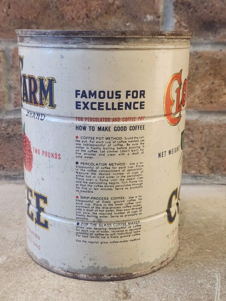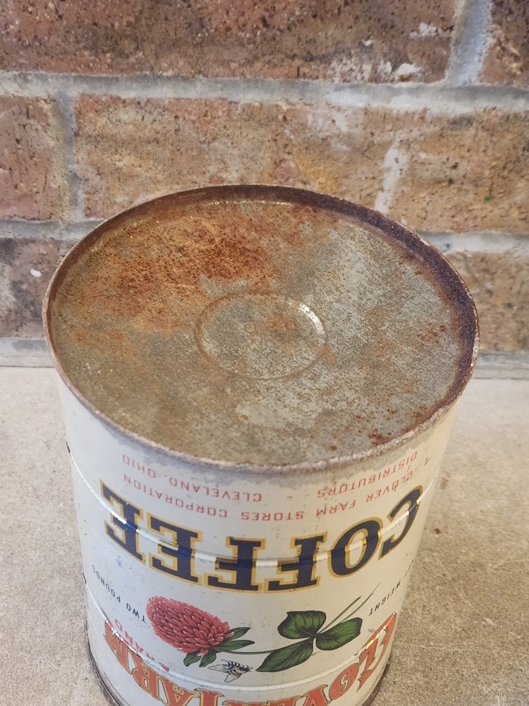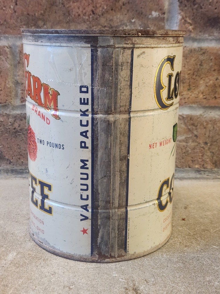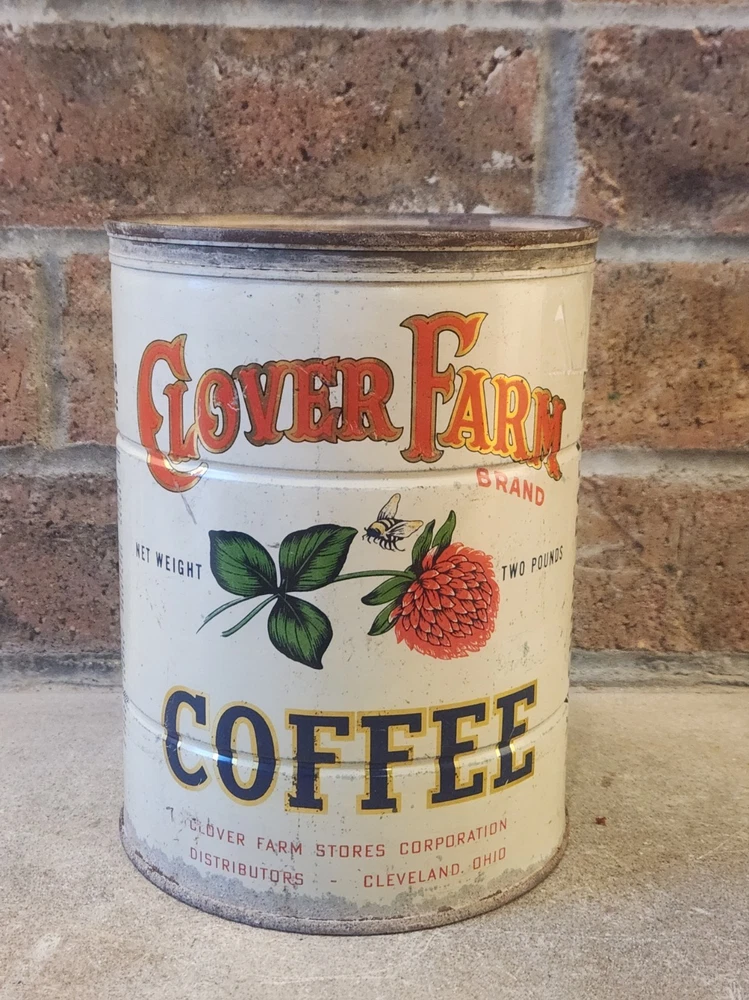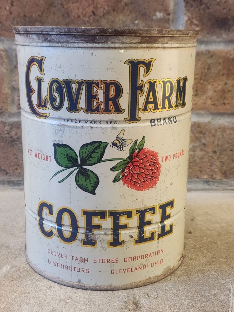 The product is a vintage 2 lb tin litho container of Clover Farm Coffee, featuring a design with a farm and a clover. This collectible advertising item is hard to find and comes from Cleveland, Ohio. It would be a unique addition to any merchandize and memorabilia collection, especially for those interested in vintage tins or coffee-related items.