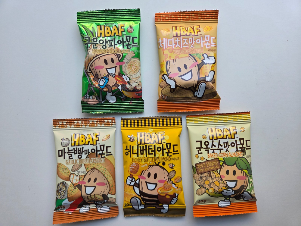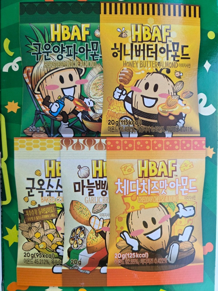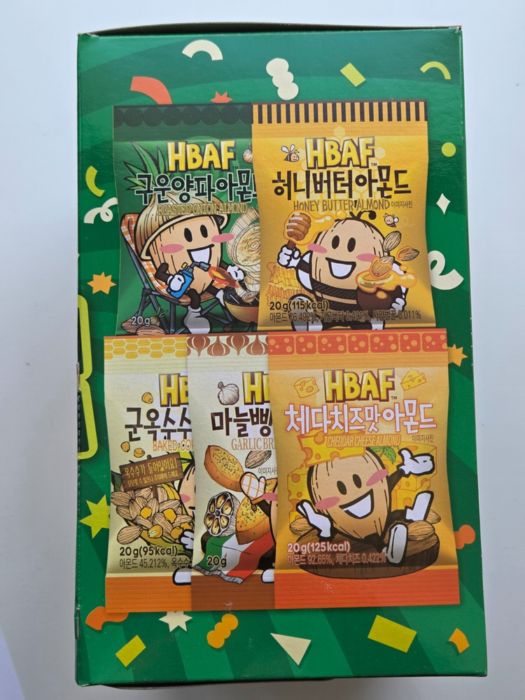 [Product Information] Brand: HBAF (Heon-Ba-Peu) Item: Almond Party Box (Multi-pack) Quantity: 25 Mini Packs (20g per pack) 5 Delicious Flavors Included: Honey Butter Almond Cheddar Cheese Almond Roasted Onion Almond Garlic Bread Almond Baked Corn Almond [Why Choose This?] Perfect for gifts or trying various famous Korean almond flavors. Convenient mini-size packs for easy snacking on the go. Expiration Date: Long shelf life (We always ship the latest products from the market).