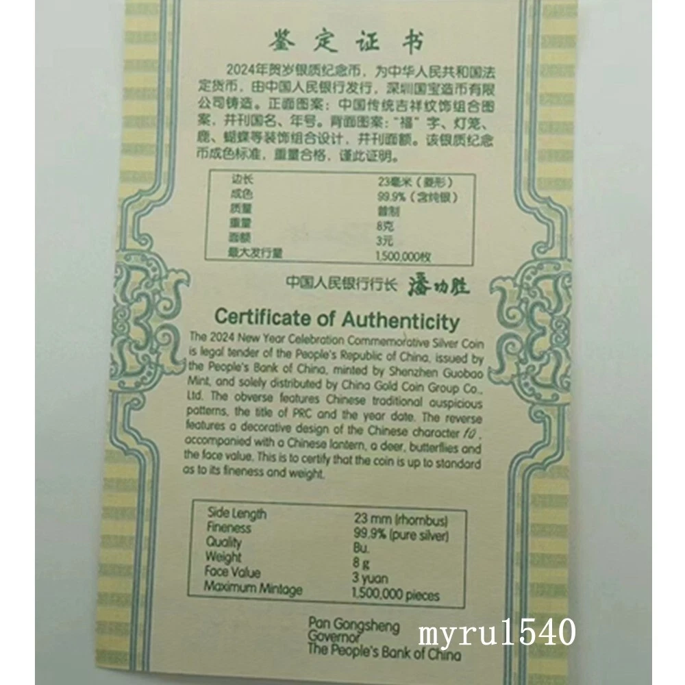 Item name:2024 China 3 YUAN Coin China New Year Celebration Good Fortune(Fu)Silver Coin 8g Purity :Silver 99.9%;Weight: 8 g;Diameter: 25 MM;Face Value: 3 YUAN Number of issues : 1500000PCS Issue time:2024 Issued by :The People's Bank of China ( Notes: The certificate number is random delivery ) We will send item with 3 business days when payment is confirmed, Usually 7-40 days arrived. The pictures are for reference only. We have more than one, we relist the same eBay listing and use the same/old pictures after we sold one item. So you may not receive the same item as in the pictures, however the item you’ll receive will be in the similar condition as in the pictures. We accept "PAYPAL" for payment。Good Luck for Everybody。Please view our other goods。 For more information, please contact to me.