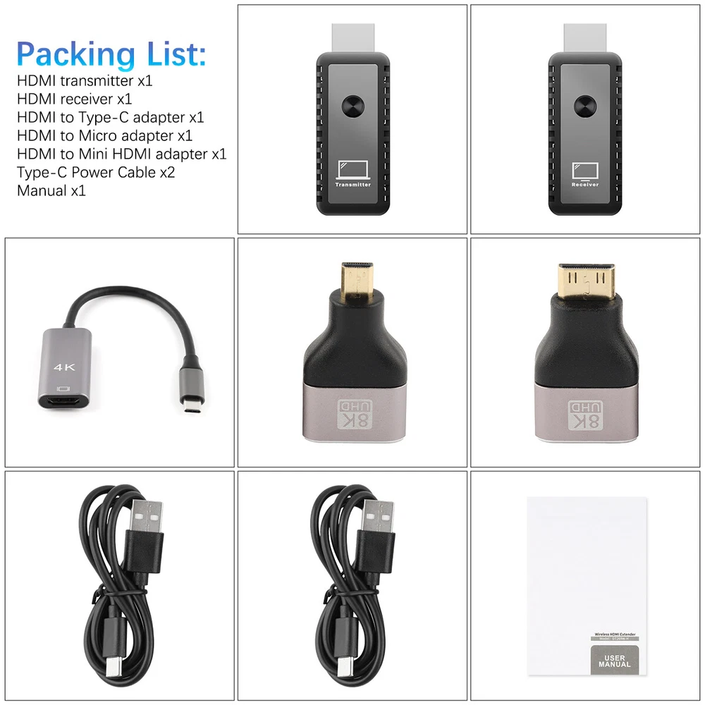 You may also like Male RCA to HDMI Converter with HDMI Cable for N64/Wii/PS2/Xbox TV 720P/1080P US 15.98 USD Free shipping For Sony PS1/ PS2 to HDMI Adapter Game Console Audio Video Converter Cable Cord_ 12.35 USD Free shipping Original Xbox to HDMI Converter Adapter HD Link Cable for Original Xbox 1080P_US 12.08 USD Free shipping Product Description ⚑US Stock, the estimated delivery time is about 2-5 business days. ⭐100% Brand New and High Quality Features: ⭐ Brand new 2024 model, a complete set of adapters has been added,with a wide range of adaptable transmitting and receiving devices: HDMI to Type-C adapters and HDMI to micro adapters have been added. The HDMI to Type-C adapter cable can be connected to the transmitting end to transmit signals to devices with Type-C interfaces; The HDMI TO micro adapter and HDMI TO mini HDMI adapter can be used on both the transmitting and receiving ends, connected to devices with corresponding interfaces! πŸ₯‡ HDMI signal 30 meter wireless transmission : This same screen device supports wireless transmission of HDMI signals up to 30 meters over long distances, suitable for various scenarios such as meetings, speeches, work reports, etc; πŸ’Ž Audio and video synchronous transmission: The wireless same screen device simultaneously transmits video and audio signals without the need for an additional audio adapter ; πŸ† HD transmission: This same screen device supports maximum 1920x1080@60HZ High resolution video transmission, high-definition lossless synchronization signal; πŸ“± Plug and play, easy to operate: simply follow the instructions in the manual to connect the receiver to the monitor, the transmitter to the HDMI output device, connect the USB power cord, and wait for the product to automatically pair, without the need for complicated connection steps; ⚑ One click disconnection and reconnection design: The buttons on the same screen are designed, and the connection status can be completed with just one click, making it convenient for personal viewing and switching between large screen displays; πŸ’» Supports automatic selection of 2.4/5GHz networks and stable signal transmission; 🐝 The device size is smaller than most similar products on the market, convenient for installation, does not take up space, is lightweight, and easy to carry and use. Notes: The 2.4/5GHz network in the product parameters is the transmission network between the device transmitter and receiver, which is automatically matched and does not require manual operation. Please connect the USB power cord when using the product; Please pay attention to distinguishing between the transmitter and receiver, and avoid inserting them in the wrong position; The product only supports pairing the transmitter with the same screen device. Please carefully confirm the interface, usage method, and suitability of the adapter for your device. Product parameters: Material: ABS Interface: HDMI input/output (transmitter receiver) Expansion interface: Type-C input, micro input/output, mini HDMI input/output (implemented through adapter) HDMI interface version: HDMI 1.3, backward compatibility Supported resolution: 1920x1080@60HZ Transmission frequency band: 2.4G/5G dual band Interface bandwidth: maximum 6.75Gbps Projection distance: Maximum 30 meters (open space without walls or signal barriers) Applicable devices: desktop computers, HDMI interface/Type-C interface laptops, game consoles, DVDs, etc Key function: One click disconnect/reconnect Power cord interface: Type-C Power supply: 5V 1A/5V 2A Packaging list: HDMI transmitter x1 HDMI receiver x1 HDMI to Type-C adapter x1 HDMI to Micro adapter x1 HDMI to Mini HDMI adapter x1 Type-C power cord x2 Instruction manual x1 Payment We accept PayPal only. If buyer want to delay the payment because of financial problem, please contact me by the ebay message within 3 days Payment via PayPal (PayPal accepts all major credits/debit cards and eCheque) ECheque payment will tak e 3-10 days to get clear, thus DELAYing the shipment. Shipping Handling time: 1 business day (Orders are not processed on weekends & holidays) Tracking information will be sent once item is shipped. Local pick-up is unavailable at the moment. For international shipping and shipping to Guam, Hawaii and Alaska, Please contact us before placing the order. Item is shipped to ebay address. Leaving correct address can minimize delay. Terms For any issues with Defects, Return, Item Exchange request, please contact us first and send us a message first before opening any type of case or request. We devote ourselves making EVERY CUSTOMER in 100% Satisfactory and resolve any problem. We highly value and appreciate your business. Thank you. No returns will be accepted without an RMA number. Please contact us for the RMA number. Return is acceptable within 30 days of delivery. Return for replacement or money back is optional. Returned items must be in the brand new, unaltered and resalable condition. Seller is not responsible for any labor cost, expense in a dealer store, or damage due to wrong installation. Returns All messages will be answered within 24 office hours. Please contact us either by clicking "contact seller" in the "purchase history" section or simply click "ask a question" at the bottom of this page. If you are unsatisfied with our item or service, please contact us before leaving any feedback. We are committed to resolve all issues in a friendly and satisfactory manner. We always reply to messages within 2 business days (off-duty at weekend). If you do not get a response from us, then please check your junk or spam mailbox. Contact Us All messages will be answered within 24 office hours. Please contact us either by clicking "contact seller" in the "purchase history" section or simply click "ask a question" at the bottom of this page. If you are unsatisfied with our item or service, please contact us before leaving any feedback. We are committed t