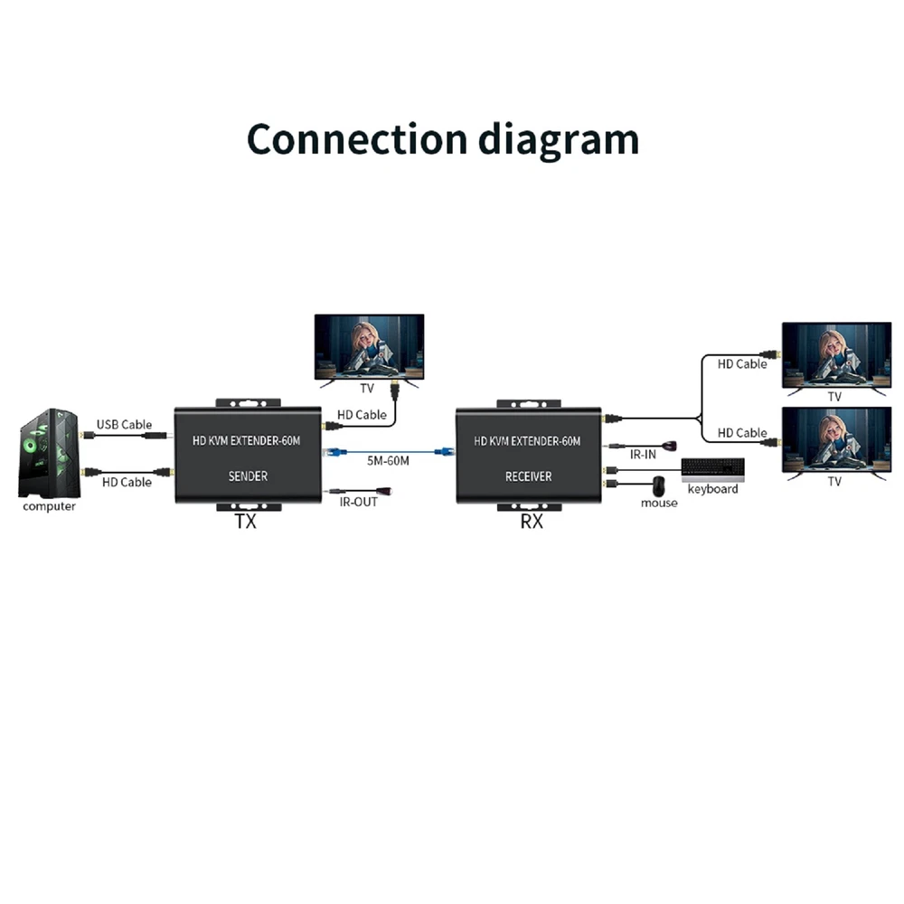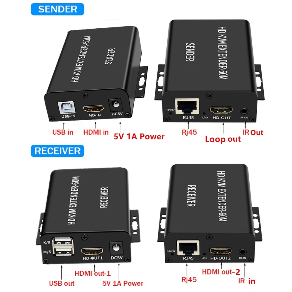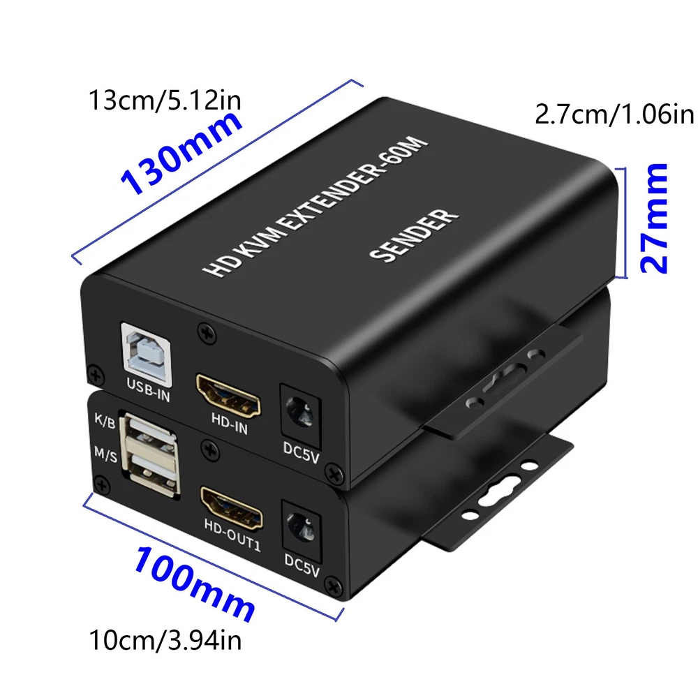 Product Description 1080P 60m USB HDMI KVM Extender with Dual HDMI Out Over Rj45 Ethernet Cable Video Converter Support HDMI Loop Laptop PC Keyboard Mouse Specifications: Maximum single link range: 1920*1080, 1080p Support output video: HDMI Support synchronous transmission of audio and video Mouse/Keyboard Interface: USB DTV/HDTV: 1080p/1080i/720p/576p/480p/576i/480i Transmission distance: Up to 60m(using CAT6 cable) Operating temperature: 0 ~ +70℃ Operating humidity: 10% ~ 85%RH(no condensation) Storage temperature: -10℃ ~ +80℃ Storage humidity: 5% ~ 95%RH(no condensation) External power supply: DC5V 1A Support POE function: Single ended power supply Color: Black Size: 130x100x27mm Features: This Extender has many features that enable it to perform in superior manner: 1. One pair as a full functional module, no need of setting. 2. CAT-5e/6 cable can substitute HDMI cable to achieve long distance transmission. 3. CAT-5e/6 follow the standard of IEEE-568B 4. Transmission distance can be up to 60 meters for 1080p while using CAT6 cable. 5. Support USB Keyboard/mouse extension,more convenient 6. One HDMI output in the sender side. 7. Two channel HDMI output from the receiver,so,in total 3 monitor can be displayed at the same time 8. HDCP1.2 1.2 compatible 9. Plug and play,easy to use Package Content: 1x Sender 1x Receiver 2x Selecteable Power Adapter 1x USB A-B cable 1x User Guide Shipping Returns Contact Us Payment 1. Items sent from US warehouse. 2. Receiving time = Processing time + Shipping time. 3. Pro cessing Time: Around 1-2 business Days. 4. Shipping Time: 3-5 business day. it may have a little delay during some holiday (such as Christmas), any problem, please feel free to contact. 1. 30 days warranty from the purchased date. Please contact us via email before returning the defective item. 2. Our warranty does not extended to any product that are physically damaged or that are not under normal operating conditions as result of misuse or improper installation on the buyer/user's part. 3. Return items should include the original packaging and all accessories. buyers MUST contact us for the returning address. 4. In all cases, buyers pay shipping fees at their own cost to return products for exchange or refund. We will be responsible for the postage of replacements. Refund will be made upon receipt of the returned item. If you have any question, please e-mail us immediately, we will reply you as quickly as possible. We care about our valued customers, and will always try to help you. We accept all verified payment from eBay. Shipping 1. Items sent from US warehouse. 2. Receiving time = Processing time + Shipping time. 3. Pro cessing Time: Around 1-2 business Days. 4. Shipping Time: 3-5 business day. it may have a little delay during some holiday (such as Christmas), any problem, please feel free to contact. Returns 1. 30 days warranty from the purchased date. Please contact us via email before returning the defective item. 2. Our warranty does not extended to any product that are physically damaged or that are not under normal operating conditions as result of misuse or improper installation on the buyer/user's part. 3. Return items should include the original packaging and all accessories. buyers MUST contact us for the returning address. 4. In all cases, buyers pay shipping fees at their own cost to return products for exchange or refund. We will be responsible for the postage of replacements. Refund will be made upon receipt of the returned item. Contact Us If you have any question, please e-mail us immediately, we will reply you as quickly as possible. We care about our valued customers, and will always try to help you. Payment We accept all verified payment from eBay. You may also like 5/16" Line Fuel Filter Replace Part For Mercury For Quicksilver Marine Engine 12.33 USD Housing Case Kit 5-Cell 18650 Replace For DeWalt 20V DCB201/203 Li-Ion Battery 17.63 USD 1.99 USD Wireless Remote Control DC 6V 12V 24V 2CH RF Relay Transmitter 433MHz Universal 15.06 USD New Laser Lens Deck Repair Part For Sony PlayStation 2 PS2 Slim PVR-802W 20.67 USD Gas Fireplace Thermocouple Universal Stove Thermocouple 600mm Grill Fireplace 11.89 USD Hi-Speed USB Port Socket Connector Without Wings For Xbox Series S Console 11.65 USD powered by