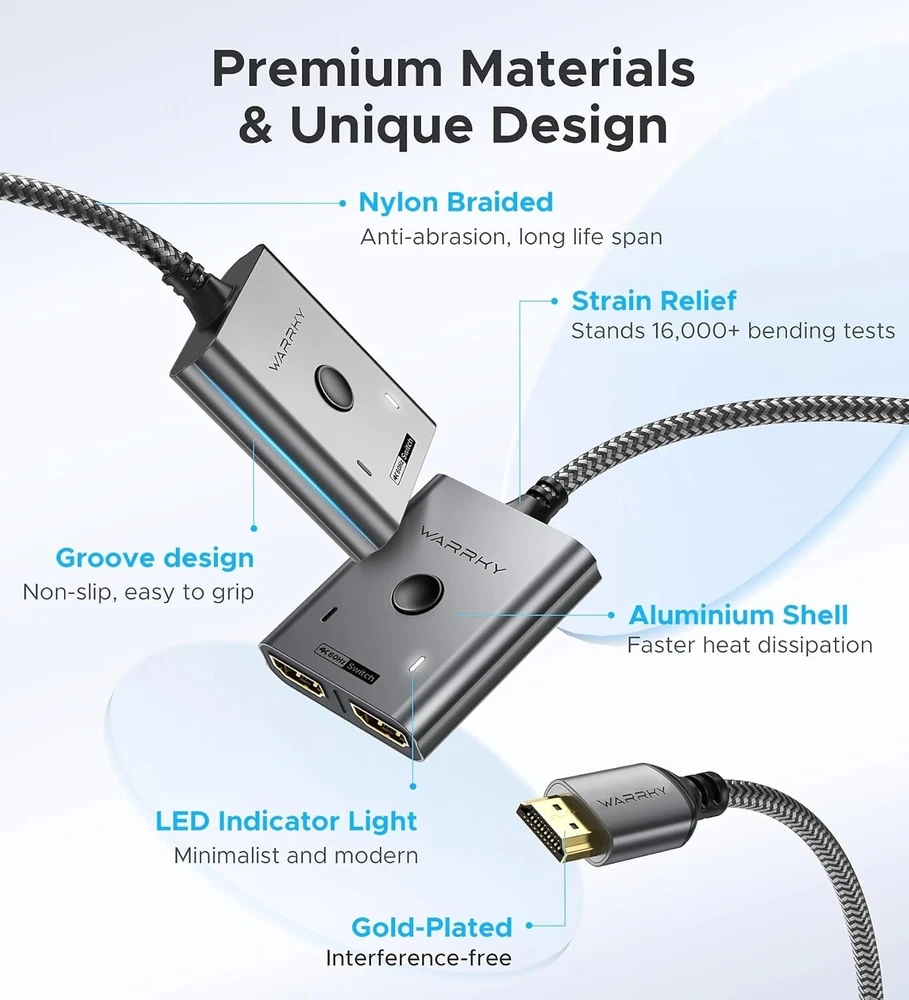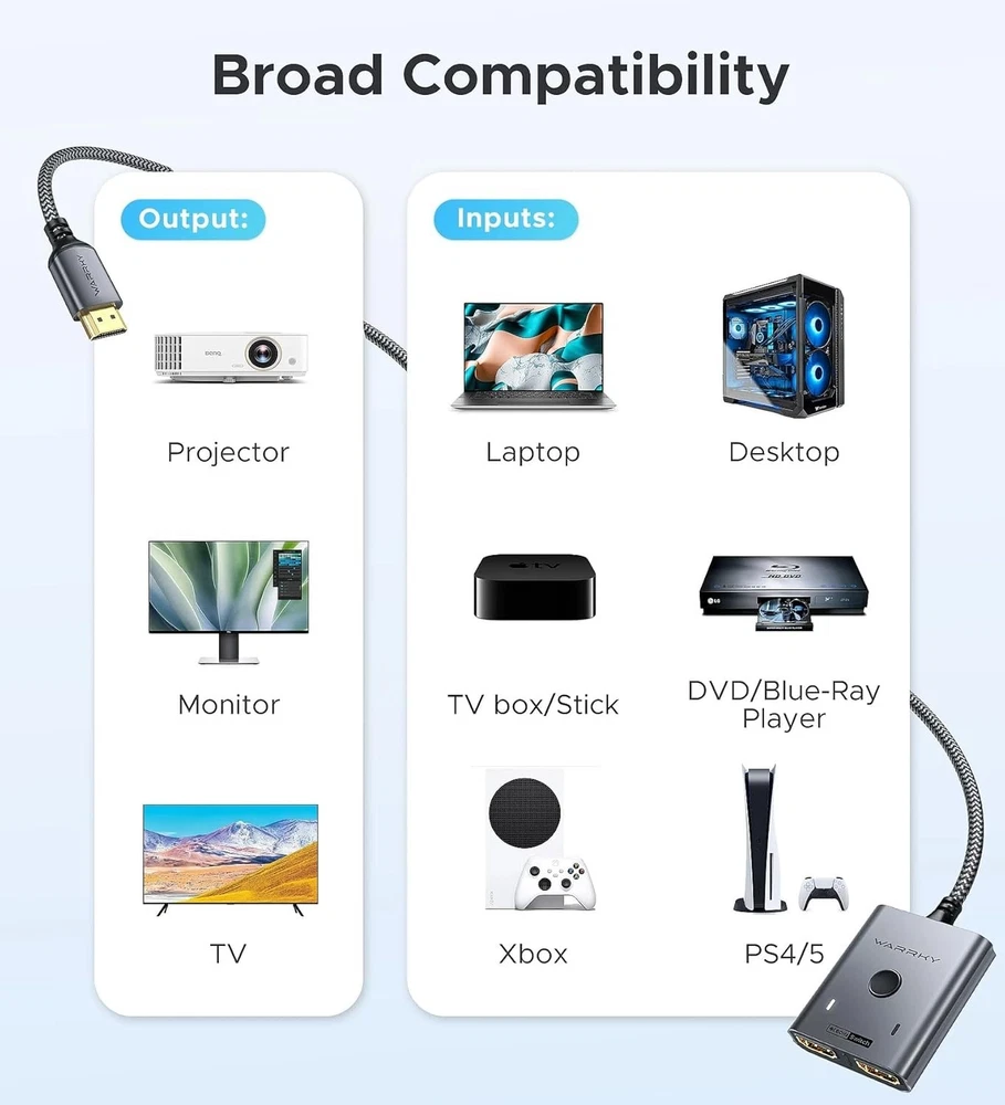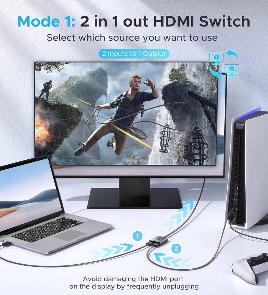 HDMI Switch 2 in 1 Out 4K@60Hz, [with Fixed Braided HDMI Cable, Aluminum Case, 2K@144Hz, HDCP ] Bidirectional 2x1 Switcher Splitter Compatible for PS5/4, Xbox, Roku, FireStick, Switch [Up to 4K 60Hz, Plug&Play] Bidirectional HDMI switch with 2 modes:Mode 1 (Switch sources): Connect HDMI plug into 1 display and HDMI female port to 2 HDMI sources, then switch between sources on single display. Mode 2 (Switch displays): Connect HDMI plug into 1 source and toggle between 2 displays(NOTE: ONLY one of the 2 displays would work at a time). [Unparalleled Video Performance] up to 4K@60Hz, backward compatible with 2K, 1080P. This HDMI Switcher supports 3D, HDR, HDCP Streaming UHD/Blue-Ray content from source unhinderedly. Flawless audio pass-thru for uncompressed digital , or 2 channels(Dolby Atmos/DTS compliant), immerse yourself into home theater experience. [Thoughtful Design] fixed pigtail HDMI cable: Save you an HDMI cable, more cost-effective than other products that require 3 extra HDMI cables. Meanwhile, Fixed solution can effectively avoid display issues caused by loose connections or low-grade third-party cables. Aluminum shell has strong thermal conductivity that effectively improve heat dissipation capacity. Capsule LED indicator light and ultra slim design (Only inches thick). [Flawless Transmission] Industry-leading IC chip provides high bandwidth transmission. Equipped with high-quality AWG26 HDMI standard wire. Gold-plated connector is more resistant from interference than nickel layer. [Universal Compatibility] This 2 in 1 out HDMI switcher is plug&play, compatible for most devices with standard HDMI interface (Not for Arc): PlayStation 3/4/5, Xbox One/Series/360, Nintendo Switch, Roku, Chromecast, Fire Stick, Laptop, etc. Displays: UHD/ FHD/ HD TVs, monitors. projectors, and more. [] is dedicated to introducing superb-quality products that are sophisticatedly designed and reasonably priced for providing the best solutions to connect your work and life. Consult for fast and responsible support within 18hrs!