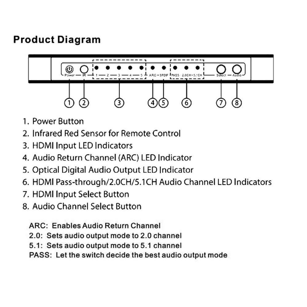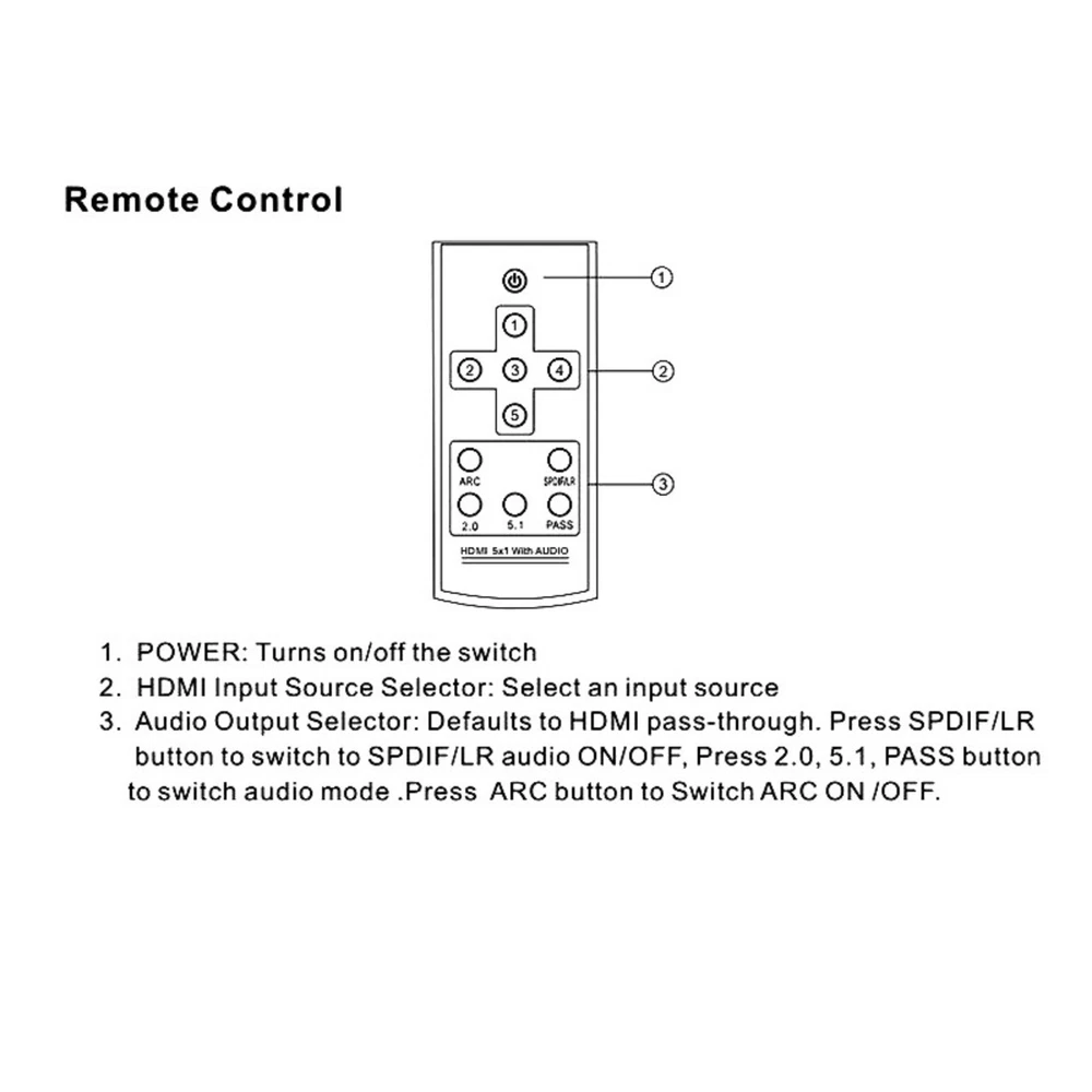 SAFE & SECURE SHOPPING 100% SATISFACTION GUARANTEED FAST SHIPPING HDMI Switch 5 in 1 out Port Switcher w/ Remote Control Power For PS4 PS5 Xbox m Product Description 4K 3D 5x1 HDMI Switch 5 in 1 out Switcher with Audio Extractor ARC for PS4 PS5 Xbox TV Box Laptop PC To TV Monitor Specifications: Video and AudioHDMI resolution: Ultra HD 4K2K max; 3D 1080p/24 max Support video color format: 36-bit Deep Color all channels maximum Audio output: HDMl pass-through up to 7.1CH,Toslink output up to 5.1 ch,RCA L/Routput stereo audio Max bandwidth per channel: 300MHz Max baud rate per display: 9.95Gbps Input/Output TMDS signal: 0.5~1.5v p-p(TTL) Input/Output DDC signal: 5V p-p(TTL) lnput cable distance: <15m 24AWG HDMI high speed Cable at 1080P@24bit 60Hz Output cable distance: <15m 24 AWG HDMI high speed Cable at1080P@24bit 6OHz Environmental Operating Temperature range: 5°F to 131°F/-15°C to 55℃ Operating Humidity range: 5% to 90% RH(No Condensation) Power supply: DC5V1A Features: lnput: HDMI x 5. Output: HDMlx 1,Toslink x 1, Stereo RCAx 1.HDMI version: HDMI 1.4, HDCP1.4. Supports Ultra HD 4Kx2K@30Hz.Supports Full HD. supports 3D. Supports 12-bit Deep Color per channel, maximum 36-bit all channels.Supports 3.0Gbps TMDS/300MHz pixel clock rate per channel, maximumtotal TMDS throughput is 9.95Gbps. supports uncompressed audio such as LPCM. Supports compressed audio such as DTS Digital, Dolby Digital, DTS-HD,and Dolby TrueHD. Supports HDMl pass-through. supports up to 7.1CH digital surround on HDMl output. Supports up to 5.1CH digital surround on HDMl or Toslink output.Supports up to 2.0 channel analog stereo on Stereo output. Supports Standard Audio,DSD Audio, and HD(HBR)Audio.supports ARC(Audio Return Channel). Packaging content: 1x HDMI Switch 5x1& Audio Extractor 1x Power Adapter 1x Remote Control(Not Included 2*AAA Batteries) 1x User Manual Copyright © 2022 Tongtool