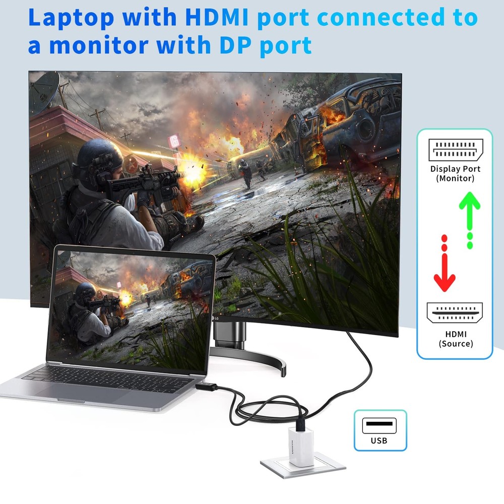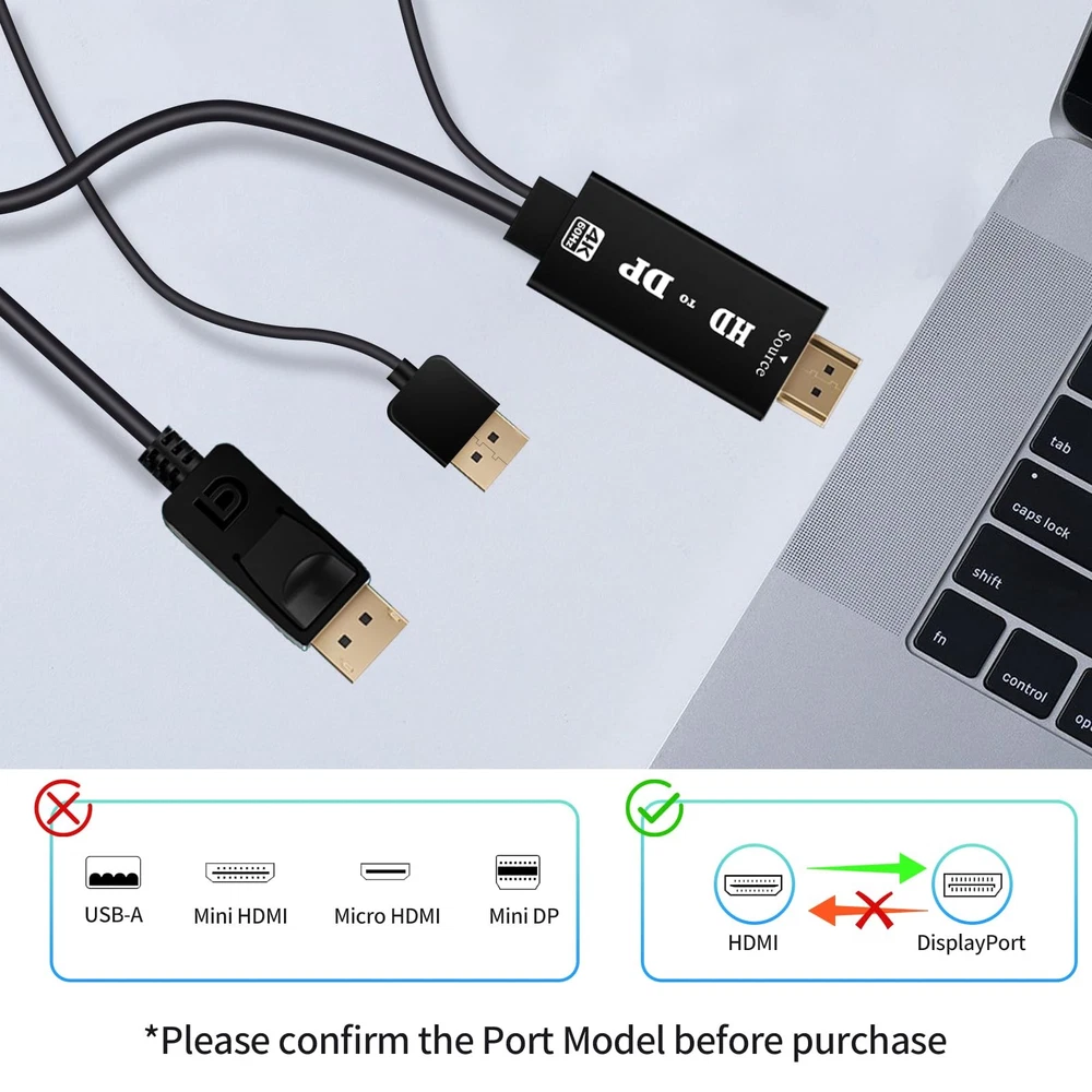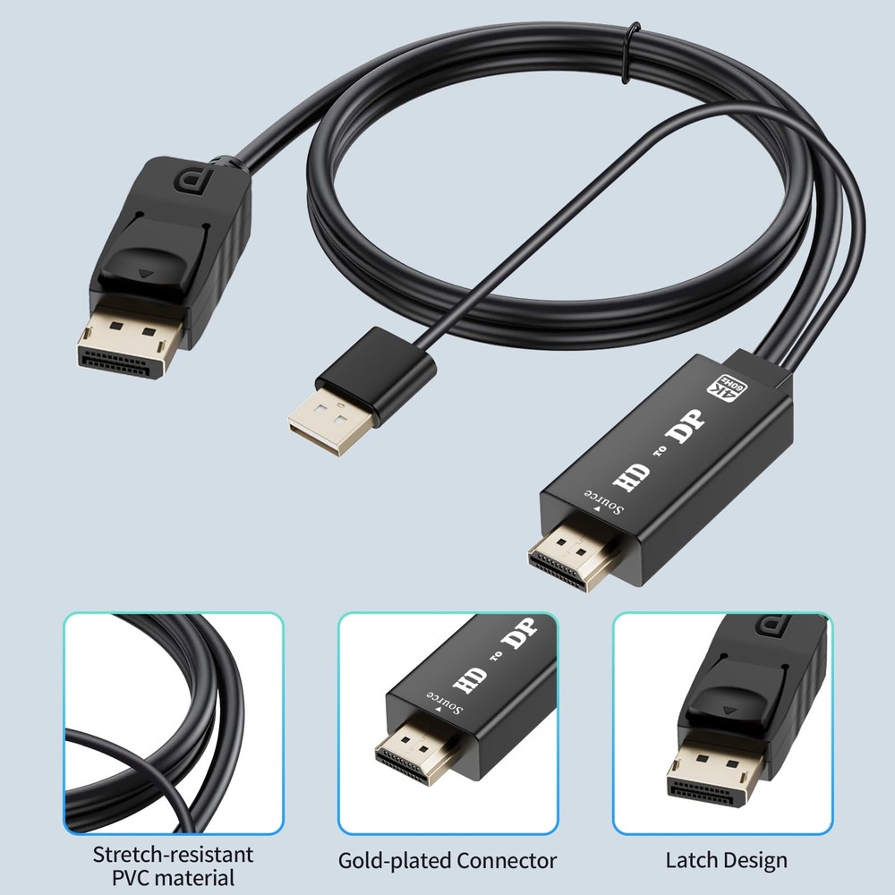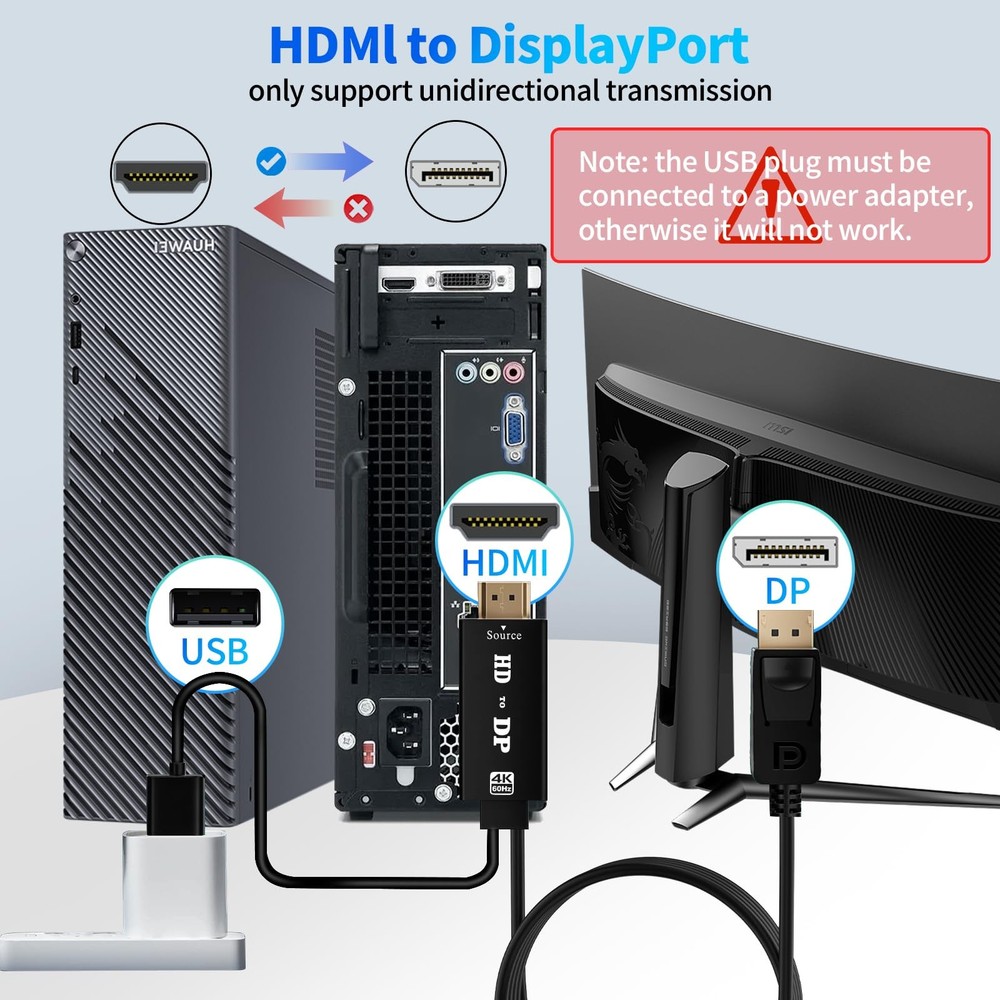 Introducing our high-quality HDMI to DisplayPort cable is the perfect solution for connecting your devices to DisplayPort displays. This versatile cable supports 4K60Hz resolution, delivering stunning visuals with exceptional clarity and detail. With a length of 6 feet, it provides ample flexibility to connect your devices without any hassle. Whether you need to connect your gaming console, laptop, or Blu-ray player to a DisplayPort monitor, our HDMI to DisplayPort cable is the ideal choice. Thanks to its durable construction and reliable transmission, it's easy to use and ensures a seamless and reliable connection. Upgrade your viewing experience and enjoy superior audio and video quality with our HDMI to DisplayPort cable. 【Quality Assurance】High-quality HDMI to DisplayPort cable for seamless connectivity between HDMI devices and DisplayPort monitors without compromising on signal quality. 【Resolution and Size】This 6-foot HDMI to DisplayPort adapter cable supports 4K60 Hz resolution, a USB-powered design eliminates the need for external power sources, making it convenient for on-the-go usage. 【Plug & Play】No drivers or software are required after plugging in the HDMI to DP cable, After inserting the HDMI to DP cable. (Plug in HDMI out on the source device, and DP input on a display device; select the corresponding DP input on the display) 【Wide Compatibility】Unidirectional HDMI source to DisplayPort monitor cable for easy and hassle-free connection between devices, like pc, laptops, computer, desktop, ultrabook, notebook, PS3, PS4 Pro, PS5, Xbox One, Xbox 360, Set Top Box, TV BOX. 【caveat】This HDMI to Displayport cable won't accept 2nd conversion, Unidirectional HDMI Source to Display Port Monitor Cable, The USB plug is for power only.