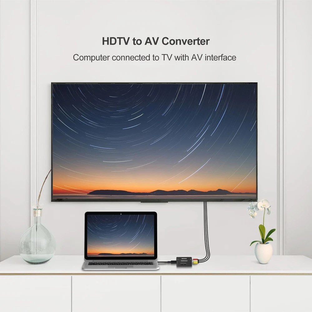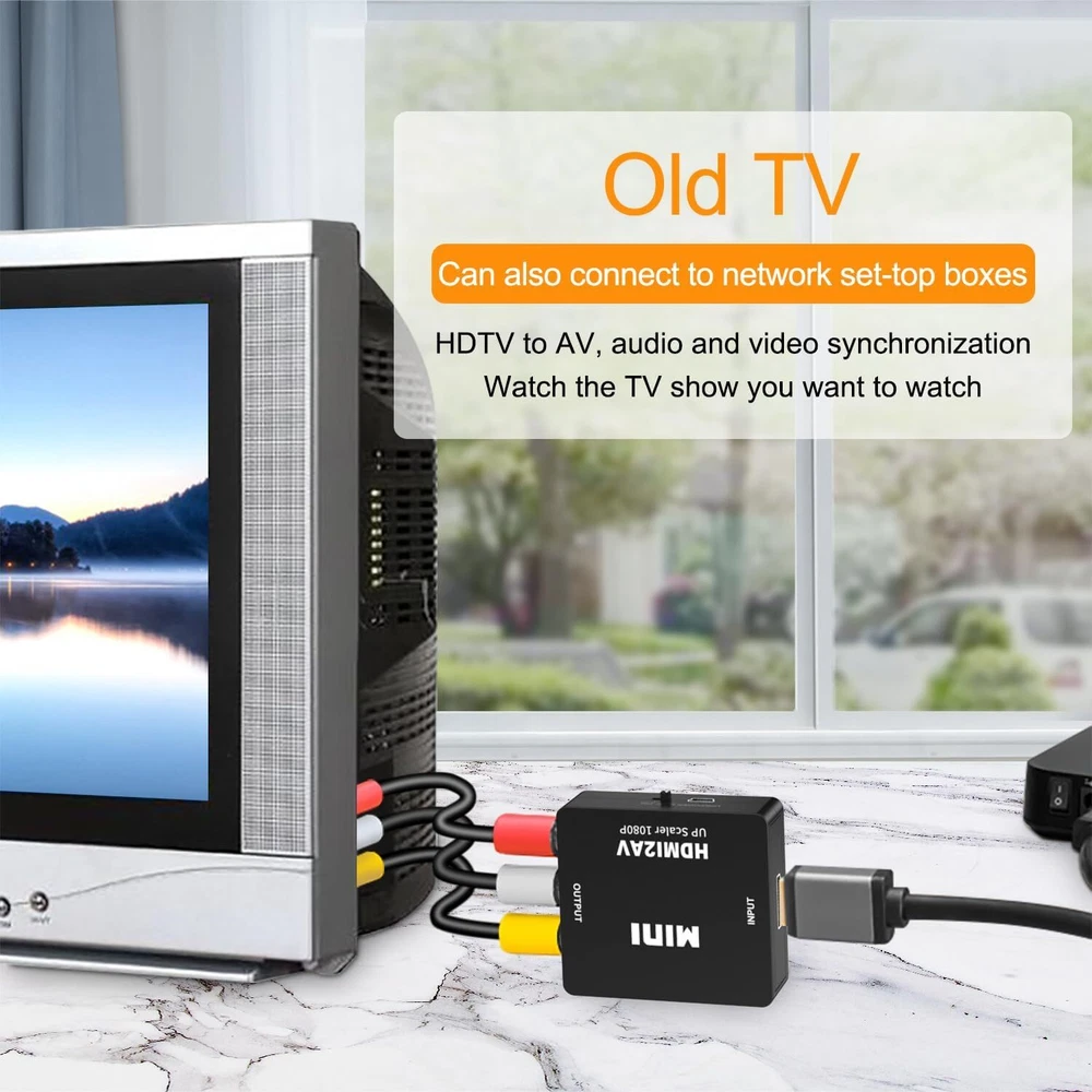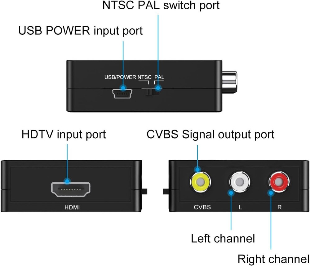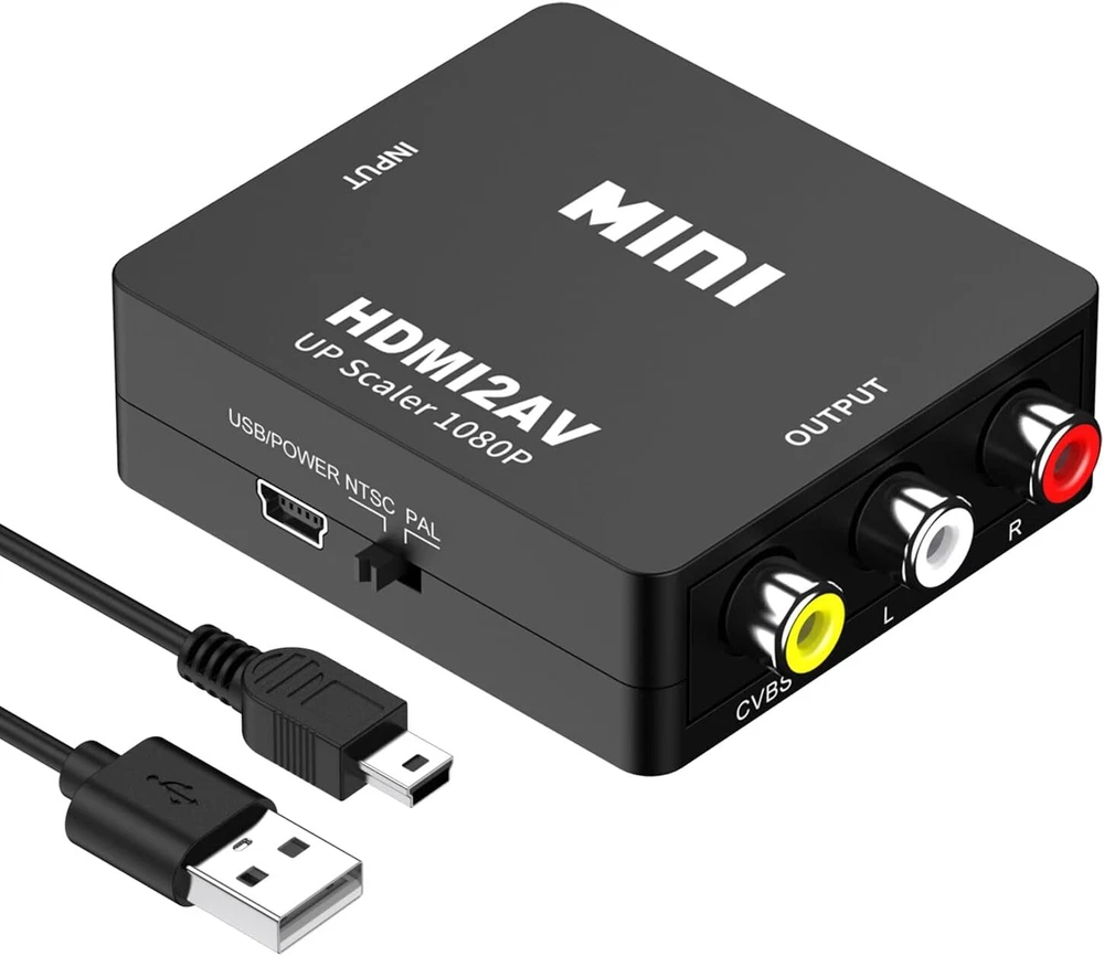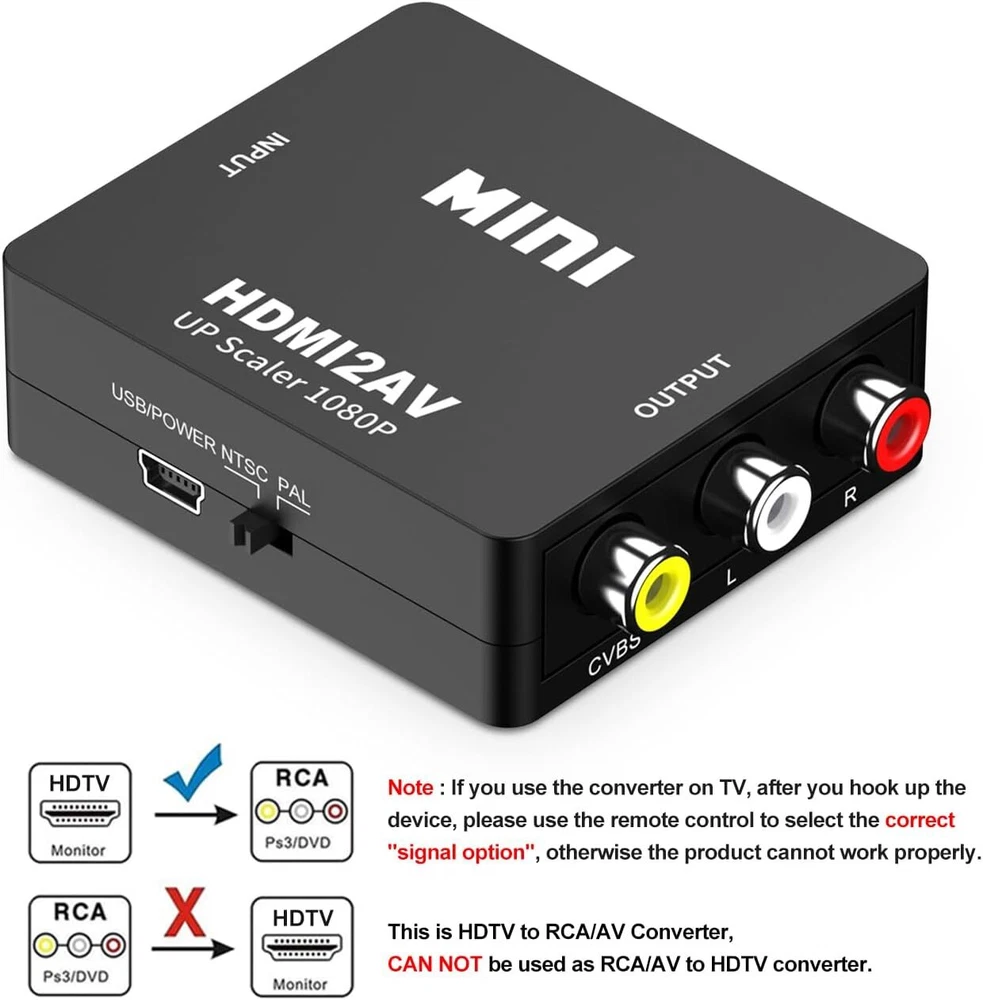 Features: 1. Converts HDMI signal into standard definition via composite (yellow/red/white). For use with older TVs that have yellow/red/white inputs but not HDMI. 2. Installs in minutes and is fully-compatible with video sources that have HDMI outputs. 3. If you are connecting a HDMI stick to an older TV with a 4:3 (square) aspect ratio using this converter, we recommend setting the stick to 4:3 in the settings menu. If you do not see the 4:3 option in your streaming stick, please contact us for instructions on how to edit the settings. 4. This converter does NOT support 4k HDMI signal input. If you are using some latest source devices with HDMI 4K output, you MUST change the output resolution of your device to 1920*1080P or other lower resolution output. Otherwise, this converter will not work for you. 5. Please make sure the PAL/NTSC switch on the converter is set to correct position. If you are in the United Kingdom, please set it to PAL. Item Specifications: -Size: 60 x 55 x 20mm -Weight: 40g -Input ports: HDMI -Output ports: AV(RCA, yellow, white, red) -Output Video Systems: PAL / NTSC -Input HDMI Resolution: 480p(60Hz), 720p(50Hz/60Hz), 1080i(50Hz/60Hz), 1080p(50Hz/60Hz) -Output Resolution: standard analog composite 480i/576i Package Content: 1 x HDMI to AV Adapter 1 x USB Charge Cable 1 x User Manual Note: 1. This converter does NOT support 3D. 2. This converter transfer HDMI signal to CVBS/AV, does NOT transfer CVBS/AV to HDMI. 3. This converter does NOT support 4k HDMI signal input. If you are using some latest devices with HDMI 4K output(such as PS4 Pro, Xbox One S, Roku ultra, Roku Streaming Stick+, Roku Premiere+, Amazon All-new Fire TV, etc), you MUST change the output resolution of your signal device to 1920*1080P or other lower resolution output. 4. Please make sure the PAL/NTSC switch on the converter is set to correct position. If you are in the United States,please set to NTSC. 5. There is a slight fever when using this converter, this is a normal situation, please do not worry. Buyer Note: If you are satisfied with our service, we appreciate you leaving us a positive feedback and 5 star rating review! Your opinion is important to the success of our business. If you are not satisfied with the product or have not received the product for more than 35 days, please contact us to resolve, we will do our best to solve. We are sure to come up with a satisfactory solution. Please contact us first before leaving cold feedback or good feedback of 1-3 stars and opening the case. We'll do our best to solve your problem. Because we believe that everything can be solved through communication. Thank you very much!