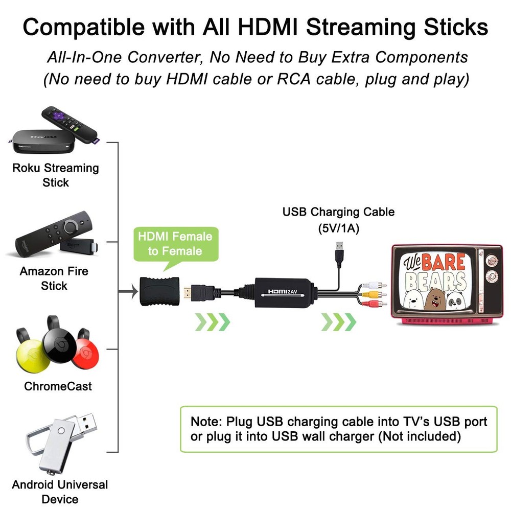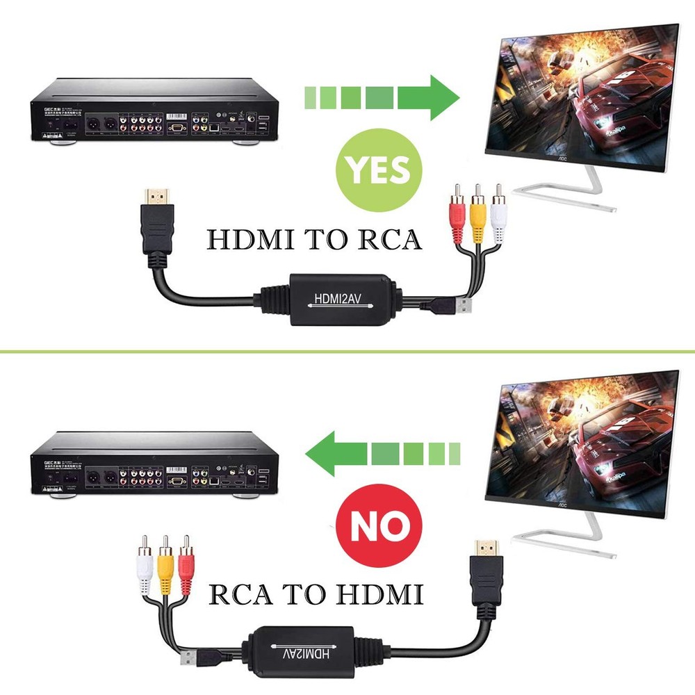 HDMI to RCA Converter Cable All in one HDMI to RCA Cable Converter. An bulit in HDMI to RCA chip, convert HDMI signal to RCA device. It converts quality HDMI video signal to 3RCA composite video cvbs(standard-definition 480i,576i),for devices such as TV, VHS VCR, DVD recorders,etc, that support NTSC and PAL.Video signal transfer only, can't improve the video quality, please import HD video. Specifications -Input ports: 1xHDMI -Output ports: 1xRCA (Yellow,White,Red) -Product Cable Length: 185cm (6.1ft) -Color: Black Widely Compatible Good for personal or family: Connect Roku, DVD, cable boxes, and PS3, Xbox 360, Blu-ray machines and so on. Can be watched by the common old TV AV interface after converted. Important conferencing systems, can be used for display platform: After converted the HD HDMI signal of the HD camera by the converter then through the acquisition card to a computer system to facilitate remote meetings transmission. HDMI Input Resolution: -640x480@60HZ,800X600@60HZ -1024x768@60HZ,1280X720@60HZ -1280x1024@60HZ,1360x768@60HZ -1600x1200@60HZ,1920x1080@60HZ -480i/60Hz,480p/60HZ,576i/60HZ,576p/60HZ -720p 50/60HZ,1080i 50/60HZ,1080p 50/60HZ Package content: 1 x HDMI to RCA Converter Cable 1 x HDMI Female to HDMI Female Couple 1 x User Manual NOTE: 1) Please do connect the power cable with 5V power first to make the unit work before connecting to other ports 2) Video signal transferring only, no improvement of video quality HDMI to RCA Converter: All in one, Combine the HDMI cable and RCA cable with HDMI to RCA chipset Converter. It will convert HDMI signal (Amazon Fire Stick, Roku, STB, Blu-ray DVD, PS3, PS4 etc) to RCA analog signal for AV device( such as RCA inputold TV). Please Note: This HDMI to RCA Converter need to be powered up by 5V/1A USB power supply through the USB power port. An Bulit-in chipset HDMI to AV Converter: Compatible to HDMI 1.3, Support HDMI input from 480i to 1080P. Output the audio synchronization with the video. Note: Does NOT support 3D. Play new HDMI devices to older TVs/ Displays - Unlike other HDMI to RCA cables, this one features an built in chipset converter - Saves you money by eliminating the need for extra components. Work with All HDMI and RCA Devices: Connect HDMI plug into any device with HDMI output such as Amazon Fire Stick/ Roku/ PlayStation 4/ XBOX/ PS4/ PS3/ PC/ TV Box/ Projector. Then connect the RCA end into any display with RCA inputs such as Monitor/ TV/ HDTV/ TV Box/ Projector and more. And power up the HDMI to RCA Converter with 5V/1A USB power supply through the USB power port. No Extra Purchases Necessary: No need extra fee to buy HDMI Cable or RCA Cable, Convenient all-in-one cable is equipped with HDMI to RCA chipset, So you save money and avoid dealing with multiple components. What You Get: 1x HDMI to RCA Converter Cable, 1 x HDMI Female Coupler, User Manual. ensures long-time satisfaction of your purchase; Friendly and easy-to-reach customer service to solve your problems timely. If you have any problems, Please contact us we will slove immediately in 24 hours