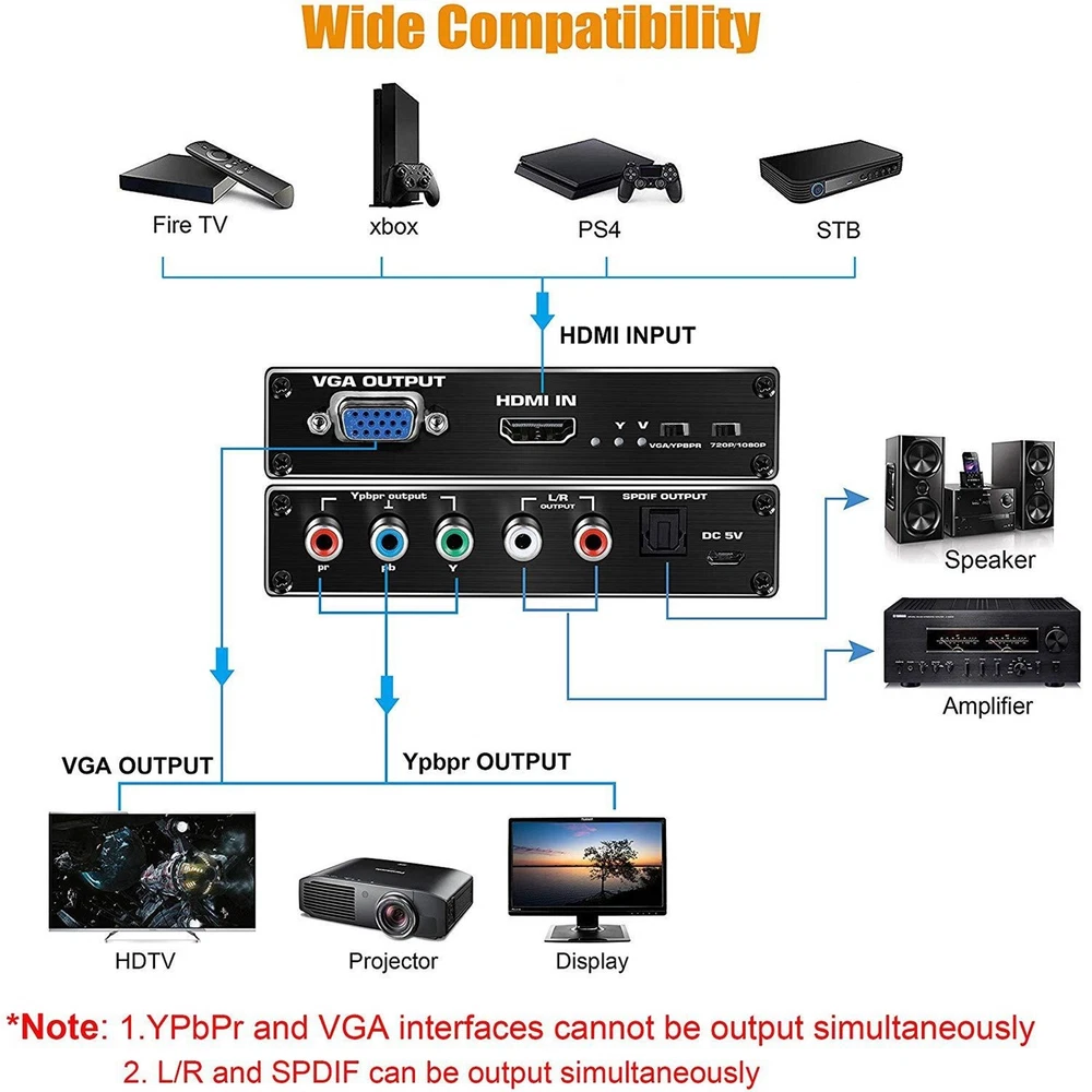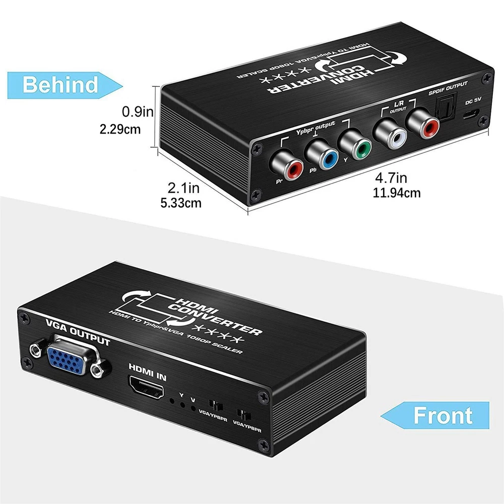Product Description HDMI To RGB Converter 1080P HDMI To Component Ypbpr Converter With VGA Out HDMI To Ybprp Converter Specifications: Input video signal: 0.5~1.5Volts p-p Input DDC signal input: 5Volts p-p (TTL) VGA or color difference output: supports up to UXGA format, 1080I (60Hz) Audio output: Left and right channels or fiber optic output Maximum transmission bandwidth: 5.1Gbps Maximum working current: 600mA Power supply: DC5V/1A Performance: 1. Support video input: HDMI 1.2a, video output 1080P without signal loss, transmission distance 30-45 meters 2. Support audio output: SPDIF (Optical)+R/L analog, input support: up to UXGA format and 1080I (50/60 Hz) 3. LED indicator light, when the signal source or signal terminal is in working state, the corresponding indicator light will turn on Feature: 1. Compatible with most HDMI connected devices: HDMI (input) to YPbPr (output) 1080p scaler compatible with for Nintendo Switch/ for Laptop/ for PS4/ for PS3/ for Roku/ for Amazon Fire TV/ for Blu Ray DVD/ HD projector/ for Xbox 360/ for DVB receiver/game console, etc. It also supports signals from DVI-HDMI cables or adapters (not Included) 2. Maximum support for 1080P: supports 1080P/1080i/720P/576P/480P, HDMI input: supports 1080p/720P/720i resolution for Ypbpr VGA output It does not support 4K (Note: It is not possible to output analog YPbPr and VGA videos simultaneously.) 3. Plug and play Product List: 1* HDMI To RGB Converter 1* Power cable 1* DC5V Power adapter 1* User manual Note: Not supported YCbCr Shipping Returns Contact Us Payment 1. Items sent from US warehouse. 2. Receiving time = Processing time + Shipping time. 3. Processing Time: Around 1-2 business Days. 4. Shipping Time: 3-5 business day. It may have a little delay during some holiday (such as Christmas), any problem, please feel free to contact. Always believe we can figure things out with communication, if it comes to return, the pacakge must be intact and the same as you receive. If you have any questions, please feel free to email our service specialists 24 Hours a Day, 7 Days a Week. We will reply you ASAP. Return/refund is accepted within 30 days after the buyer receives the item. NO exchange will be accepted after 30 days from the date when the item is received. Please contact us first before returning your product!!! If you have any questions, our Customer Service staffs welcome you to email us. We strive to answer all questions and resolve any problems as quickly as possible. We care about our valued customers, and will always try to help you. So if you have any problems, You can contact us 7*24, we will reply at the first time. We accept all verified payments from ebay. Orders will be shipped after receiving cleared payment. Shipping 1. Items sent from US warehouse. 2. Receiving time = Processing time + Shipping time. 3. Processing Time: Around 1-2 business Days. 4. Shipping Time: 3-5 business day. It may have a little delay during some holiday (such as Christmas), any problem, please feel free to contact. Returns Always believe we can figure things out with communication, if it comes to return, the pacakge must be intact and the same as you receive. If you have any questions, please feel free to email our service specialists 24 Hours a Day, 7 Days a Week. We will reply you ASAP. Return/refund is accepted within 30 days after the buyer receives the item. NO exchange will be accepted after 30 days from the date when the item is received. Please contact us first before returning your product!!! Contact Us If you have any questions, our Customer Service staffs welcome you to email us. We strive to answer all questions and resolve any problems as quickly as possible. We care about our valued customers, and will always try to help you. So if you have any problems, You can contact us 7*24, we will reply at the first time. Payment We accept all verified payments from ebay. Orders will be shipped after receiving cleared payment. Backlit Handheld Microphone For QYT KT-8900 KT-UV980 KT-7900D KT-780plus Radio 22.99 USD New Power Wheels Adapter Component For AEG/For RIDGID 18V Lithium Battery 19.99 USD 5x 5/32" Diamond Chainsaw Sharpening Rotary Bit Burr Stone File for Craftsman A 11.39 USD Alloy Vintage Teisco Tune O Matic Electric Guitar Fixed Bridge Tailpiece Parts 19.99 USD 1/100 Eagle F-15 U.S Air Force Fighter Diecast Aircraft Plane Model Scene Gift 27.99 USD 14Pack Replace Snap Presser Feet For VIKING HUSQVARNA Sewing Machines 335 330 13.29 USD 1/72 F-22 Fighter Bomber Aircraft Diecast Fighting Jet Model Military Collection 21.99 USD 1/100 A380 Lufthansa Civil Airliner Paper Plane Model Aircraft Unassembled Kit 18.19 USD Drill Bit Carbide Rotary File Metal Milling Grinding Cutter Tool Part AX1625M06 16.39 USD DC 10-55V 12V 24V 48V 60A PWM DC Motor Speed Controller CW CCW Reversible Switch 22.69 USD USB Rosin Atomizer Rosin Flux Pen PCB Short Circuit Detector No Need Soldering 19.99 USD 19.99 USD Remote Controller Part For LG 60LB7100UT 65LB6300UE 65LB7100UB Accessories 20.69 USD 1Pc Replacement Bearing Housing For Stihl FS38 FS45 Trimmer Parts 4144-640-59 16.39 USD 12V Car Home Audio Mini Stereo Amplifier 2.1 Channel HiFi Bass Speaker Power Amp 23.99 USD 7" Steel Guitar Fret Wire End Cutter Nipper Puller Plier String Luthier Tool 19.99 USD 21pcs Steel Polymer Clay Cutters Set DIY Earring Jewellery Cutting Mold Tool 8.99 USD Muscle Signal Sensor EMG Detector Measuring Module for Arduino Controller 26.99 USD High Quality Acrylic Protective Case With Heat Cooling Fan for Raspberry Pi 5 14.99 USD Dual RJ11 Ports USB 56K External Dial Up Voice Fax Data Modem For Win 7/8/10 29.69 USD 4K 1080P 1x2 HDMI Splitter Screen Repeater Video Distributor Monitor Duplicator 8.99 USD 10PCS Acrylic Aquarium Glass Cover Bracket Holder Fish Tank Lid Clips Bracket 11.99 USD 19.99 USD New 8" Air Filter For Onan 140-2628 140-1496 140-1228 NHA T26 16 - 18 HP Engine 15.69 USD 1/300 20cm Hawaii B777 Plane Model Alloy Diecast Airplane Aircraft Co