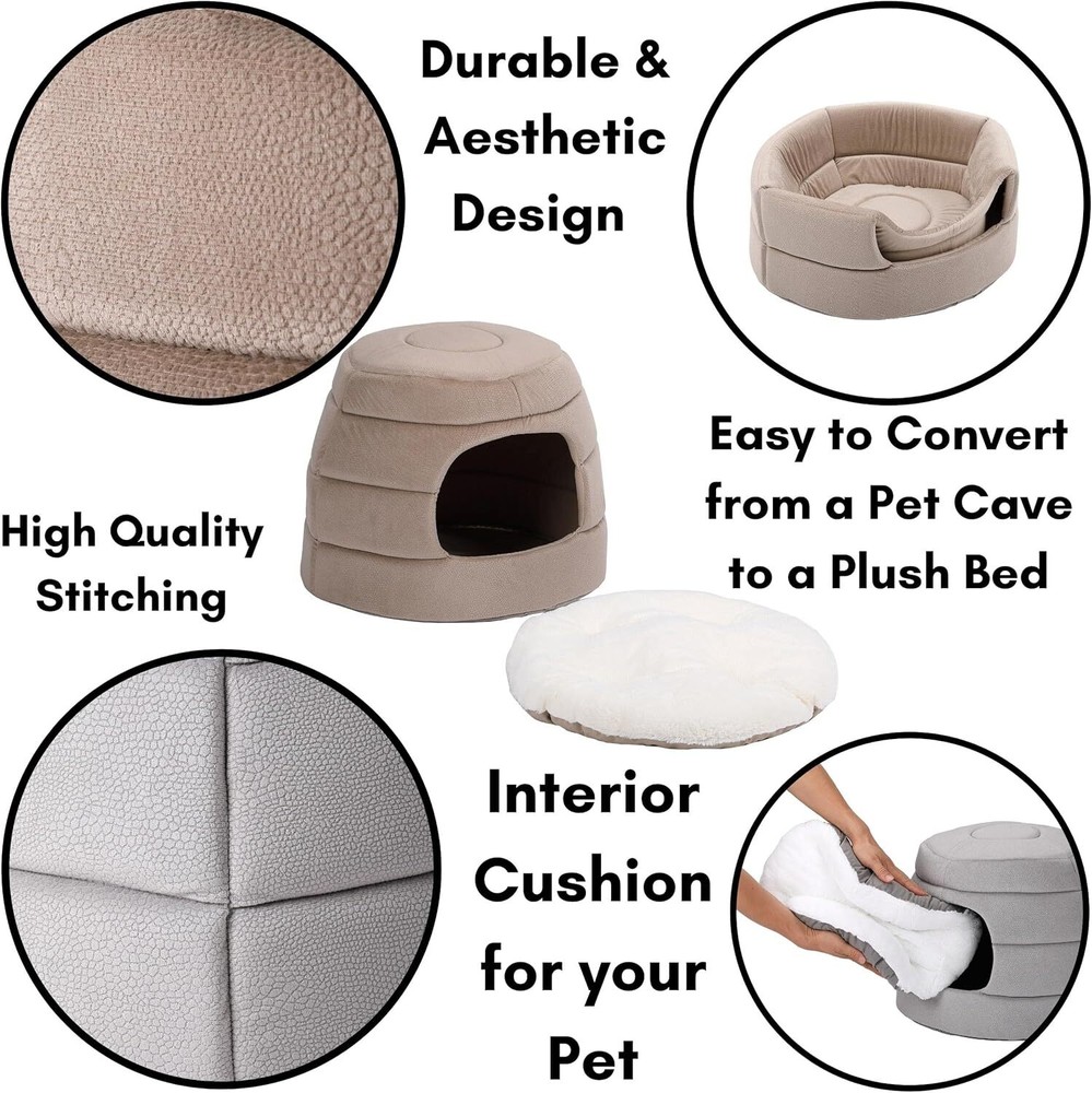 Product Description COMFY & COZY: designed with super soft polyester fabric allowing your feline or pup to sleep in ultimate comfort MULTI-FUNCTIONAL PET BED or CAVE: 2-in-1 foldable design can be used as a cozy, pop up cave or flattened into a bed with plush insert DURABLE BED: every part of the 2-in-1 pet bed is made with high-quality materials and stitched by experts to ensure your furry friend will rest in comfort for years to come KEEPS IT SHAPE: high elasticity foam allows the pet cave to keep its shape after continuous use as a pet bed FITS CATS or SMALL DOGS UP 12 LBS. COLOR: Beige DIMENSIONS: CAVE: 15” Width x 15” Length x 13" Height. BED: 15” Width x 15” Length x 6" Height. Weight 1.3 lbs. FITS CATS or SMALL DOGS UP TO 12 lbs. Pet Bed Pet Bed or Cove The H&E Pet Bed or Cove is designed with super soft polyester fabric allowing your feline or pup to sleep in ultimate comfort. This cove has a 2-in-1 foldable design, which can be used as a cozy, pop up cave or flattened into a bed with plush insert. This pet bed is made with high-quality materials and stitched by experts to ensure your furry friend will rest in comfort for years to come. The high elasticity foam allows the pet cave to keep its shape after continuous use as a pet bed. This bed is perfect for small cats or dogs and comes in both a small and medium size. Keep Your Pet Comfortable & Happy Comfy & Cozy Designed with super soft polyester fabric, which provides ultimate comfort for your small pets. Durable Made with high-quality materials and stitched by experts to ensure your furry friend will rest in comfort for years to come. Keeps Shape The high elasticity foam allows the pet cave to keep its shape after continuous use as a pet bed. Multi-Functional 2-in-1 foldable design can be used as a cozy, pop up cave or flattened into a bed with plush insert.
