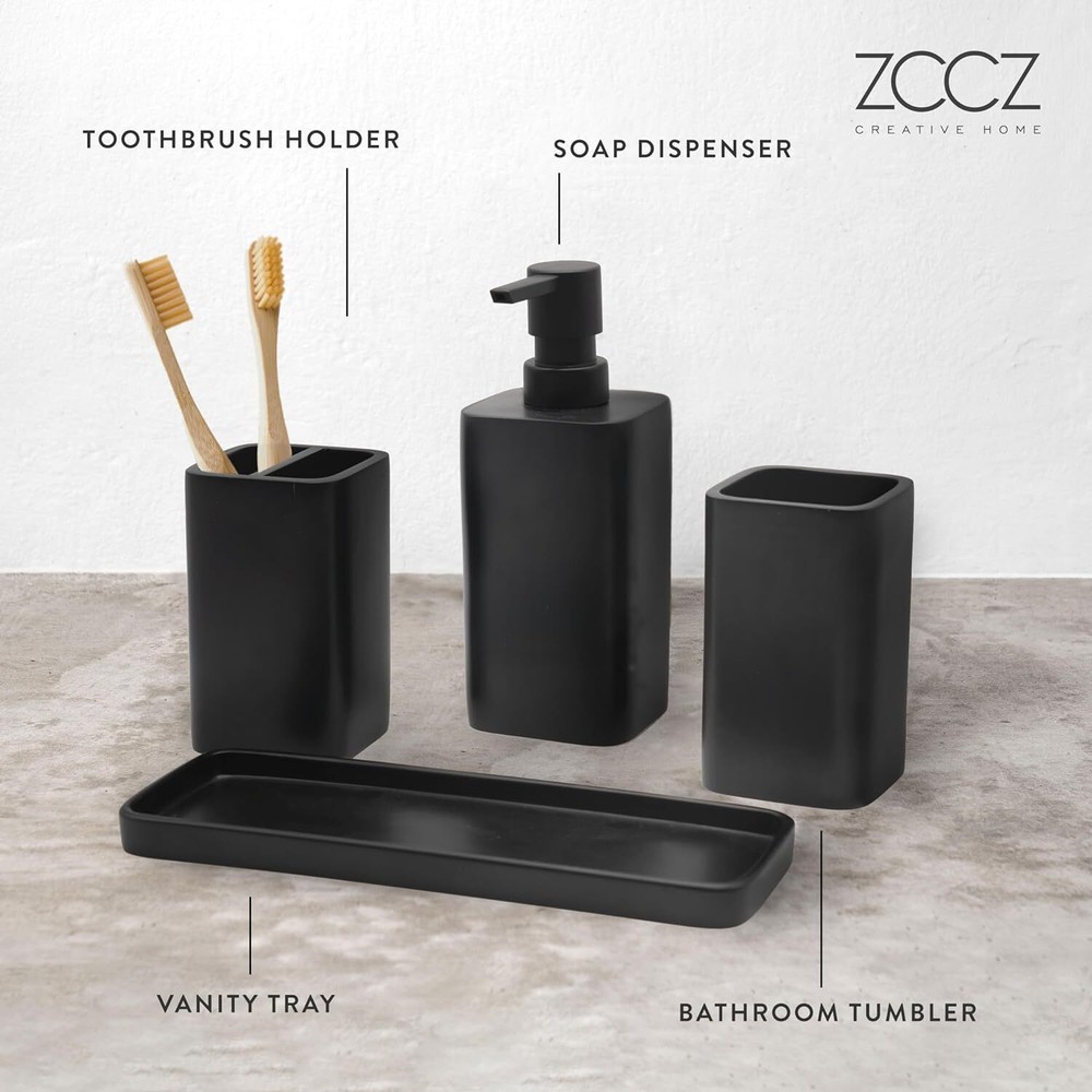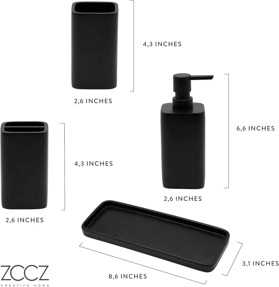 Polyresin 4-piece Bathroom Accessories Set: Include a lotion soap dispenser, a toothbrush holder, a bathroom vanity tray and a bathroom tumbler. Allow you to hold and organize a lot of bathroom stuff with easy. Black Matte Bath Accessories Set: Very pretty and stylish, adding a nice clean touch and complement your bathroom, vanity decor. Premium Polyresin: Made of nice resin, has a nice weight, not to tip over; compared to porcelain or glass, it won¡¯t break easily. And it will not leave any marks on your countertop, easy to clean. Versatile Bathroom Accessories: Use all the items together in your bathroom, dresses up your room nicely. Or use them individual, the soap dispenser can be used in the kitchen, bathroom; the tumbler for your makeup brushes, pens; the toothbrush holder for beauty tools, razor; and the vanity tray for your glasses, watch, loose jewelry and more. What is Include: 1 x Bathroom Accessory Sets(4-pieces); 45-day money back guarantee, worry-free 24-month warranty, and friendly customer service by.