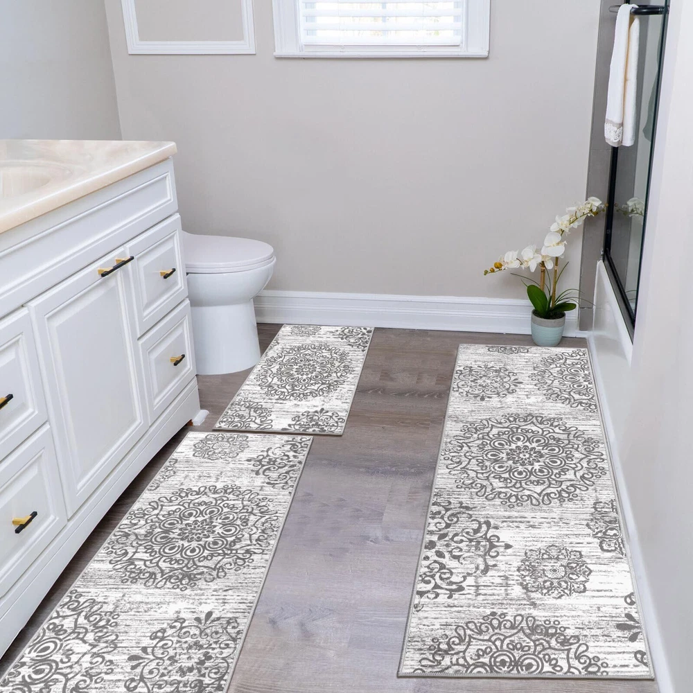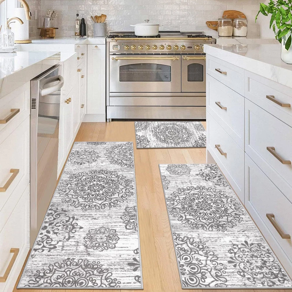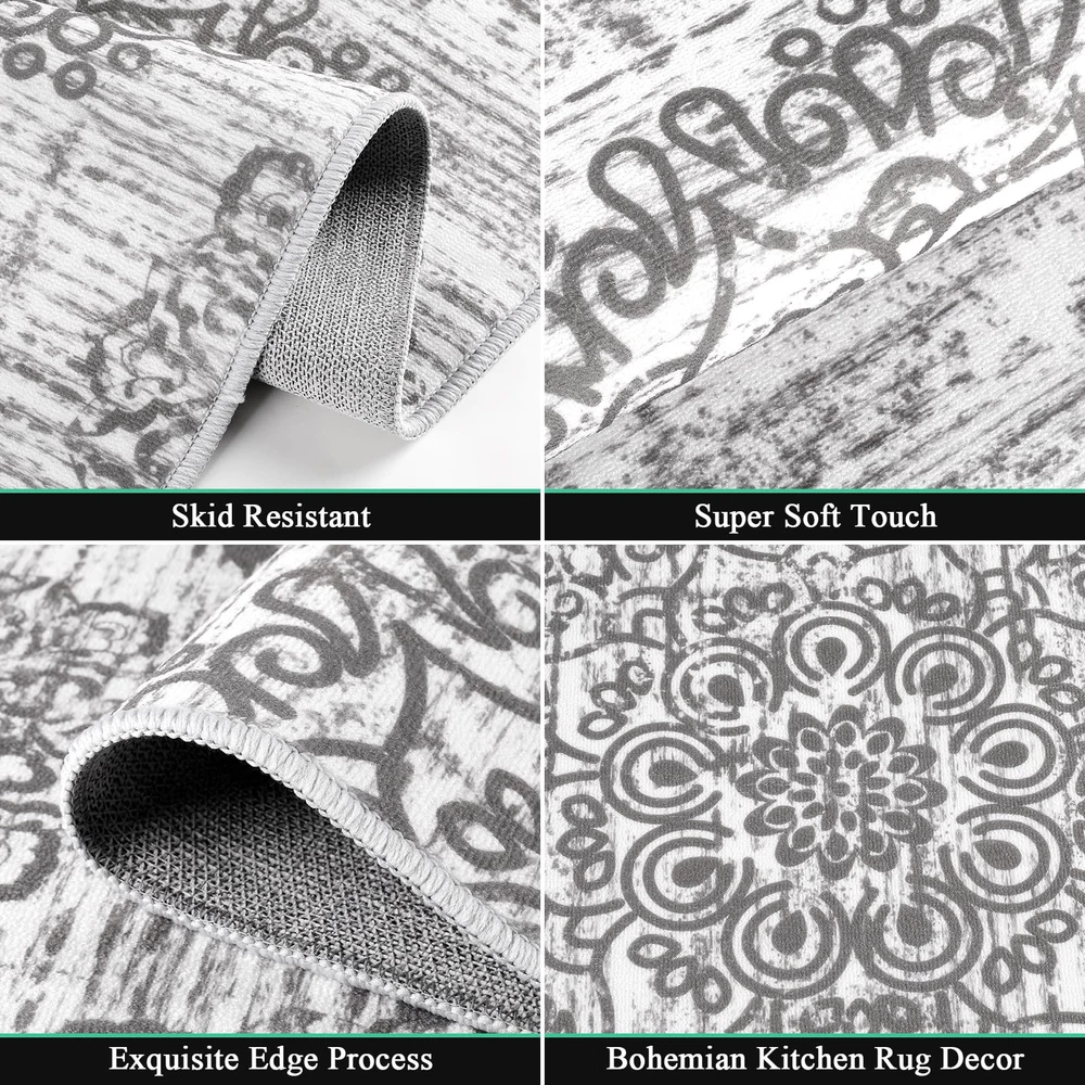 Farmhouse Kitchen Rugs Sets 3 Piece with Runner: HEBE boho kitchen rugs set include 3 piece kitchen mats for floor, which measures 20"x32"+20"x48"+20"x59",perfect size for your kitchen floor, also suitable as entryway rug, laundry room rug, bathroom mat Non Slip Kitchen Rug and Mat Sets: Boho kitchen floor mat set is made of 0.2" high-quality polyester and come with premium TPR & cotton non skid backing,can be effective to avoid slipping and scratching the floor, keep your home clean and dry Washable Kitchen Rugs Set: Our washable rug can be routinely cleaned with a regular vacuum cleaner or machine washable for a deep clean.The farmhouse area rugs for kitchen has been tested for many machine washes, will not fade, will not deform Durable kitchen Rugs and Runners: Our kitchen area rug is made of premium polyester fabric, which is very durable. Design with retro floral elements,Classic printing and dyeing process, non-fading and non-shrink, protect your kitchen floor dry and clean Widely Used Boho Kitchen Carpet: The kitchen mat widely used as kitchen sink rug, laundry room rug runner, indoor door mat and bathroom rugs; also can be great gift for your families and friends in Christmas, Thanksgiving, Halloween and New Years