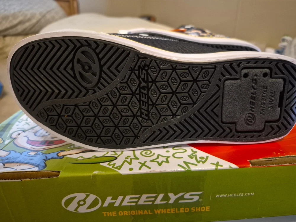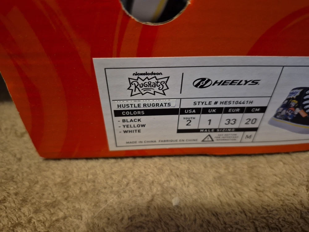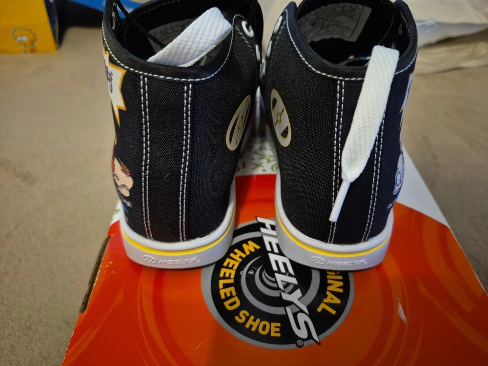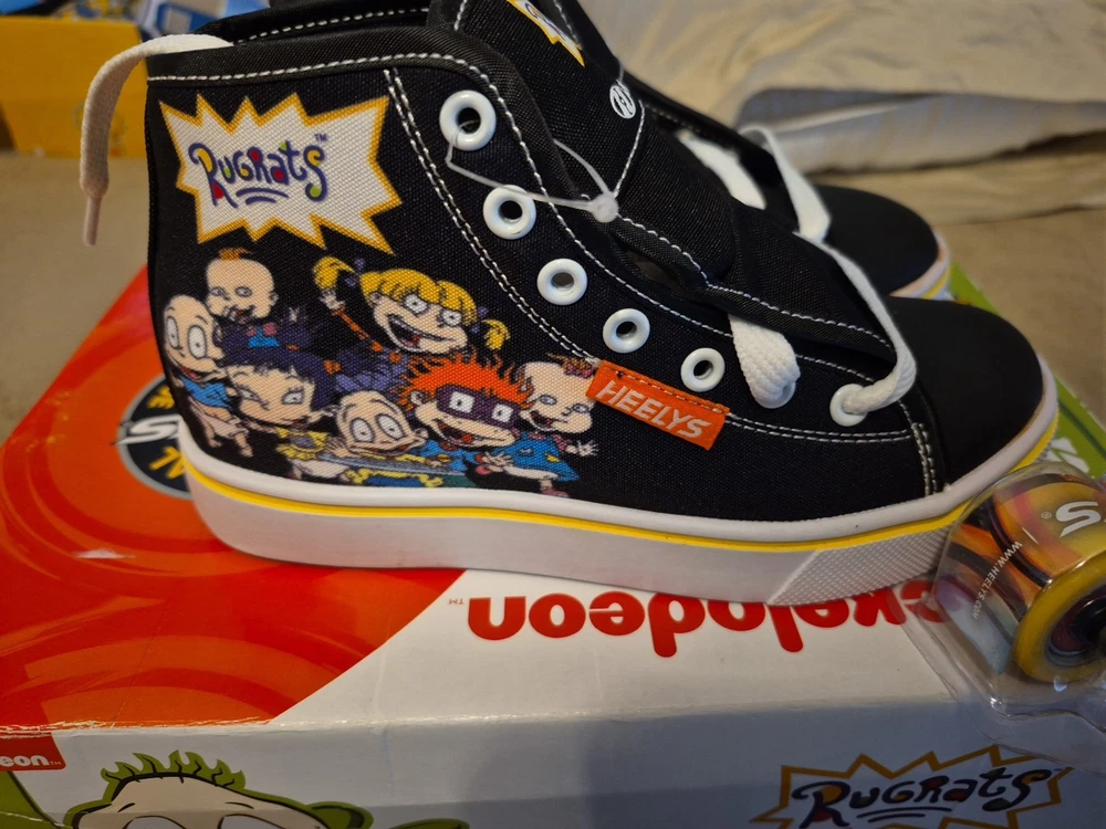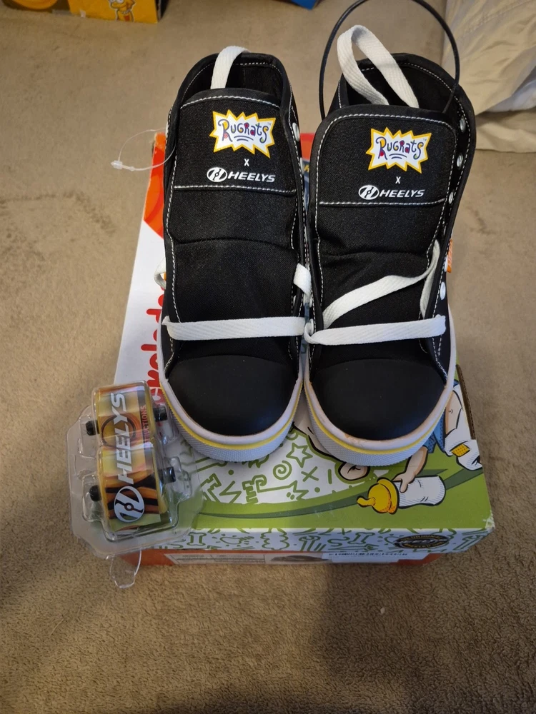 The product is a pair of Heelys in youth size 2 designed for unisex kids. These black, white, and purple sneakers feature wheels in the sole that allow the wearer to skate around. The model is HEELYS Pro 20 and the design is inspired by the character family Rugrats. Perfect for active kids who enjoy both shoes and skates in one versatile product.