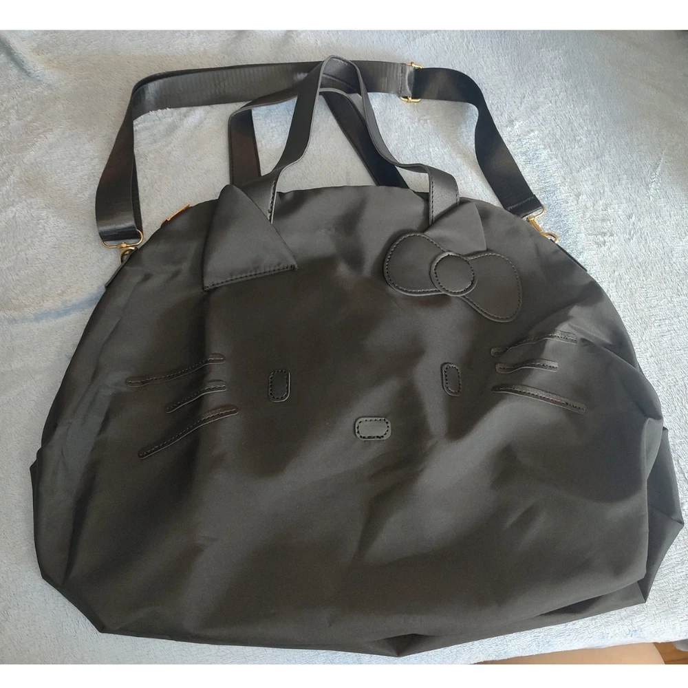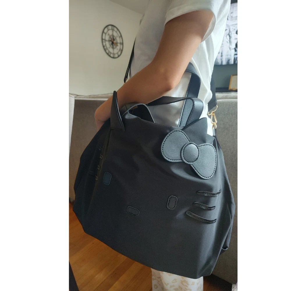 Department: Women Brand: Hello Kitty Exterior Color: Black Lining Color: Black Exterior Material: Polyester Handle/Strap Color: Black Size: Large Style: Tote Country/Region of Manufacture: China Features: Adjustable Strap, Lightweight Accents: Zipper Occasion: Travel