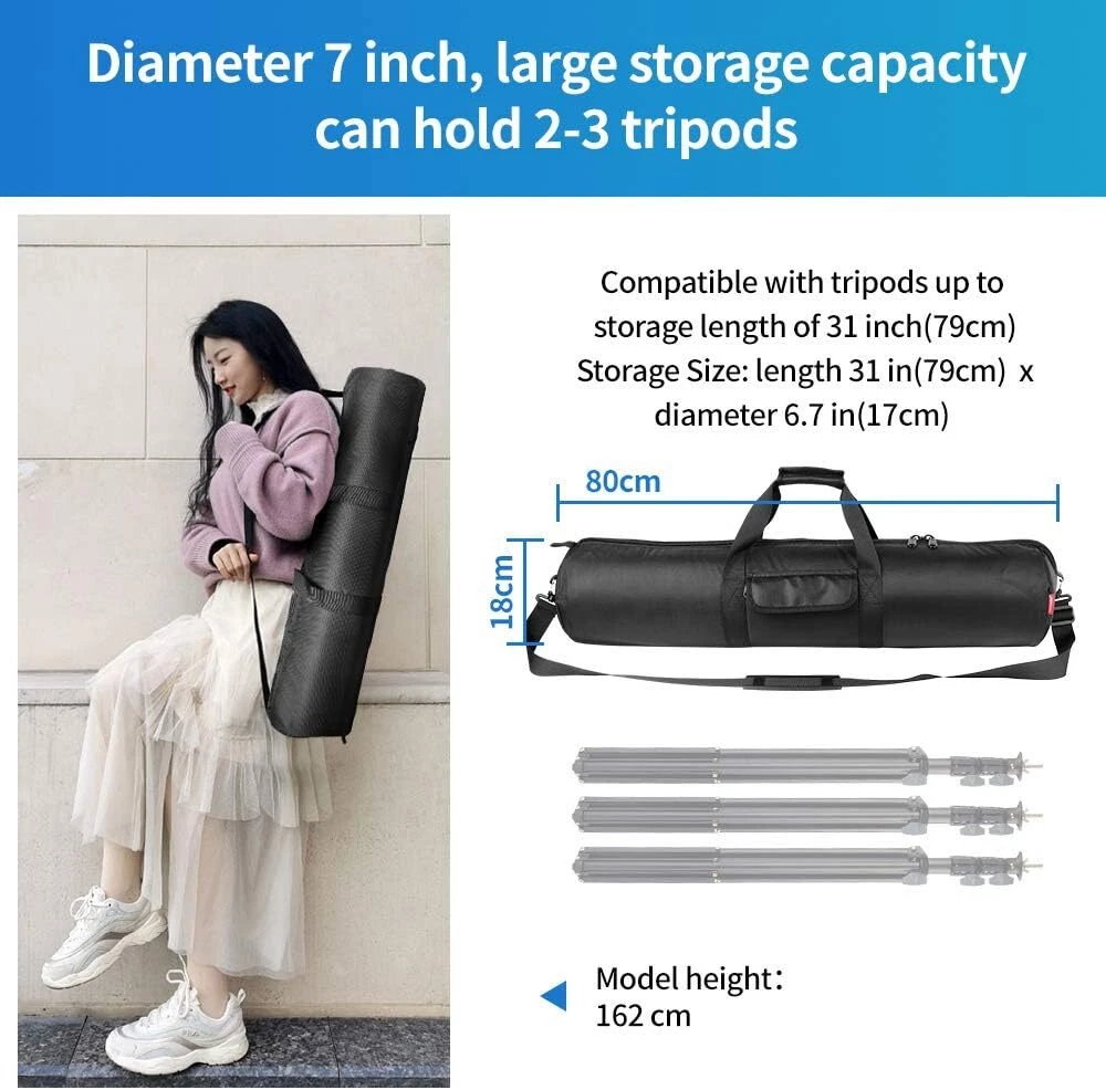HEMMOTOP Tripod Case, 31.5x7x7 in Heavy Duty Tripod Bag with Shoulder Straps and Handles, All Sides 1 cm Thick Padded Carrying Case with Two Zippered Pockets for Speaker Stand, Monopod - R08018 Black Item Description Compatible Equipment: HEMMOTOP 80 cm tripod bag is compatible with tripods up to storage length of 31 inches. Size: Length 31.5 in (80 cm) x diameter 7 in (18 cm) Thick Protective Cushioning: All sides of the tripod case are equipped with a thickness of 1 cm cushioning material to your equipment from damage. It is easy to transport your travel camping pole, camera tripod, fishing rod, mic stand, tent pole and more Durable Nylon Material: Tripod carrying case is made of heavy-duty and durable nylon material, which can carry heavy equipment safely. Water-resistant materials protect your equipment from unexpected weather Reliable Zipper and Sewing: With SBS zippers larger than usual zippers, make it quickly and smoothly to get your tripod inside and out. With reliable sewing, even heavy equipment can be transported safely Convenient Carrying: Hand-held and shoulder-back two options. Allows you to pack up your light stand and tripods anytime, anywhere. Please note: The tripod bag will be folded before delivery so there will be some creases Wide Application: Tripod carrying case is suitable for mic stands, tent poles, microphone stands, boom stands, guitar stand, photo backdrop stands, led lighting stands, telescope, telescoping awning poles, lighting gear or camera equipment and more › See more product details *Hemmotop tripod case has and internal pocket with zipper and likewise on the outside (which is larger), which is convenient for storing tools, a release, spare parts and small items or extra gear. *Adopting SBS zippers larger than usual zippers, make it quickly and smoothly to get your tripod inside and out. *One side of the tripod case is made of zipper wrapped, so that it is convenient to store and remove. The other side is a closed design, which can better protect the pan head of the tripod. *Double zipper, opening and closing is faster and more convenient. *Not only the main body, but also the round parts at both ends have a thickness of 1 cm cushioning material, help protecting your important equipment . *Suitable for carrying and storing camera and video tripods, musical instruments, music stands, microphone stands, fishing rods, light stands, cosplay accessories, and more. *The ties inside secure your equipment together so they don’t rattle around and damage anything. *Made of heavy-duty and durable nylon material, which can carry heavy equipment strongly. Water-resistant materials protect your equipment from unexpected weather. *With reliable sewing, even heavy equipment can be transported safely. Hemmotop tripod case is well-padded, and suitable for carrying or storing Telescope, Telescoping awning poles, Lighting gear, Professional Tripod and Monopod, Microphone Stand, Speaker Stand, Boom stand,Guitar stand, Photo Backdrop Stand, LED Lighting Stands or Camera Equipment etc. - The interior tie downs to help keep things from shifting Payment We accept payment only through PAYPAL Shipping We ship products worldwide through standard express courier service, it will reach within 7 to 10 days to abroad buyers, we ship the product after recieved clear payment and give full information about shipment to the buyer Return We accept product return within 7 to 21 days from delivery date but product should be in original position and not in damaged condition,the return shipping charges will be buyer responsibility
