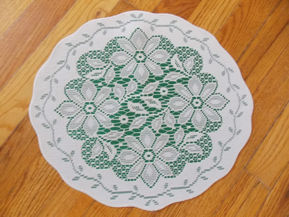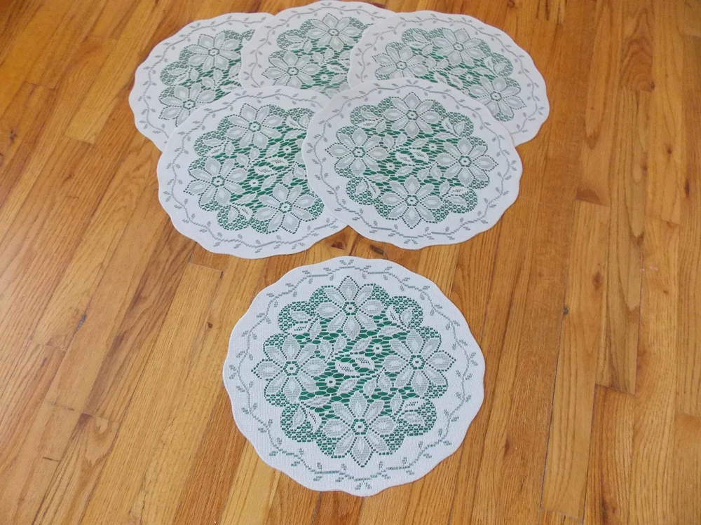 I PURCHASE MY LACE DIRECTLY FROM THE FACTORY, THESE MAY BE CONSIDERED SECONDS HERITAGE LACE GREEN AND WHITE SET 6 CHRISTMAS POINSETTIA PLACEMATS 15 BY 13 INCHES NEW WITHOUT TAGS I CHECK MY LACE FOR FLAWS, IF I NOTICE A FLAW I NOTE IT HERE IN THE DESCRIPTION, IF I MISS A FLAW IT IS NOT INTENTIONAL PLEASE MAKE SURE OF YOUR SIZE AND COLOR PRIOR TO PURCHASE AS I DO NOT ACCEPT RETURNS I TRY TO GET THE MEASUREMENTS WITHIN A ½ INCH PLEASE MAKE SURE YOU KNOW YOUR MEASUREMENT PRIOR TO PURCHASE ALL PHOTOGRAPHS ARE OF THE ORIGINAL ITEM UNLESS OTHERWISE STATED. The item(s) in this ad have been described to the best of my ability. If you have any questions feel free to ask, I will try my best to give you an answer. Ebay strives to maintain a safe and secure buying atmosphere, and I try also to give the best service. 5 star feedback is very important, if you have a problem with your item please give me the opportunity to correct the situation before leaving neutral or negative feedback. I will leave good feedback for you, and hopefully you are satisfied and will do the same. Thank you for your business, without you I wouldn’t be successful. Placing a bid on my items constitutes an agreement that you are accepting the item as described. Payment must be received within 3 days of auction close. Payment by Pay Pal accepted. I usually ship within 1 business day of receiving cleared payment International buyers will pay actual full shipping fees.