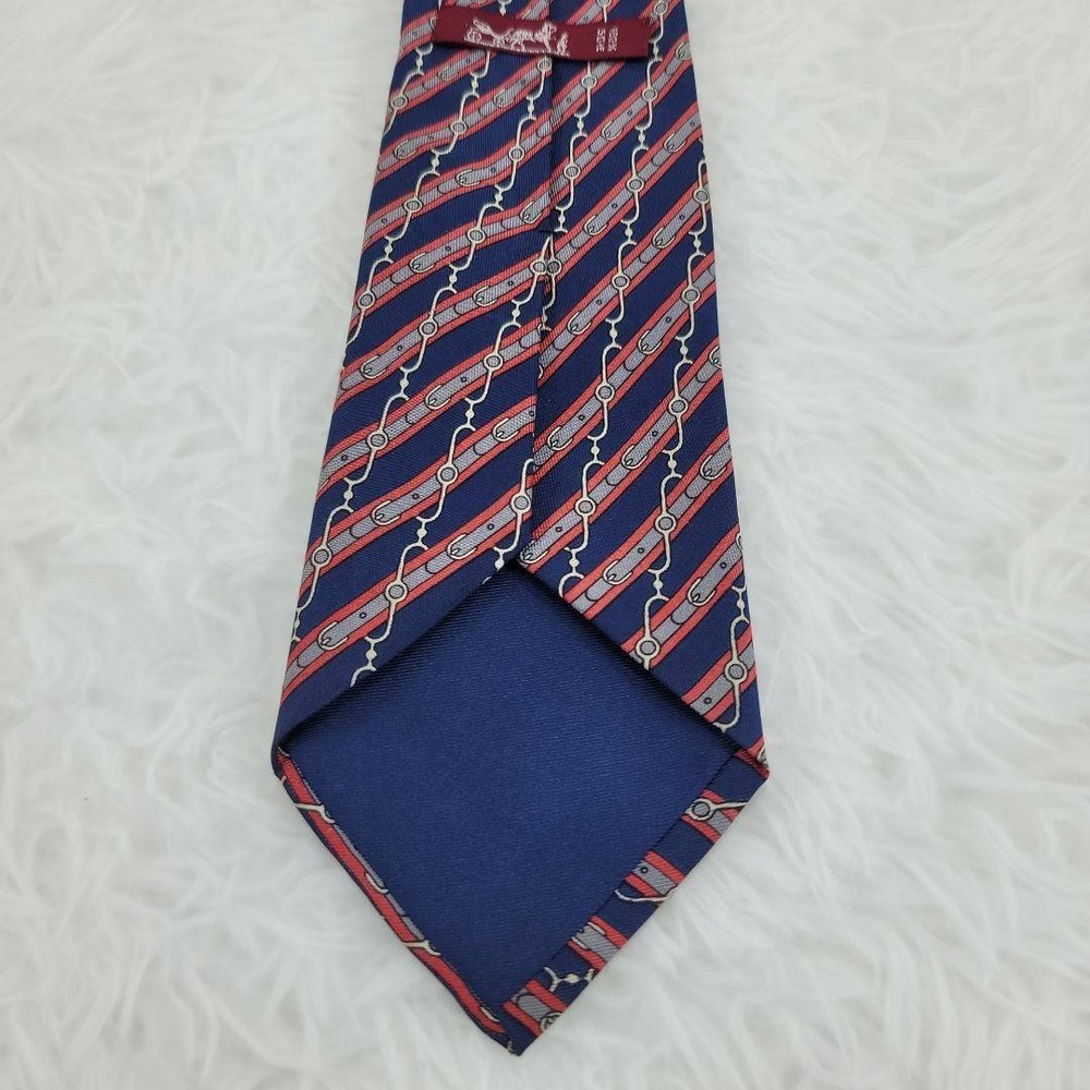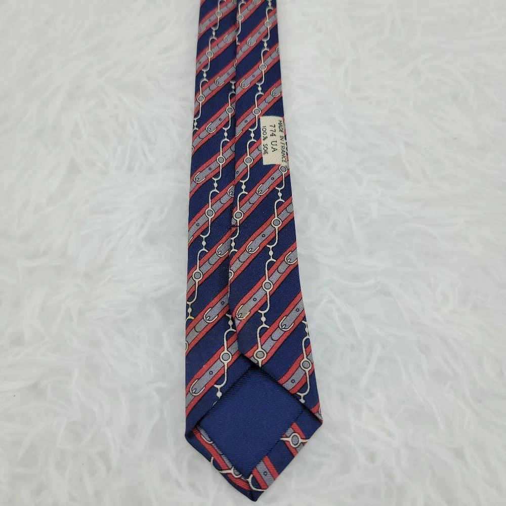 This Hermes tie is absolutely stunning! The navy with red and silver belt pattern looks so elegant. It arrived in great used condition as described and fits perfectly. Such an amazing find for the price!