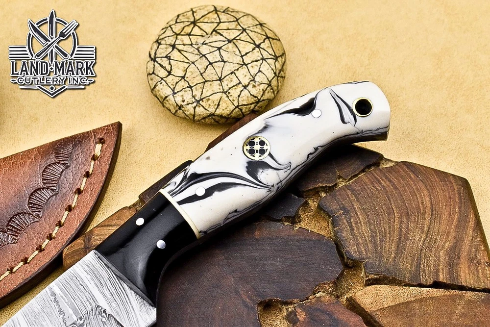 HERMOSO CUCHILLO DE CAZA DAMASCO CON REMOLINO RESINA NEGRO Y MANGO REFORZADO