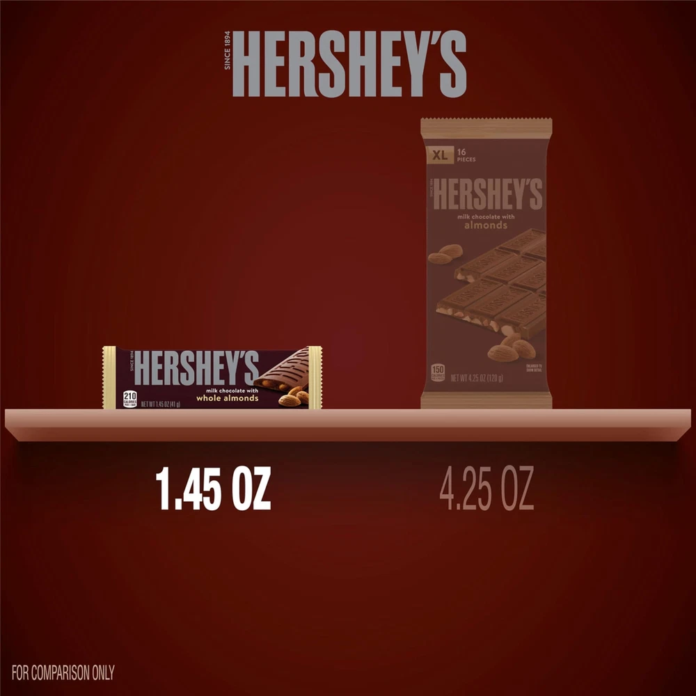 Product Description There's happy, and then there's HERSHEY'S happy. Made of the delectable, creamy milk chocolate that's been a classic for decades, HERSHEY'S milk chocolate with almond bars make life more delicious whether they're enjoyed alone or shared with loved ones. These full-size bars are the perfect treat for countless special and everyday occasions. HERSHEY'S milk chocolate candy bars with whole almonds can be used to stuff Christmas stockings, Halloween trick-or-treat bags, Easter eggs and Valentine's Day party favors. Keep some on hand for guests, and store some in your pantry for convenient snacking when the mood strikes. Show up to movie night with a box of HERSHEY'S bars with almonds to share with attendees and please the whole crowd. You can even sweeten up your favorite baked desserts with these chocolates by topping cupcakes and cookies with them. Everyone is excited when they're reaching for HERSHEY'S milk chocolate with almonds, and now you can be too!. From the Manufacturer Hershey's Milk Chocolate Bars with Almonds are more than just candy bars. They're chances to stop and savor life's sweeter side, so stock up, enjoy, and even share, these delicious bars of milk chocolate with roasted almonds. Contains thirty six (36) 1.45-ounce HERSHEY'S Milk Chocolate with Whole Almonds Candy Bars in a bulk box Bring your candy dish, gift-giving and s'mores games to the next level with HERSHEY'S classic milk chocolate and almond candy bars Kosher-certified, bulk milk chocolate and almond candy bars wrapped for lasting freshness and on-the-go snacking during any adventure Kick birthday parties, graduation celebrations, anniversary dates, movie nights and campfires up a notch with classic milk chocolate and almond bars for everyone involved The creamy HERSHEY'S milk chocolate you know and love with the just-right crunch of crisp, fresh almonds inside for the perfect Christmas, Valentine's Day, Easter and Halloween candy selections