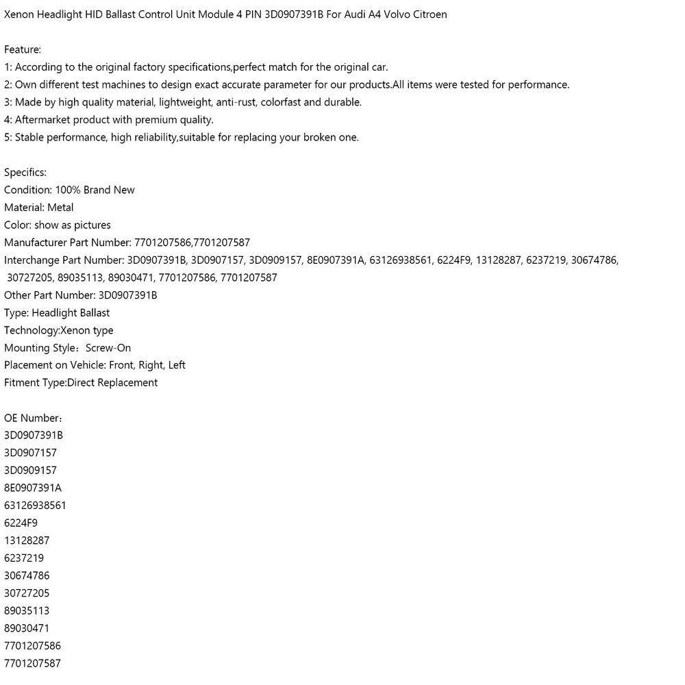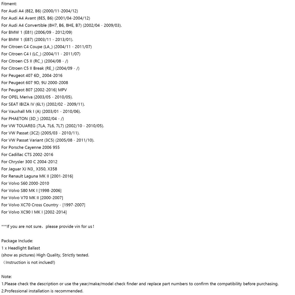 SAFE & SECURE SHOPPING 100% SATISFACTION GUARANTEED FAST SHIPPING Store Categories Store Categories Other eBay Motors Honda Toyota Ford Chevrolet Audi Mercedes-Benz Dodge Jeep You may also like Stainless Steel Braided Fuel Lines Kit 819-840 Quick Fix For 1999-2003 Chevy 110.69 USD Free shipping Headlight Mount Support Retainer Plate Bracket Kit For AUDI Q5 2009-2012 168.69 USD Free shipping Headlight Headlamp Lens Shell Cover Clear For Infiniti M25 M35 M37 M56 2011-2012 224.69 USD Free shipping G4KH 2.0T Engine Crankshaft+Main & Rod Bearing Kit for Hyundai Sonata Kia Optima 359.99 USD Free shipping NEW Windshield Wiper Window Cowl Panel Grille R+H For Mercedes Benz W210 E-Class 66.68 USD Free shipping Front Headlight Mounting Bracket Support Plate For Audi Q5 SQ5 2013-2017 166.69 USD Free shipping Headlight HID Ballast Control Unit Module 4 PIN 3D0907391B For Audi A4 Volvo #1 Product Description Xenon Headlight HID Ballast Control Unit Module 4 PIN 3D0907391B For Audi A4 Volvo Citroen Feature: 1: According to the original factory specifications,perfect match for the original car. 2: Own different test machines to design exact accurate parameter for our products.All items were tested for performance. 3: Made by high quality material, lightweight, anti-rust, colorfast and durable. 4: Aftermarket product with premium quality. 5: Stable performance, high reliability,suitable for replacing your broken one. Specifics: Condition: 100% Brand New Material: Metal Color: show as pictures Manufacturer Part Number: 7701207586,7701207587 Interchange Part Number: 3D0907391B, 3D0907157, 3D0909157, 8E0907391A, 63126938561, 6224F9, 13128287, 6237219, 30674786, 30727205, 89035113, 89030471, 7701207586, 7701207587 Other Part Number: 3D0907391B Type: Headlight Ballast Technology:Xenon type Mounting Style:Screw-On Placement on Vehicle: Front, Right, Left Fitment Type:Direct Replacement OE Number: 3D0907391B 3D0907157 3D0909157 8E0907391A 63126938561 6224F9 13128287 6237219 30674786 30727205 89035113 89030471 7701207586 7701207587 Fitment: For Audi A4 (8E2, B6) (2000/11-2004/12) For Audi A4 Avant (8E5, B6) (2001/04-2004/12) For Audi A4 Convertible (8H7, B6, 8HE, B7) (2002/04 - 2009/03). For BMW 1 (E81) (2006/09 - 2012/09) For BMW 1 (E87) (2003/11 - 2013/01). For Citroen C4 Coupe (LA_) (2004/11 - 2011/07) For Citroen C4 I (LC_) (2004/11 - 2011/07) For Citroen C5 II (RC_) (2004/08 - /) For Citroen C5 II Break (RE_) (2004/09 - /) For Peugeot 407 6D_ 2004-2016 For Peugeot 607 9D, 9U 2000-2008 For Peugeot 807 [2002-2016] MPV For OPEL Meriva (2003/05 - 2010/05). For SEAT IBIZA IV (6L1) (2002/02 - 2009/11). For Vauxhall Mk I (A) (2003/01 - 2010/06). For PHAETON (3D_) (2002/04 - /) For VW TOUAREG (7LA, 7L6, 7L7) (2002/10 - 2010/05). For VW Passat (3C2) (2005/03 - 2010/11). For VW Passat Variant (3C5) (2005/08 - 2011/10). For Porsche Cayenne 2006 955 For Cadillac CTS 2002-2016 For Chrysler 300 C 2004-2012 For Jaguar XJ N3_ X350, X358 For Renault Laguna MK II [2001-2016] For Volvo S60 2000-2010 For Volvo S80 MK I [1998-2006] For Volvo V70 MK II [2000-2007] For Volvo XC70 Cross Country - [1997-2007] For Volvo XC90 I MK I [2002-2014] ***If you are not sure,please provide vin for us! Package Include: 1 x Headlight Ballast (show as pictures) High Quality, Strictly tested. (Instruction is not inclued!) Note: 1.Please check the description or use the year/make/model check finder and replace part numbers to confirm the compatibility before purchasing. 2.Professional installation is recommended. About Us Shipping Terms Returns Contact Us About Us VIPIH is one of the international leading distributors specialized in distribution of auto spare parts of the world’s prime auto part suppliers on a global scale with the full responsibility in procurement, shipping, sales and marketing and after sales service. VIPIH fulfills all needs of its clients completely and on a timely basis with the know-how it has built up since it was established and the comprehension knowledge of the sectors standards. The perfectionist approach in product quality, high service availability, strict principle of business follow-up, reliability and the good reputation which has gained strength as a result of customer satisfaction are the most striking components of VIPIH ’ s success. VIPIH is presently capable of supplying all demands for auto parts from the gear box to turbo hoses in a wide range. Free delivery with worldwide shipping options available. If can not locate what you need then please get in touch! Shipping Shipping Terms International Buyers – Please Note: 1. Import duties, taxes and charges are not included in the item price or shipping charges. These charges are the buyer’s responsibility. 2. Please check with your country’s customs office to determine what these additional costs will be prior to bidding/buying. 3.Buyers' Information: We strive our best to provide you the most reliable, affordable way of shipping service. But sometimes international delivery is highly depended on the courier company and local customs/duties. If you do not receive your item on time, please sent us ebay message immediately for further assistance. Thank you for your understanding. Terms We stand behind everything that we sell and will do everything possible to assure you are satisfied. When you receive your purchase if you are not 100% satisfied, please sent me ebay message and we will do our best to make you happy. If you still want to return your purchase, simply ship the item(s) back to us and we will refund your original purchase price and the original shipping charge. Buyers are responsible for the postal cost of returning the items. We must be notified of the intent to return your item within 30 days of receiving the item. Items returned must be in the same condition that they were received. How to return 1,Please ask us for return address . 2,Shipping back the package . The RMA#(Return Merchant Authorization Number = Your ebay ID) must be clearly