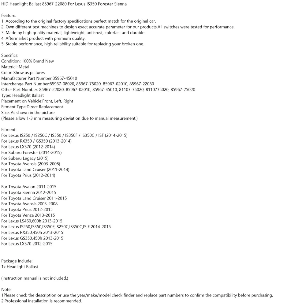 You may also like For Philips 11067CU31B1 Ultinon Pro3100 LED-WHITE W16W 6000K W2.1x9.5d 19.85 USD Free shipping H8 For`Philips CoreDrive Halogen Fog 12360CDC1 12V 35W PGJ91-1 M2 13.85 USD Free shipping For Philips 12188NAC1 Car Standard Auxiliary Bulbs PSY24W 12V24W PG20/4 M2 18.85 USD Free shipping Left Xenon Headlight AFS Cornering Module 7L6941329 For VW Passat 63.85 USD Free shipping Headlight Lens Shell Plastic Cover Left+Right For 2001-2007 Benz W203 C-Class 52.85 USD Free shipping Xenon Ballast Bulb LED Module Diode Kit For BMW 5 Series 528i 535i 550i M5 14-16 119.85 USD Free shipping New OSRAM Original 94196 H4 75/70W P43T 24V Halogen Headlight Lampbulb BILUX USA 13.85 USD Free shipping For TOSHIBA TAC8W Car Auxiliary Bulbs 31MM C8W 12V8W Festoon Lamp M2 10.31 USD 10.85 USD Free shipping 5% off 2x For OSRAM 9705Y Car Auxiliary Bulbs LED WY21W 12V2.5W WX3x16d M2 26.85 USD Free shipping 2Pcs H9 For OSRAM 5000K Cool Blue Hyper+ Plus White Light Halogen Bulb Globe 44.85 USD Free shipping Headlight Ballast Control Module Unit A2059009534 For Mercedes C E CLS G 139.85 USD Free shipping A2189009103 LED Turnlight Control Module For Benz W204 C class 2012-2014 63.85 USD Free shipping HID Headlight Ballast 85967-22080 For Lexus IS350 Forester Sienna Feature: 1: According to the original factory specifications,perfect match for the original car. 2: Own different test machines to design exact accurate parameter for our products.All switches were tested for performance. 3: Made by high quality material, lightweight, anti-rust, colorfast and durable. 4: Aftermarket product with premium quality. 5: Stable performance, high reliability,suitable for replacing your broken one. Specifics: Condition: 100% Brand New Material: Metal Color: Show as pictures Manufacturer Part Number:85967-45010 Interchange Part Number:85967-08020, 85967-75020, 85967-02010, 85967-22080 Other Part Number: 85967-22080, 85967-02010, 85967-45010, 81107-75020, 8110775020, 85967-75020 Type: Headlight Ballast Placement on Vehicle:Front, Left, Right Fitment Type:Direct Replacement Size: As shown in the picture (Please allow 1-3 mm measuring deviation due to manual measurement.) Fitment: For Lexus IS250 / IS250C / IS350 / IS350F / IS350C / ISF (2014-2015) For Lexus RX350 / GS350 (2013-2014) For Lexus LX570 (2012-2014) For Subaru Forester (2014-2015) For Subaru Legacy (2015) For Toyota Avensis (2003-2008) For Toyota Land Cruiser (2011-2014) For Toyota Prius (2012-2014) For Toyota Avalon 2011-2015 For Toyota Sienna 2012-2015 For Toyota Land Cruiser 2011-2015 For Toyota Avensis 2003-2008 For Toyota Prius 2012-2015 For Toyota Venza 2013-2015 For Lexus LS460,600h 2013-2015 For Lexus IS250,IS350,IS350F,IS250C,IS350C,IS F 2014-2015 For Lexus RX350,450h 2013-2015 For Lexus GS350,450h 2013-2015 For Lexus LX570 2012-2015 Package Include: 1x Headlight Ballast (instruction manual is not included.) Note: 1Please check the description or use the year/make/model check finder and replace part numbers to confirm the compatibility before purchasing. 2.Professional installation is recommended. -About US Founded in 2012, VIPJQ have professional development and sales, and are involved in various products, providing customers with various high-quality products. Since its establishment, VIPJQ has always adhered to the service concept of "customer first" and the management concept of "pursuit of quality", and is committed to providing customers with high-quality original designs. We commit to provide you the best innovative, quality products & professional services with competitive prices. We value every customer, and we look forward to providing solutions for your business needs to help your business achieve its goals, please contact us immediately! We are all about you! We are a Japanese seller,but with large warehouse in USA. We are profesional on Auto Parts,Car Parts,Motorcycle Parts,3C,other hot sale items and so on. We aim to provide to customers high quality product and best service. -About Shipment&Returns The item usually will be dispatched within 3 days after you ordered.All are free shipping. And it usually takes 3-5 working days to delivery depends on buyers' address or other majeure on the way. If you are not satisfied with the items and want to return the item,we hope you could message us first,we will give you the return details, we think we could give you the best service to save your time and money.Thank you. -About Feedback&Customer Service If you are enjoy your shopping here,not only enjoy the items but also the service,we are appreciate you could give us a 5-star feedback. If you are not satisfied with the item,before you give us the negative feedback,we hope we could give you the best solution through our commutication. We think we could do it if you give us the chance.Thank you.