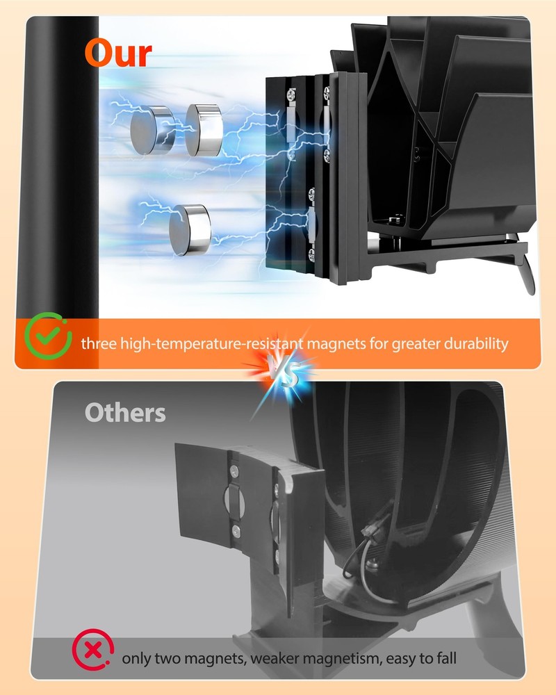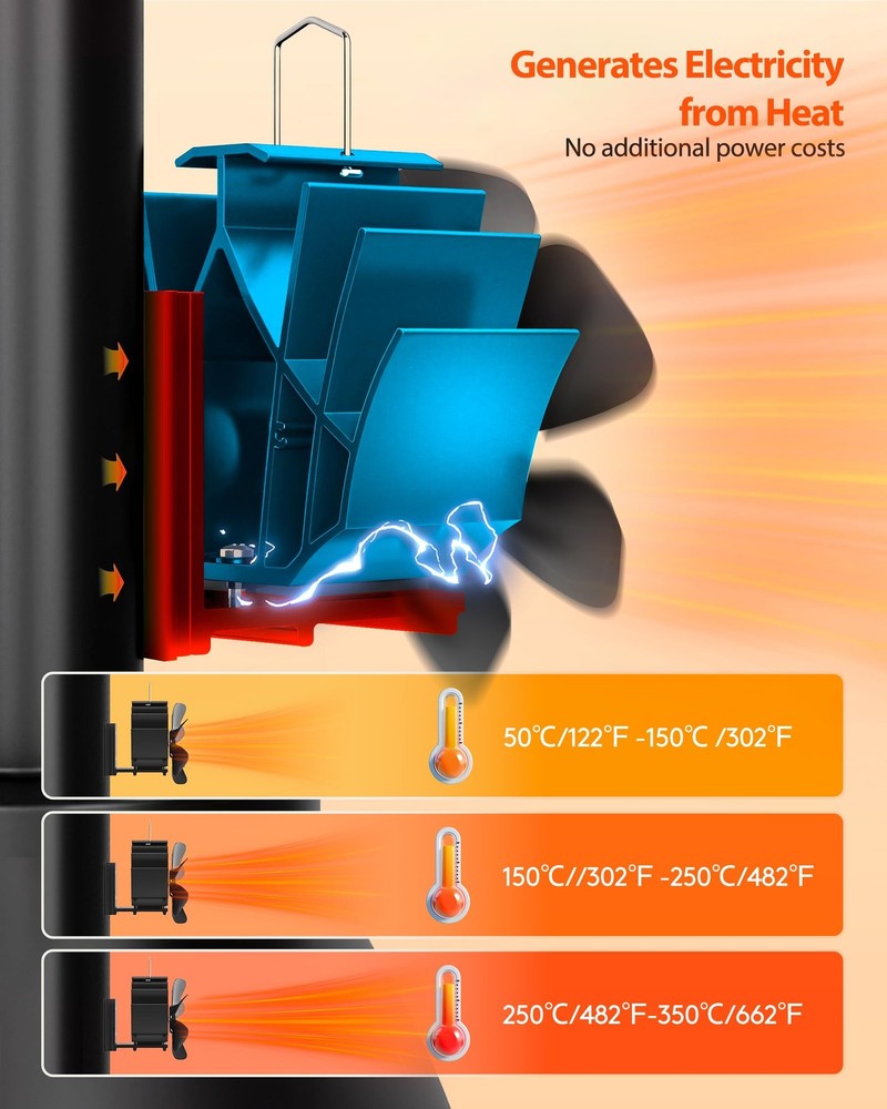 Wood Stove Fan Magnetically Flue Pipe Mounted, Heat Powered 6 Blades Fan, Non Electric, Silent Thermal for Gas Wood Burner Tent Stove Accessories Innovated Magnetically Mounted Design: Safer than normal stand wood stove fan, just simply magnetically attach it to flue pipe, it can start spinning very soon(Notice:not for pellet stove and alluminum pipe) Non Electric, Energy Saving: Heat drive, no electricity, environmental protection, cost saving. Heat fan make full use of the heat generated by the wood burning stove to generate electricity to operate, let the heat spread throughout the room, not just the ceiling and areas near the stove, reduce the fuel or wood in about 38% Durable: wood stove fan is made of high qualified anodized aluminum,rust-proof with good thermal conductivity. Quiet Operation: The heat activated fan for wood stove operates at ≤25 dB, distributing warm air throughout the room quietly and efficiently. Widely Used:No matter indoor or outdoors,our magnetically flue pipe mounted fan can be used in gas, pellet or wood burning stoves camping stove as long as it has iron pipe to improve the circulation of warm air. Specification: Type:Magnetically Flue Pipe Mounted 6 Blades Fan Color: black Power: heat powered Material: Aluminum Operating Temperature: 122℉-422℉ Air Flow: About 220CFM Noise: 15-20dB Recommended distance: 25cm Package size: 195*145*200mm Package weight: 743 Package list: 1*6-Blade Stove Fan 1*Manual Attention: 1. Please keep fan away from small children when in use. 2. Never handle the base of the stove fan, do not set the stove fan down on an unprotected surface when hot. 3. To move or carry the fan, always use the extendable handle while wearing gloves.4.Applicable pipe diameter:13-20cm Shipping We offer FREE shipping on all orders! We ship within Three business days of payment, usually sooner. We use a selection of shipping services such as UPS, FedEx, USPS etc. We only ship to the lower 48 states, no APO/FPO addresses or PO Boxes allowed. Local pickups and combined shipping options are not provided at this time. Return You can return a product for up to 30 days from the date you purchased it. Any product you return must be in the same condition you received it and in the original packaging. Please keep the receipt. Payment We accept payment by any of the following methods: PayPal Please pay as soon as possible after winning an auction, as that will allow us to post your item to you sooner! Feedback Customer satisfaction is very important to us. If you have any problem with your order, please contact us and we will do our best to make you satisfied. Contact Us If you have any queries, please contact us via ebay. We usually respond within 24 hours on weekdays. Please visit our eBay store to check out other items for sale! Thank you for shopping at our store.