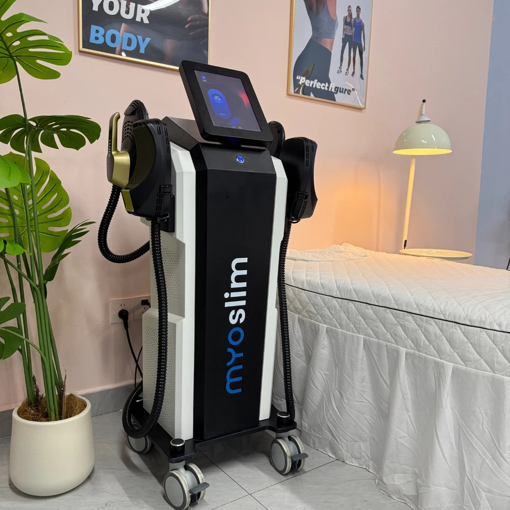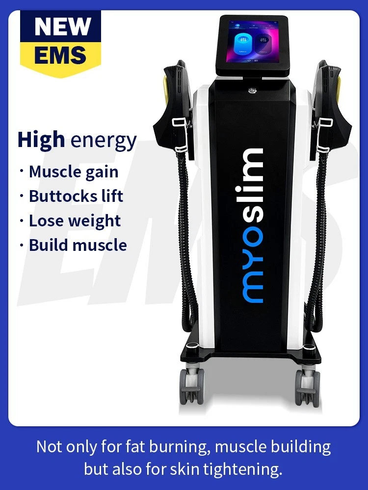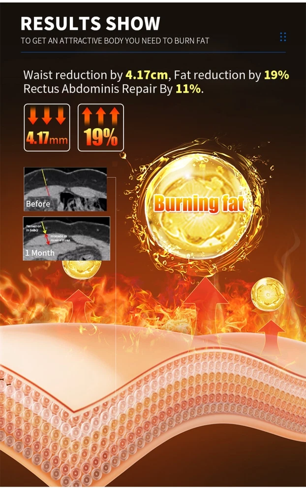 Fat Breakdown In less than 4 minutes the temperature in fat reaches levels that cause their permanent damage. Muscle Warm-Up The muscle temperature raises by several degrees, similarto what a warm-up activity does beforeany workout. Supramaximal Contraction Muscles in the treated area are contracted at intensities that are not achievable during routine exercise. After Treatment The fat cells are slowly removed from the body and the strained muscle fibers initiate a growth process. This results in fat elimination and muscle building. high-intensity focused electromagnetic field energy technology The high-frequency alternating magnetic field gener- ates an induced current in the muscle tissue, depolar- izes the nerve membrane, and excites the motor unit ofthe target muscle The instrument has four treatment heads that can be placed separately on the abdomen or buttocks( both) to help you move your muscles. By using HI-EMT( high energy focused electromagnetic wave) technology to expand and contract muscles, limit train- ing, and deep remodeling of muscle internal structure, That is, the growth of myofibrils (muscle enlargement) and the production of new protein chains and muscle fibers (muscle hyperplasia)to train and increase muscle density and volume How it works: Select target muscle group Adjust the intensity level according to your comfort level Choose the appropriate handle to adjust the quantity of individual energy Experience the benefits of improving muscle tone and firming the skin
