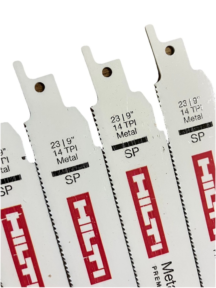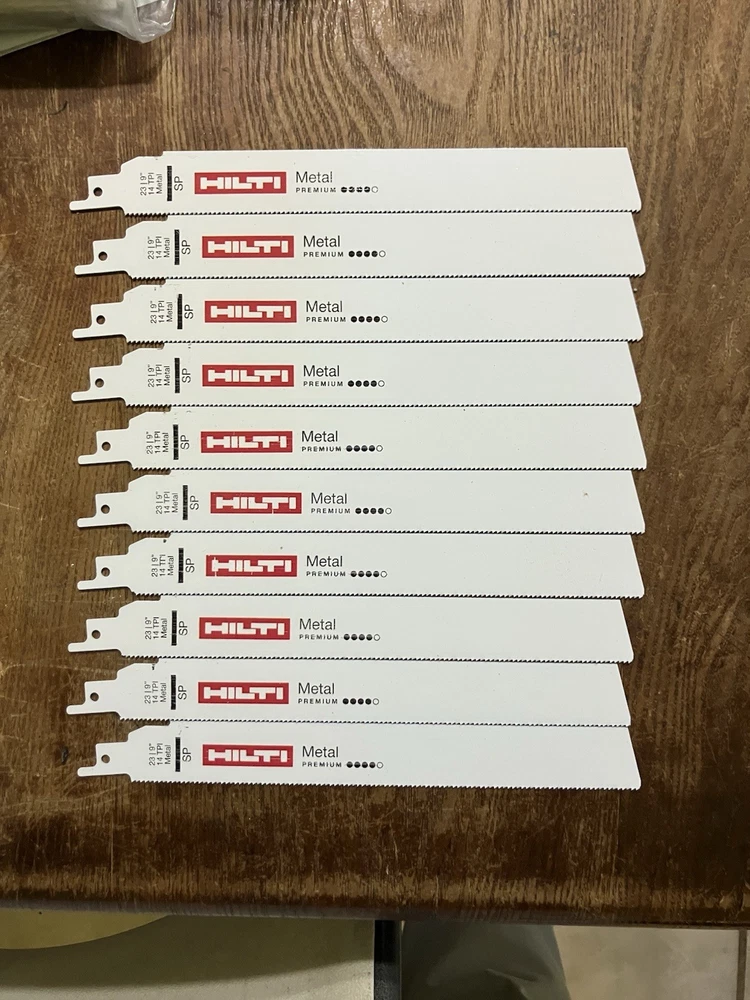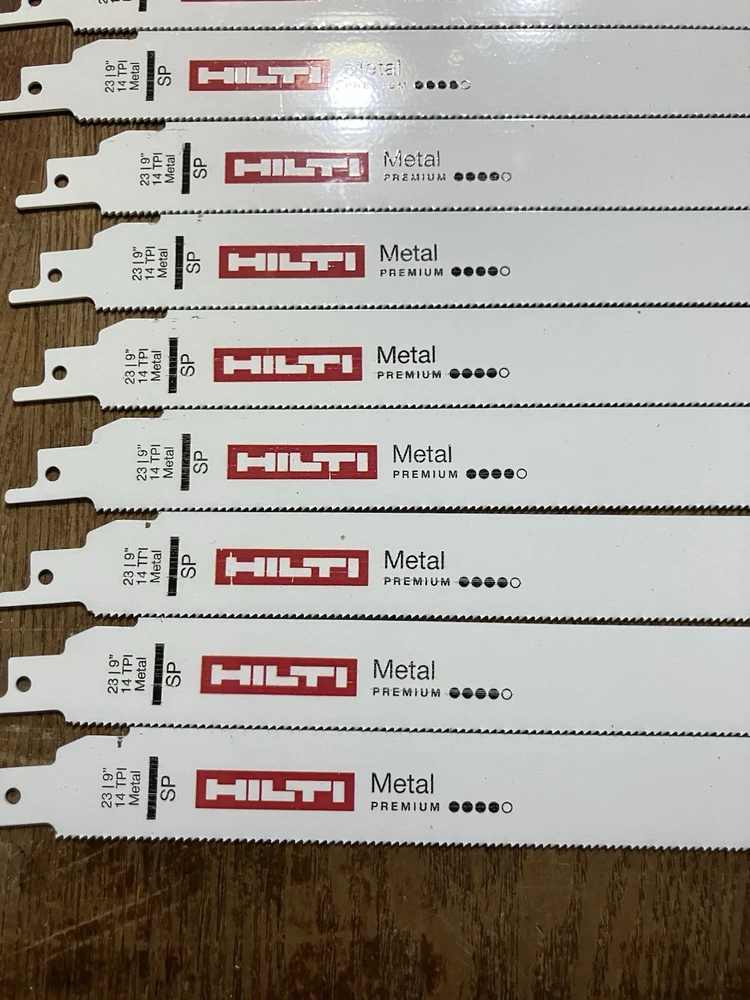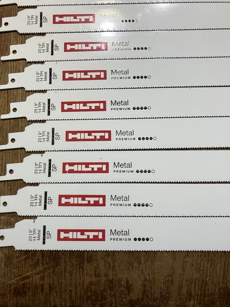 Get serious about metal cutting with this 50-pack of HILTI 9” 14 TPI premium reciprocating saw blades . Built for speed, strength, and precision, these blades are engineered to slice through tough metals with ease. Whether you’re a contractor, fabricator, or metalworker, this bulk pack gives you the quality and quantity to power through the job. Product Details: Brand: HILTI Blade Length: 9 inches TPI (Teeth Per Inch): 14 Quantity: 50 blades Cutting Type: Premium Metal Cutting Material Compatibility: Ideal for steel, aluminum, conduit, sheet metal, pipe, and more Condition: Brand new Compatibility: Universal shank fits most reciprocating saws (Sawzall, etc.) Key Features: Precision 14 TPI design for smoother, finer cuts Optimized for thin to medium-gauge metals High-quality steel with heat-treated teeth for long blade life Aggressive performance with reduced vibration Bulk value pack—ideal for job sites and high-volume use ✅ Why Choose HILTI? Trusted by pros for industrial-grade durability 🔧 Cuts faster and lasts longer than generic blades ⚡ Universal fit – works with all major saw brands 🧰 Ships fast and packaged securely 📦 🛒 Ready to Cut Through the Tough Stuff? Buy Now! This 50-pack of HILTI 9” metal-cutting blades is built for those who don’t settle for less. 💥 Upgrade your toolbox today – stock up now and cut with confidence before they’re gone!