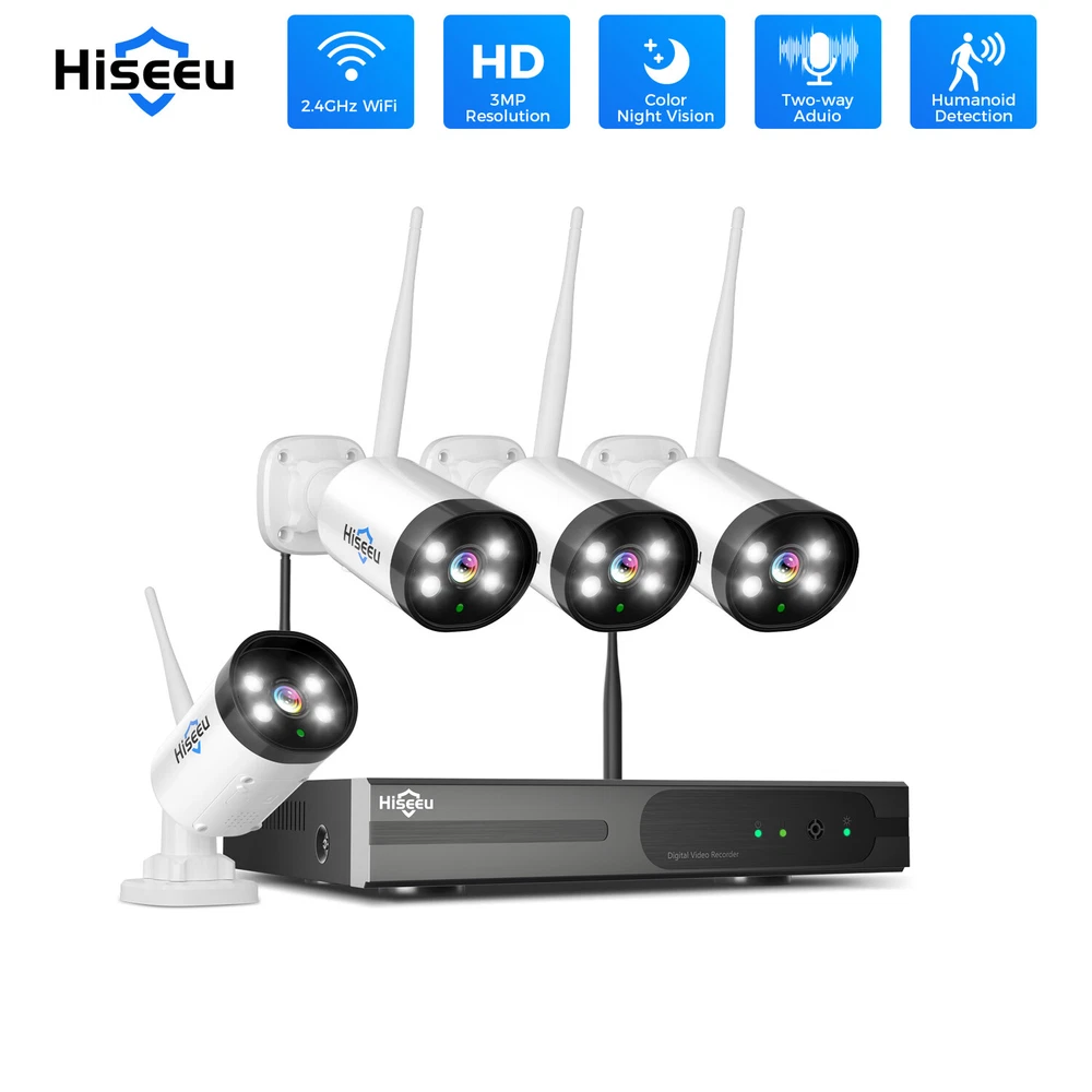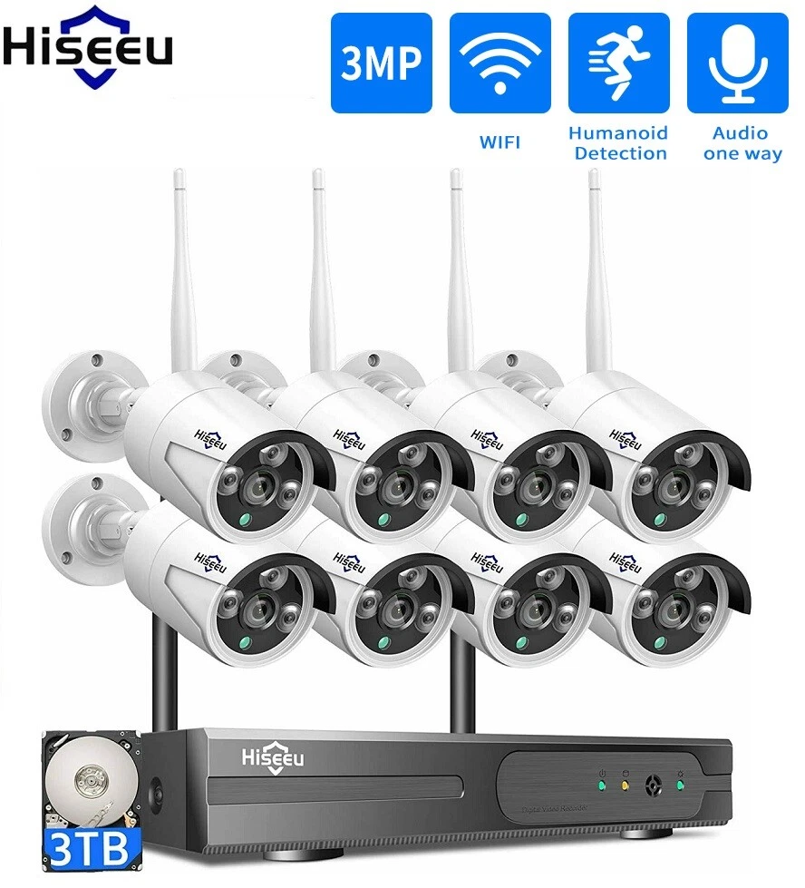 HISEEU Wifi IP 3MP 8CH 2K NVR Kit Wireless Security Camera System Outdoor Lot