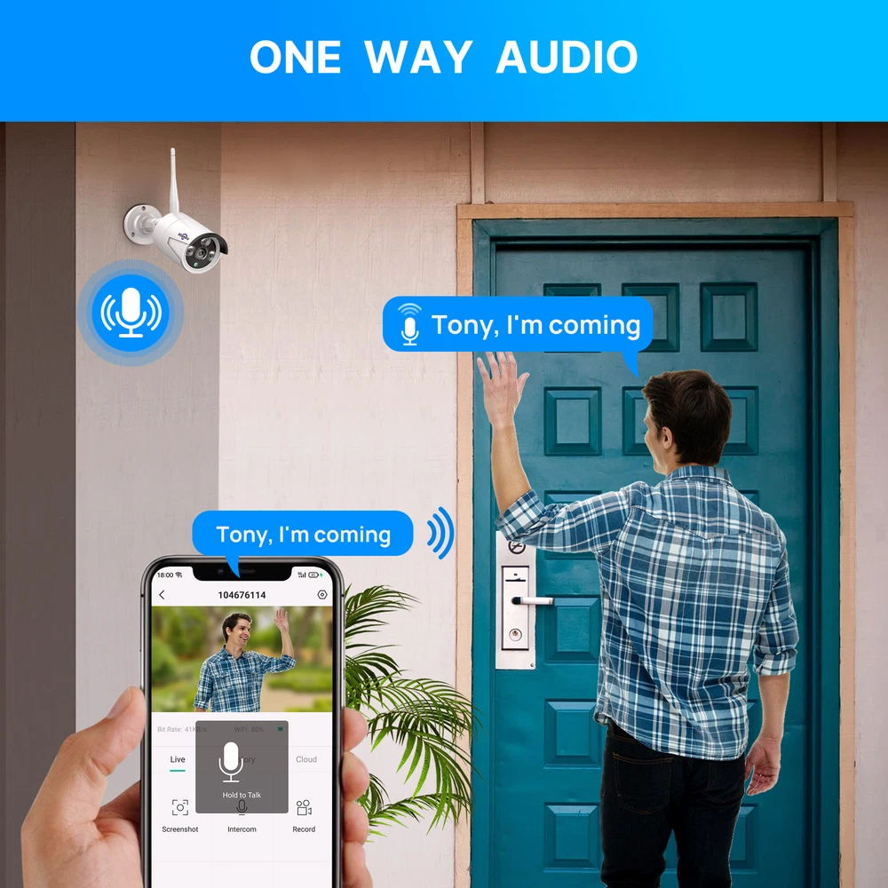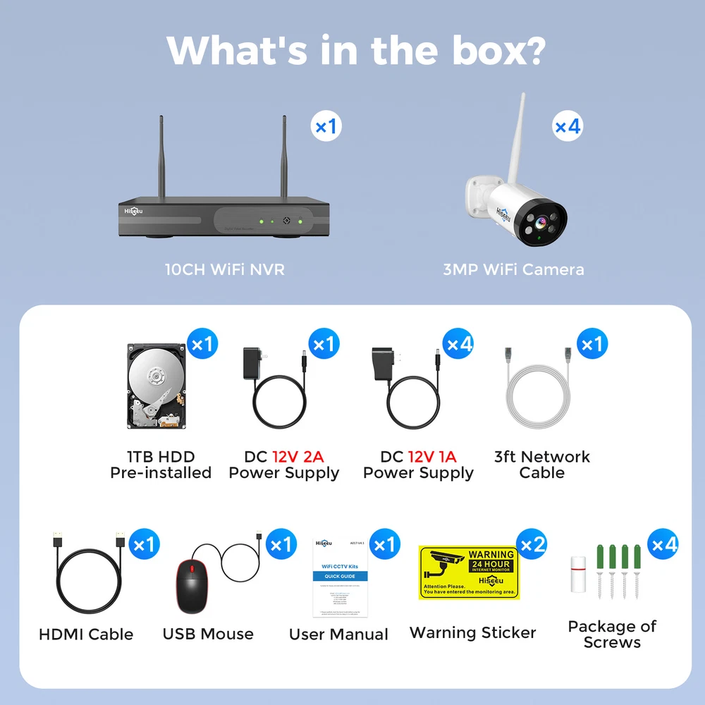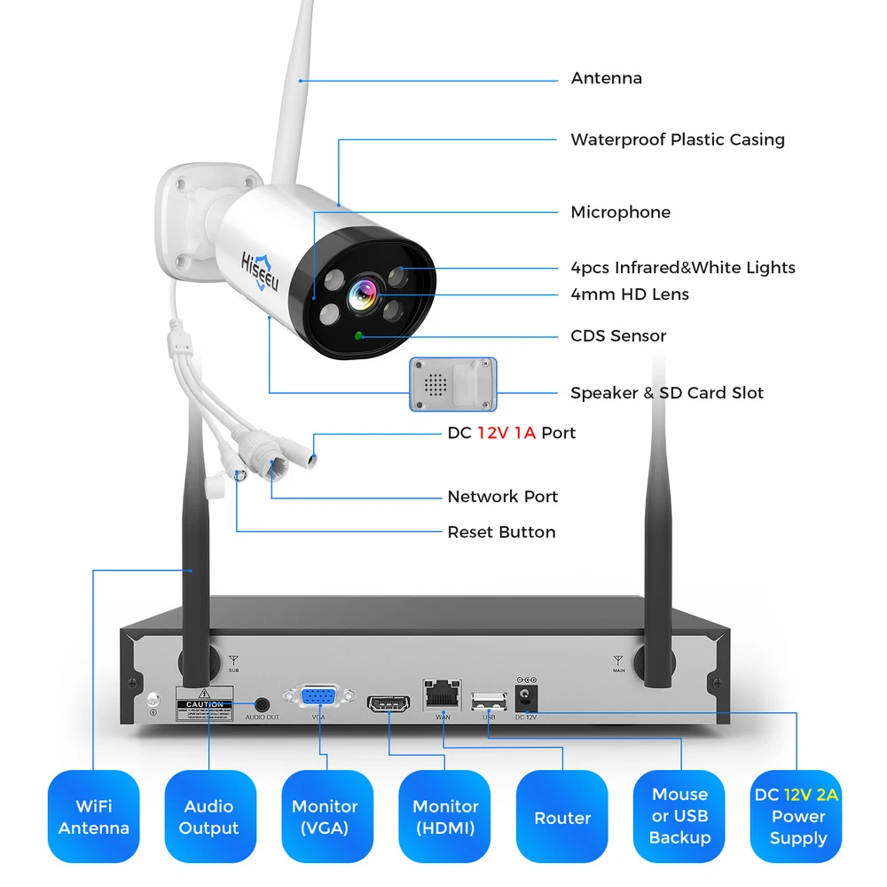 HISEEU Wifi IP 3MP 8CH 2K NVR Kit Wireless Security Camera System CCTV Outdoor Please note : this 4pcs/set security camera system support 2-way audio output !!! Please Noted: 1.this cctv system need 12V 1A power supply to charge it ! 2.this cctv system has been paired successfully ,if you want to add more than 4pcs cmaeras , you need to use the cable to pair camera and NVR . 3.this camera is plastic casing,it only support 2.4G wifi !! 2K 3MP Super HD & 60 ft Night Vision 1/3'' CMOS sensor, digital WDR, ultra-clear 2K 3MP Super HD clarity regardless day or night. 4 powerful infrared&white LEDs deliver up to 60 ft/15 m night vision range. You may identify objects in any lighting condition. Get Notified of Person Detection Armed with advanced AI-based human detection, this cam alerts you to true threats only. Listen and Talk in Real Time-2 Way Audio Use two-way audio to respond to guests or warn off the unwanted from anywhere. Auto Pairing, Easy Connection Power on the cameras and NVR and all is done! No wiring and no complex configuration needed. Pls note ,this cctv system has been paired when pakcage in factory ,if you want to add more than 4pcs cameras to this cctv system ,you need to use the cable to pair camera with NVR. Expand up to 10pcs Cameras This NVR is 10 channel NVR ,it can be add up to 10pcs cameras .Hiseeu cameras protect your family every moment . Item Features : [Easy setup]: Wireless means camera and NVR is wireless connection,camere(No battery) and NVR still need work with power cable. The wireless video security system is easy to setup and DIY installation (need DC 12V plug power supply), these WIFI cameras are paired with NVR at manufacturing site. Connect PC/TV monitor to NVR by a VGA/HDMI cable. Support connect router by 2.4Ghz WIFI network or router by Ethernet cable. Finally power on and serve yourself with 24/7 surveillance, true plug and play. [H.265+ VIDEO COMPRESSION]: Compared with H.264, H.265+ is able to double data compression ratio, while improve video quality with low bit-rate, It enables IP camera to deliver smooth HD video with low bandwidth, in turn, reducing the Network bandwidth and save up to 50% video storage space. 1TB hard drive pre-installed support 24 hours more than 30 days reliable video recording. 3TB hard drive pre-installed support 24 hours more than 90 days reliable video recording. [Remotely Anytime & Anywhere and No Monthly Fee]: Hiseeu wireless security camera system can working without network. Internet Is only necessary when remote access from mobile device. It allows you to view the live video remotely anytime and anywhere by phone and Pad(Available for Android & IOS system). We are providing free mobile APP "EseeCloud" (iOS & Android) and PC Client. No additional cost to download APP. Windows and MAC computer software:EseeCloud.(Please E-mail to Johnny for Software) [Stunning 2K Ultra-HD video]: 3.0MP presents 2304*1296 Mega Pixels about 1.5 times clearer than 1080P. Camera with 3 array Infrared LED allows you to see up to 65ft night vision even in darkness. Employing IP66 Waterproof metal material housing, cameras can be used indoor and outdoor. [AI Human Detection] :Reduces false alarms -- Compared with the traditional motion detection alert, the Hiseeu 3MP camera adopt more advanced AI human detection technology in 2021. Advanced AI technology for home security camera systems distinguishes humans from animals or objects within the monitoring range reducing false alarms. When an intruder enters the monitoring range, the screen will display the human frame will be triggered. Specification Video Format:H.265+ HDD:1 SATA interface USB:USB2.0 Working Temperature:14 °F – 131 °F/-10 °C – 55 °C Video Resolution:3MP (2304 X 1296) Image Sensor:1/2.8" Progressive Scan CMOS Lens:3.6mm Audio Compression:G.711A Angle of View:70° Number of Infra-Red LEDs:3PCS Class A Array LED Night Vision Distance:Up to 100ft/30m Wireless:IEEE802.11b/g/n On-vif:Support IR Cut Filter:Yes Color:White Indoor/Outdoor:Indoor/Outdoor Operating Temperature:-4 °F – 122 °F /-20 °C – 50 °C Dimension (L X W X H):6.9” X 2.6” X 2.6”/175 X 67 X 67 mm (Including the Bracket) Weatherproof Rating:IP66 Feature IP66 Weatherproof IP66 super waterproof grade and dustproof, durable outdoor weatherproof casing no matter windy or raining. Install the cameras outdoor or indoor, keep your home or business safe. Note: Power adapter is not waterproof. Video Playback at Any Time Replay significant evidence or funny video records. Quick search for any event video. Playback any video on different days, hours, or minutes by controlling the timer axis under the split screen. Day/Night Camera 3MP image sensor makes clear and stunning high-def video. All cameras are equipped with infrared night vision. They can capture clear footage up to 65ft away in pitch-black darkness. Motion Detection This motion-activated email alert function allows you to always stay connected to all the unexpected movements happened in your house. An alarming email will be sent to your inbox. One-Way Audio Function ( please note,4pcs cameras/set security camera system cannot support audio output ) Built-in the microphone,so you could not only view the video,but also clearly hear the people on phone app or monitor. There is no speaker in the camera, so you can't make conversation with people. If you need two-way audio camera, you can check my shop or contact me. 24 hours Reliable Video Recording 1TB Hard Drive Pre-installed in the WiFi NVR enables 30+ days video recording (up to 6TB supported) This system allows all cameras recording at the same time. 3TB hard drive can record for 90 days. Note:Choose your style before ordering, the kit without hard drive does not have the recording function. True Plug and Play Camera and NVR have been matched before delivery. All you have to do is plug the antenna and the power supply. If you want to watch it on your phone or PC, connect the system with router by 