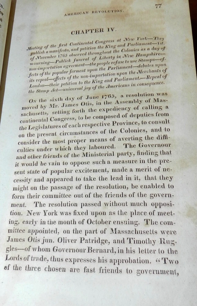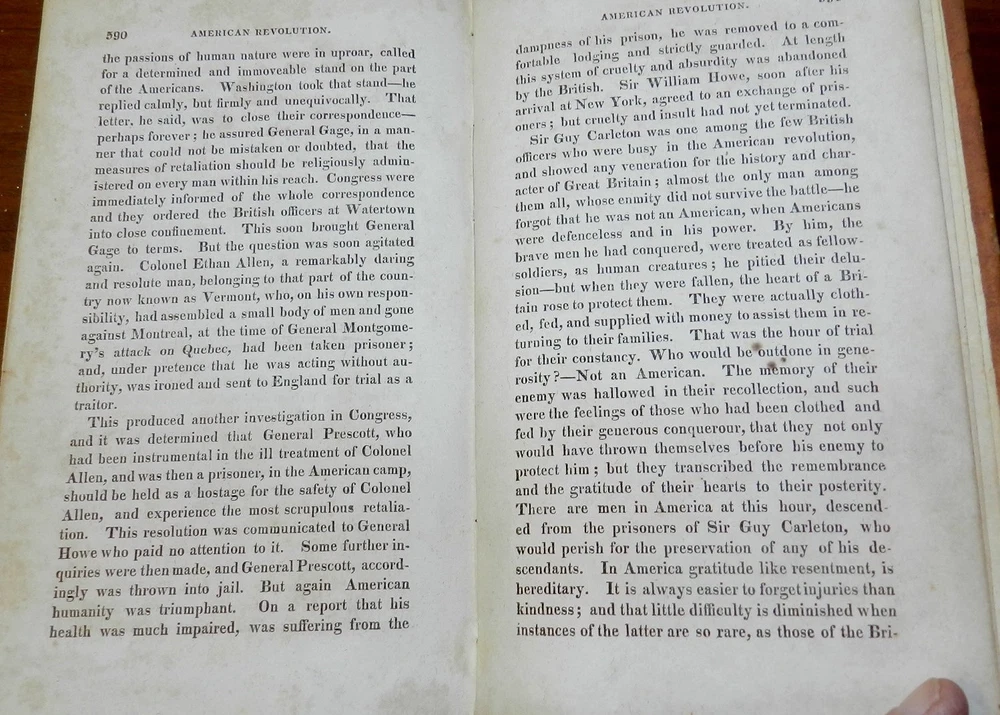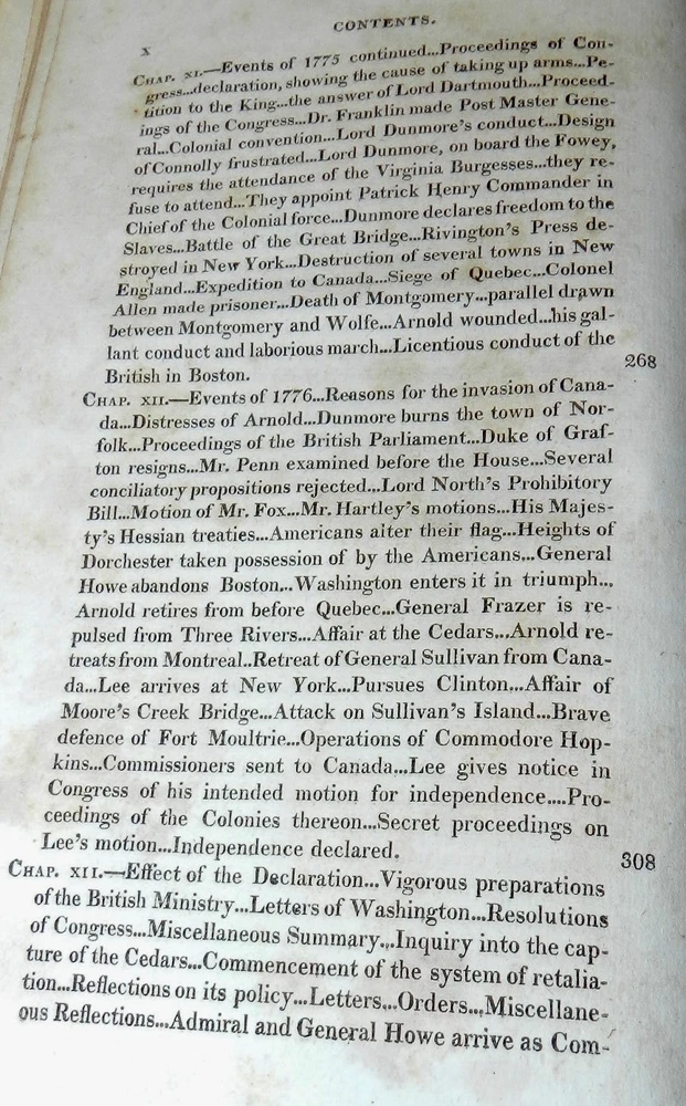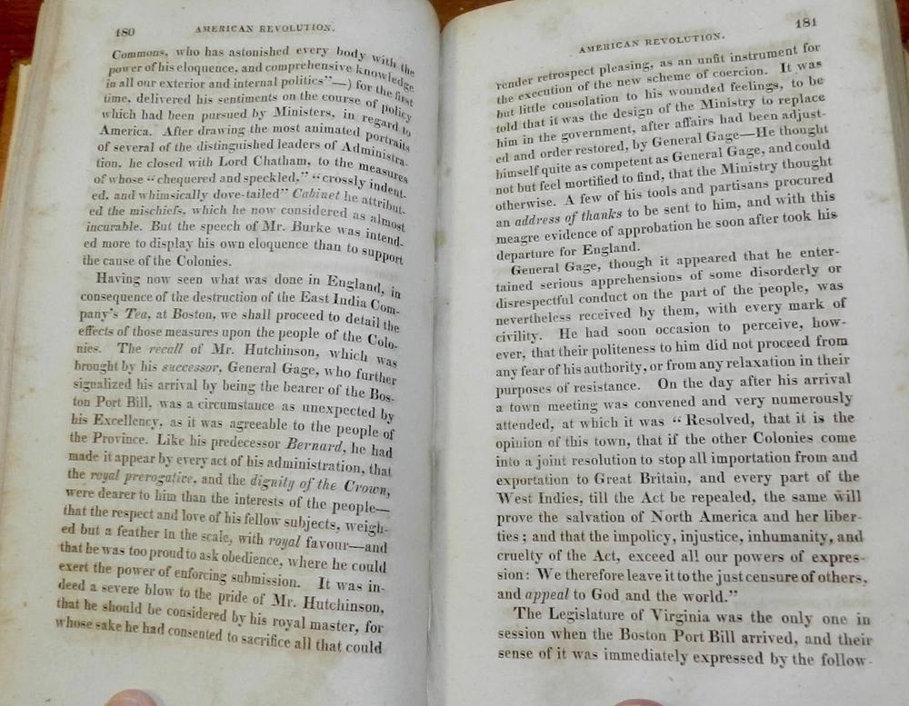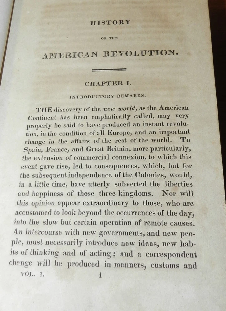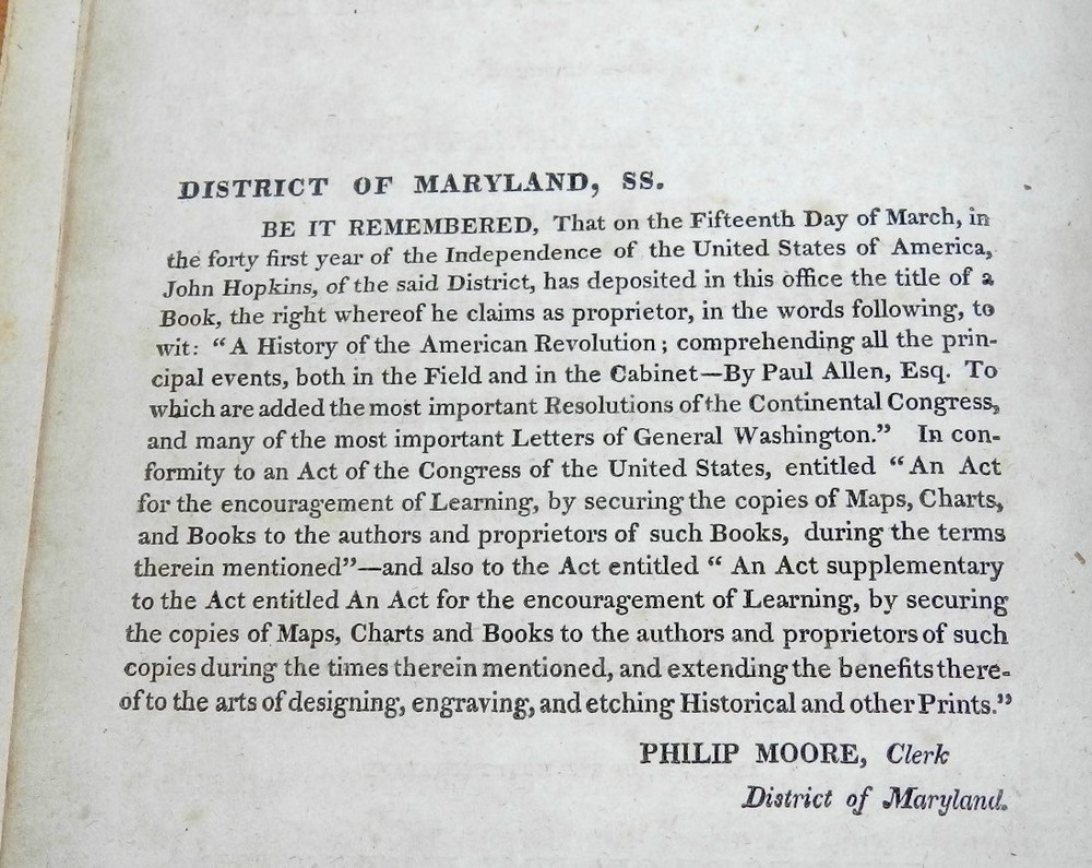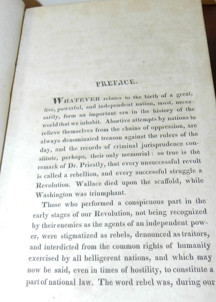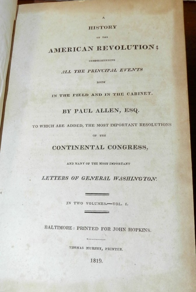 HISTORY OF THE AMERICAN REVOLUTION by Paul Allen, 1819 1stEd. Leather HISTORY OF THE AMERICAN REVOLUTION by Paul Allen, 1819 1stEd. Leather A HISTORY OF THE AMERICAN REVOLUTION; COMPREHENDING ALL THE PRINCIPAL EVENTS BOTH IN THE FIELD AND IN THE CABINET. by PAUL ALLEN, ESQ. TO WHICH ARE ADDED, THE MOST IMPORTANT RESOLUTIONS OF THE CONTINENTAL CONGRESS, AND MANY OF THE MOST IMPORTANT LETTERS OF GENERAL WASHINGTON IN TWO VOLUMES – VOLUME I Baltimore, Thomas Murphy, printer; printed for Johns Hopkins, 1819. First edition. Contemporary calf, gilt decorated spine, red spine label with gilt title, octavo, xi, [1], 592 pages. Sabin states, "Although the name of Paul Allen is on the title, this work was written by John Neal and Mr. Watkins." Paul Allen (February 15, 1775 – August 18, 1826) was an American poet, historian, and editor. Biography Born in Providence, Rhode Island on February 15, 1775, Allen studied at Brown University, graduating in 1793. He later relocated to Philadelphia, where he served as editor of The Port Folio, the Gazette of the United States, and the Federal Republican. While in Philadelphia, he edited a two-volume history of the Lewis and Clark Expedition, published in 1814 in that city, but without mention of the actual author, banker Nicholas Biddle. Allen reached the height of his reputation after he moved to Baltimore, where he served as editor of the short-lived Journal of the Times and the more-successful Baltimore Morning Chronicle.[3] He also joined the Delphian Club, where he earned the "clubicular" name of Solomon Fitz Quizz and the title of Professor of Loblology, which was defined as "the science of endeavoring to do that which is impossible." He proposed publishing A History of the American Revolution, but relied on fellow Delphians John Neal and Dr. Tobias Watkins to write all but the preface to satisfy the subscribers to its publication in 1819. Thomas Jefferson considered Allen the country's best author of prose. In his 1824–25 critical work American Writers, Neal's assessment was more nuanced: "Mr. Allen is a showy, eloquent prose-writer—who never thinks, and, if he can help it, never reasons .... His prose is full of poetry—his poetry is miserably full of prose." Allen died in 1826, at which time he was still editor of the Baltimore Morning Chronicle. CONDITION: Covers have some spots, scuffing and scratches. Moderate wear at top of spine, some wear at edges and corners, some abrasion of spine decorations. Light spoting on pastedowns and endpapers, signature on front pastedown and pencil notation on front endpaper. The tightly bound Contents are complete and intact, The title Page has moderate foxing spots and some darkenening at the margins. The paper is age tanned and the text pages have light or occasionally moderate foxing spots. Check our other auctions and store listings for additional unusual items Check our other auctions and store listings for additional unusual items Listing and template services provided by inkFrog