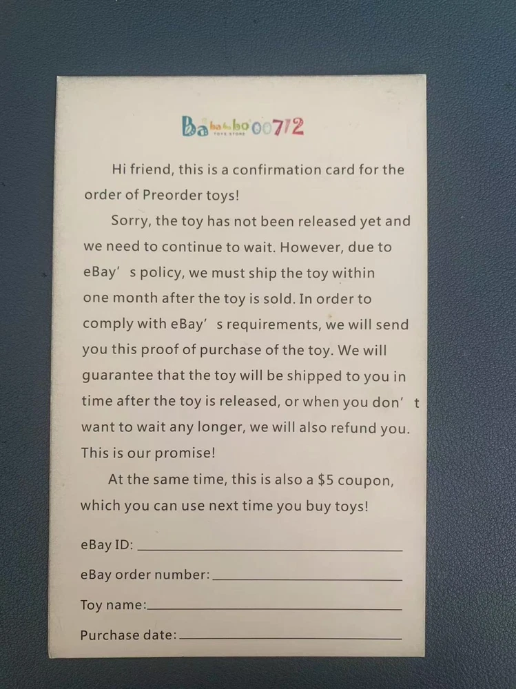 Store Categories Store Categories Transformers Toy Action figure Toy Model Kit Motor Home & Garden Other Preorder Deposit for HIYA Godzilla 2014 Transparent Figure Toy Product Description Type Action Figure MPN EBG0079 Item Height 6 in Character Godzilla Age Level 8-11 Years Brand Hiya Features Boxed Movie Godzilla Material ABS Plastic Franchise Godzilla Series Godzilla Theme Movies Country/Region of Manufacture China Attention: This is only a pre order toy price card, which will indicate the name and order number of the toy you purchased. Holding this card means that we still have unfinished orders. After the toy is released, you can get a $15 discount on the total price with the photo of this card. If you don't want to wait, you can also notify us to cancel the pre order before the toy is released, and we will refund you! Payment Policy Shipping Policy Returns Policy Contact us Payment Policy We accept eBay Payments . It is fast,easy and safe.if you use e- check on paupal as we will hold your order unit your e-check clear Shipping Policy It takes about 15-20 business days to ship to UK , USA , AUS, Canada It takes about 25-30 business days to other European countries shipping requires more complicated shipping procedures (such as both countries customs, transit stations etc.), it will probably take longer . Thank you for your understanding on this matter. Returns Policy Return *We will refund only for faulty items.If you have chosen the wrong size we can exchange but postage for the both ways to be paid by purchaser.please contact us if you have any problems before leaving negative feedback.We bag your pardon that due to the high shipping cost exchange or return is not offered.We provide excellent customer service and believe that most problems,can resolved to the satisfaction of both parties please ask questions prior to purchase. Contact us Customer satisfaction is important to us and our feedback rating reflects it . If you have any questions before and after your purchase,Do not hesitate to contact us , we welcome you to email us, we strive to answer all questions and resolve any problems as quickly as possible. Please leave us your positive feedback and 5-star rating if you are satisfied with our items and service. You will be greatly appreciated. If not quite satisfied, please do contact us before leaving the feedbacks. We will surely solve the problem for you satisfactorily. (100% communication, 100% refund, 100% replacement) Please do give us a chance to make things right before any negative or neutral feedback left Copyright © 2023 Dianxiaomi