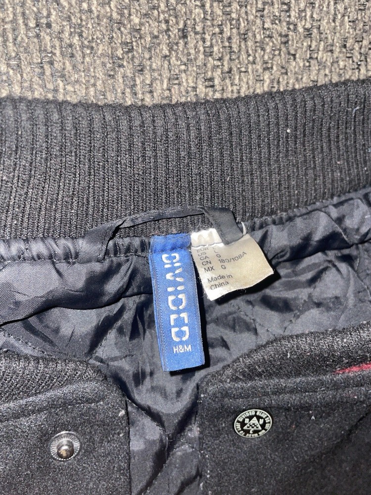 Outer Shell Material: Polyester Color: Black/burgandy Model: H&M VARSITY DIVIDED Style: Varsity Jacket Size Type: Regular Lining Material: Polyester Insulation Material: Polyester Size: L Size (Men's): XL Type: Jacket Closure: Snap Department: Men Brand: H&M