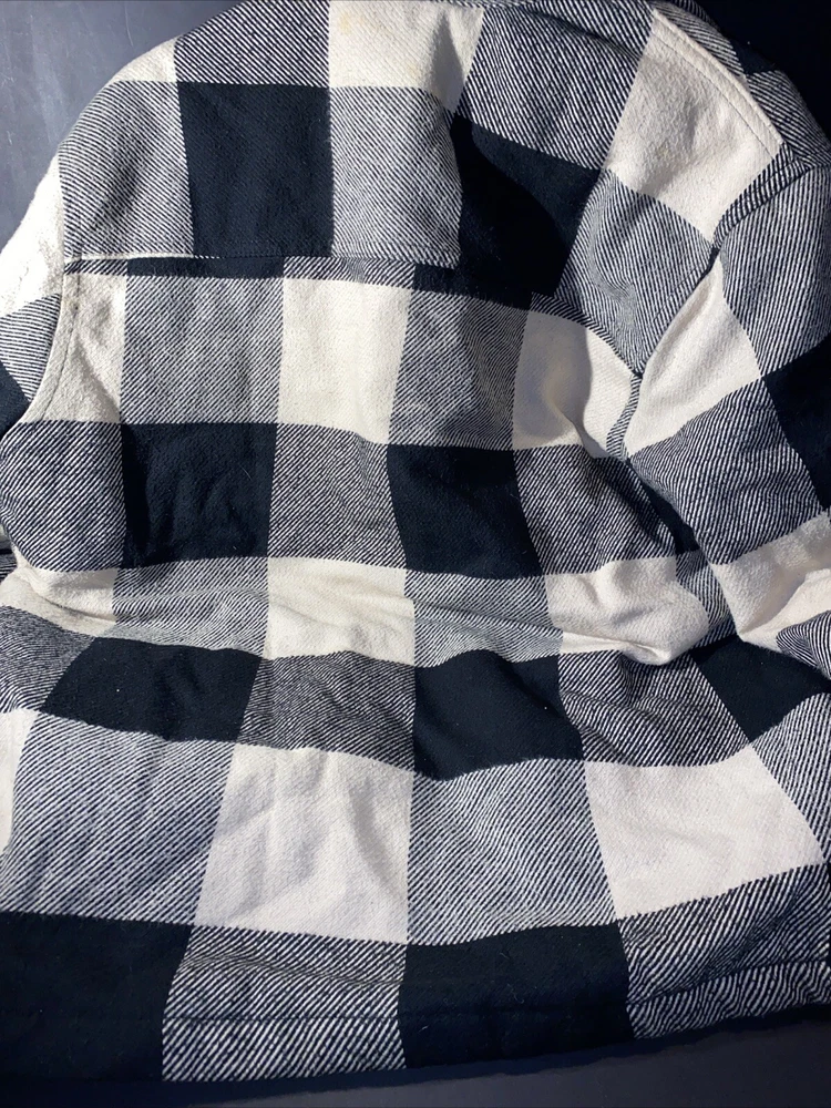 Elevate your casual wardrobe with this stylish H&M Overshirt in Light Beige and black Plaid. The button-up shirt features a padded design for extra warmth and comfort during the colder seasons of fall, winter, and spring. The long sleeves and collared neckline provide a polished look, making it perfect for both casual and formal occasions. The overshirt is made for men in size small, with a chest size that can be viewed in the photos. The snap closure adds a touch of convenience and style to the shirt. This shirt is a must-have for any fashion-forward individual looking to stay warm and stylish during the colder months.