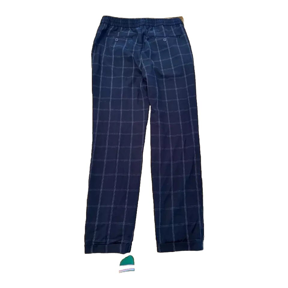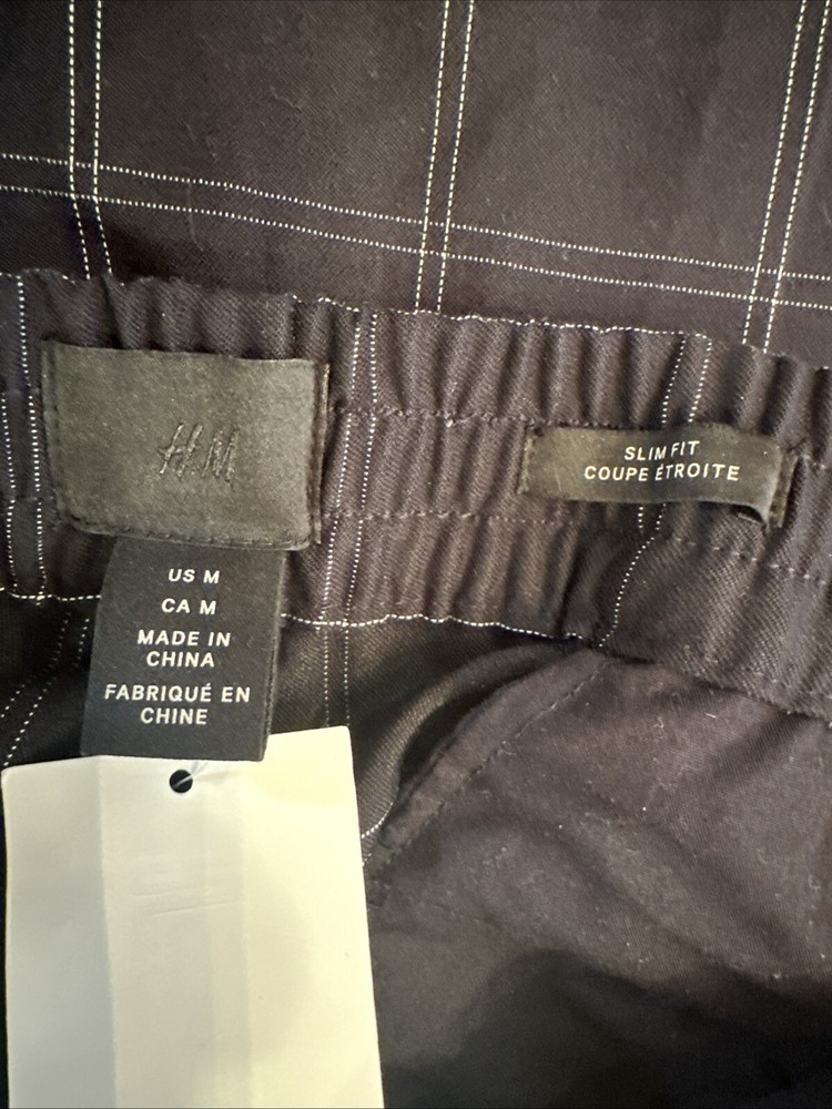 These H&M Slim Fit Drawstring Plaid Pants are designed for men in size M. Made of polyester fabric with a rayon lining, the black pants feature a stylish plaid pattern and a drawstring closure for a trendy urban look. The slim fit and 28-inch inseam cater to a hipster city theme. Personalization options include hemming for a customized fit. Ideal for casual, formal, or party occasions during the winter, fall, or spring seasons, these pants by H&M offer both style and comfort with practical pockets and a flat front design.