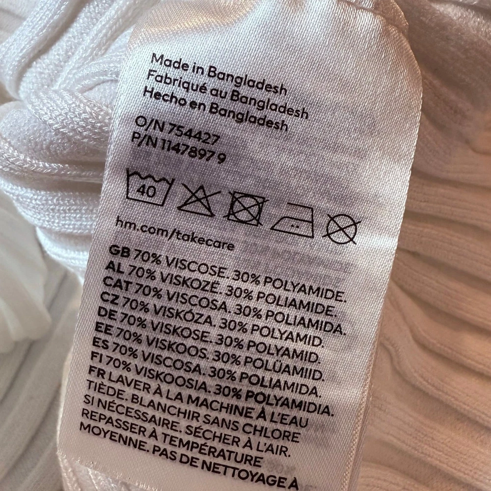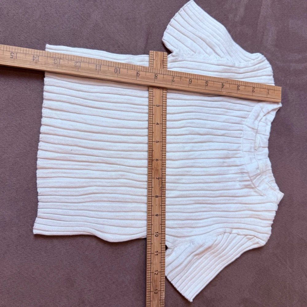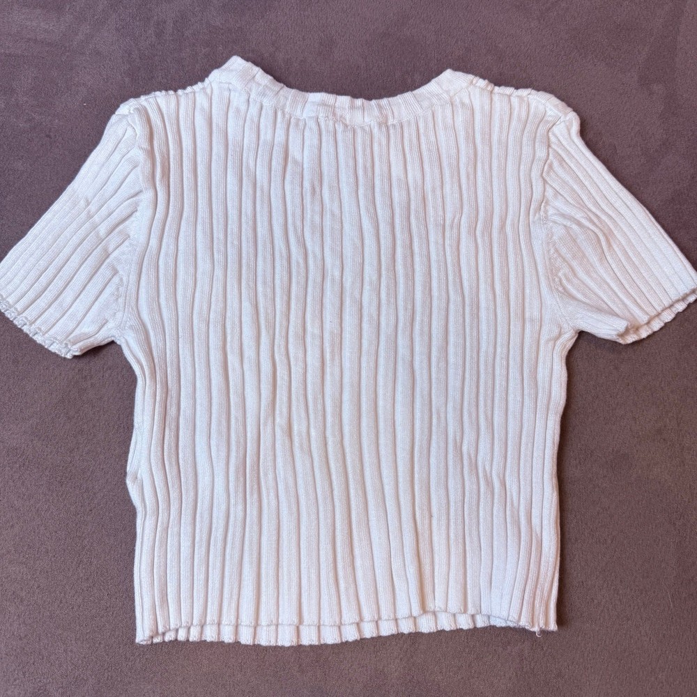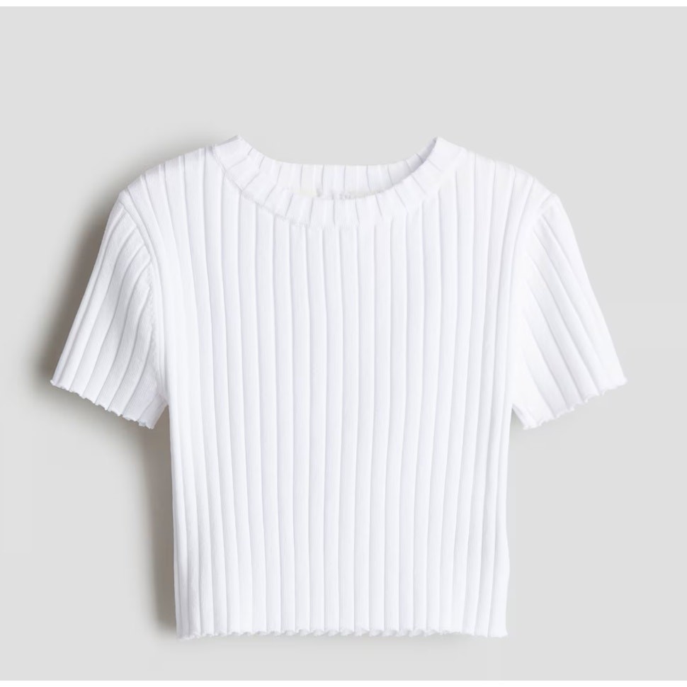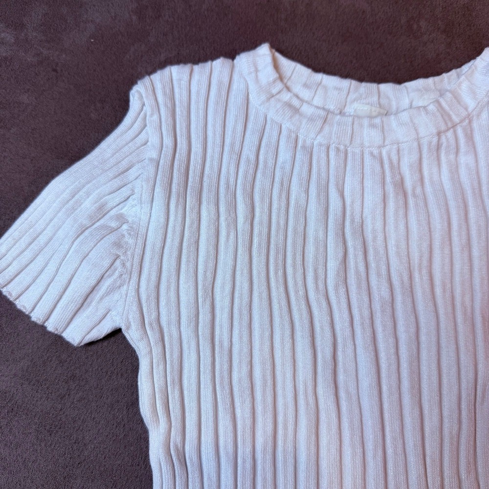 H&M White Ribbed Knit Top Shirt Sweater 8 10 Girls Soft, rib-knit top with a round neckline, short sleeves, and raw edges at cuffs and hem. Almost feels like a sweater. Fabric is a viscose blend but feels like a stretchy thick cotton to me. Excellent condition, bright white, no flaws or issues. 754427 1147897 9