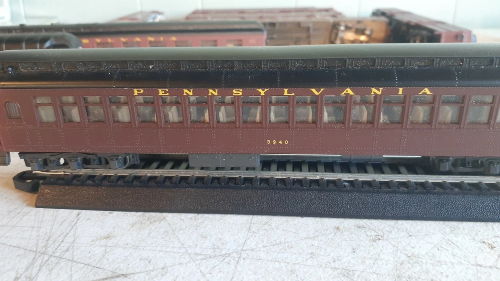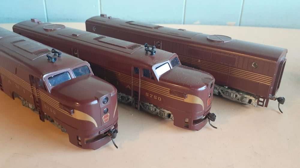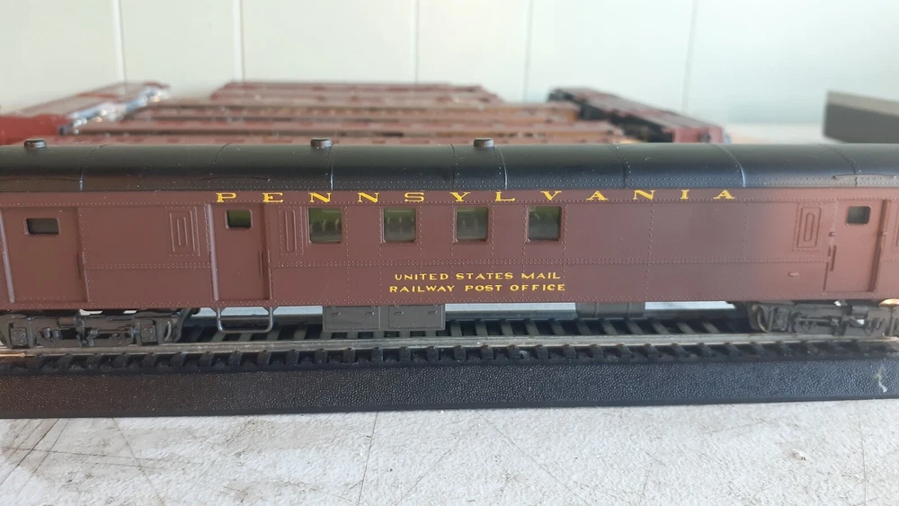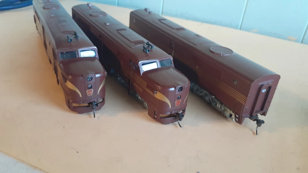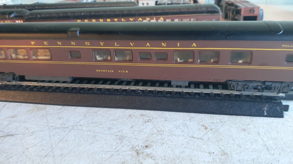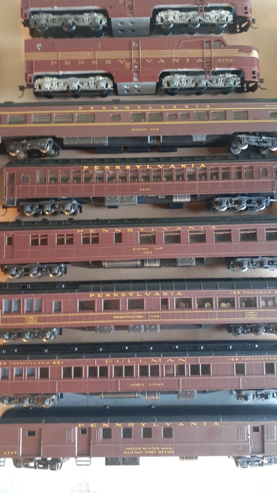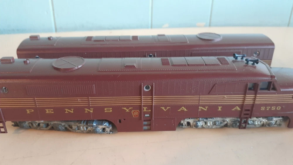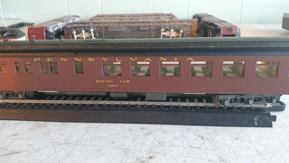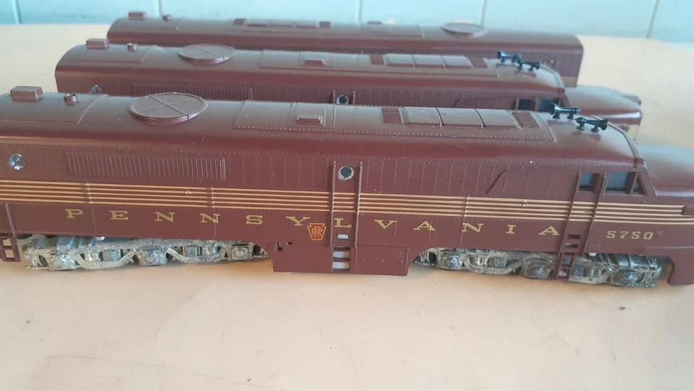 LOT OF HO SCALE PENN LOCOMOTIVES AND PASSENGER CARS CONSISTS OF THE FOLLOWING: 1.. Athearn #3304 HO Scale - PRR PA-1 Powered Diesel #5750 & 5750 MATCHING DUMMY & 5750 UNIT B Unit Unpowered.. locomotive runs smooth and lights, needs a back coupler -- the matching dummy is good, unit B needs one coupler. all knuckle couplers. 2.. 6 car Rivarossi set is illuminated- all steel wheels and knuckle couplers: mail car 6529 james logan passenger car observation car 4496 dining car 1104 passenger car 3940 mountain view pullman 3.. indian point baggage car- not illuminated- brand unknown- steel wheels- knuckle couplers all in very good condition see pictures.