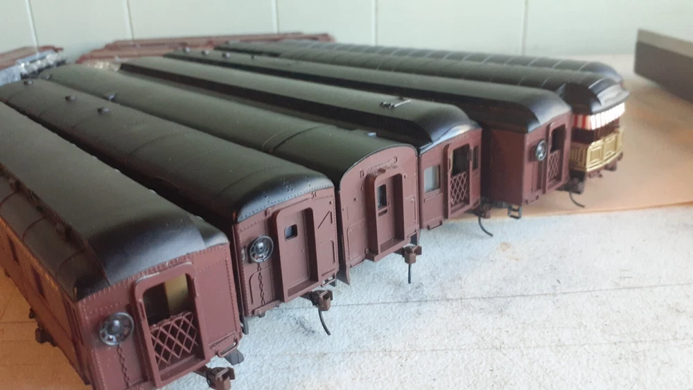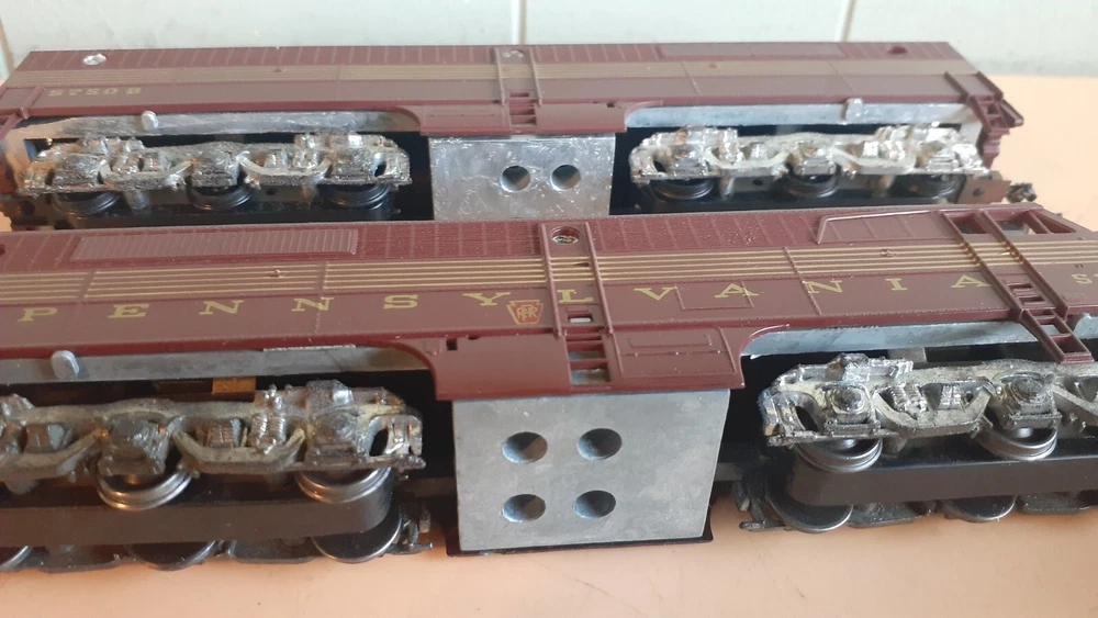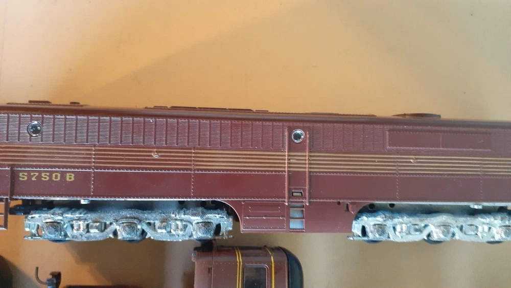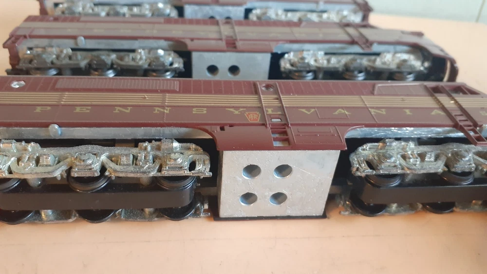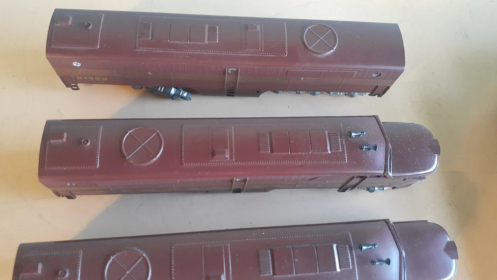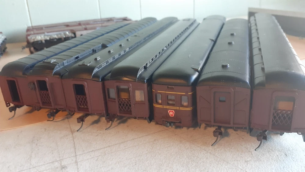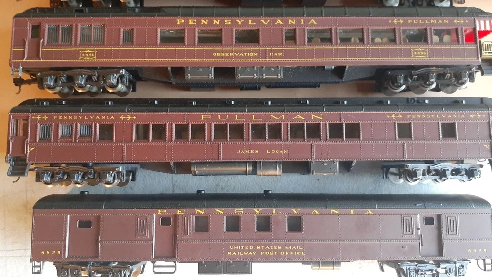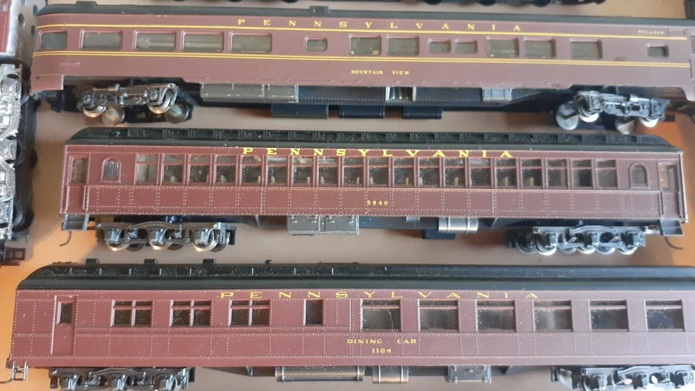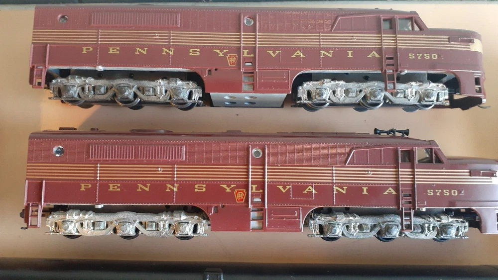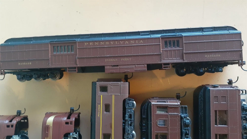 LOT OF HO SCALE PENN LOCOMOTIVES AND PASSENGER CARS CONSISTS OF THE FOLLOWING: 1.. Athearn #3304 HO Scale - PRR PA-1 Powered Diesel #5750 & 5750 MATCHING DUMMY & 5750 UNIT B Unit Unpowered.. locomotive runs smooth and lights, needs a back coupler -- the matching dummy is good, unit B needs one coupler. all knuckle couplers. 2.. 6 car Rivarossi set is illuminated- all steel wheels and knuckle couplers: mail car 6529 james logan passenger car observation car 4496 dining car 1104 passenger car 3940 mountain view pullman 3.. indian point baggage car- not illuminated- brand unknown- steel wheels- knuckle couplers all in very good condition see pictures.