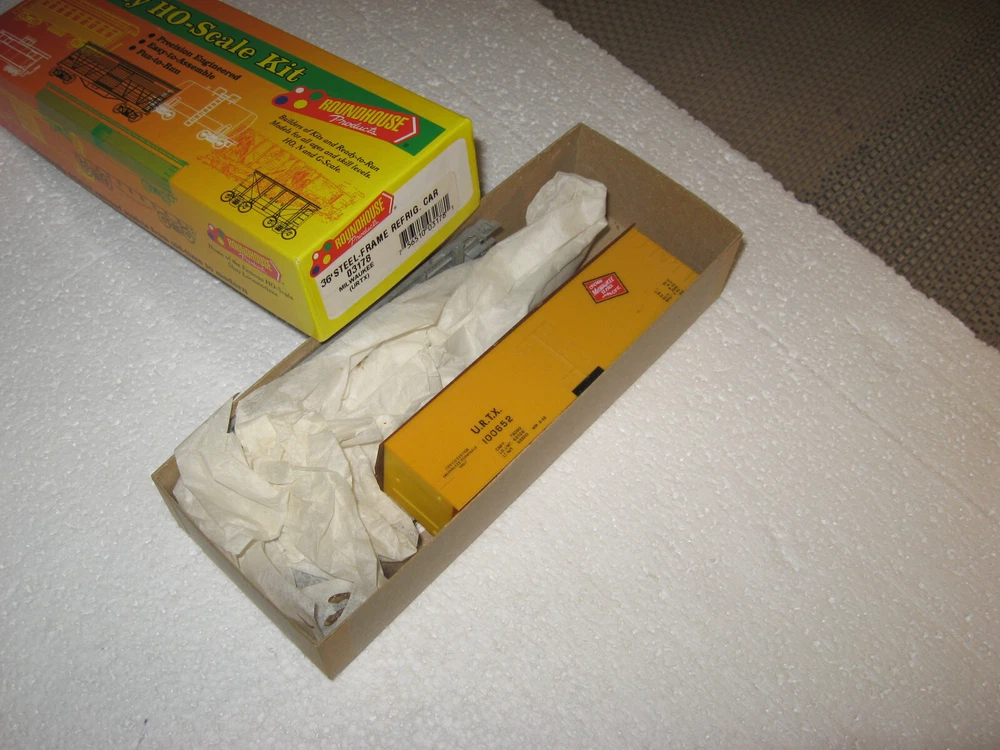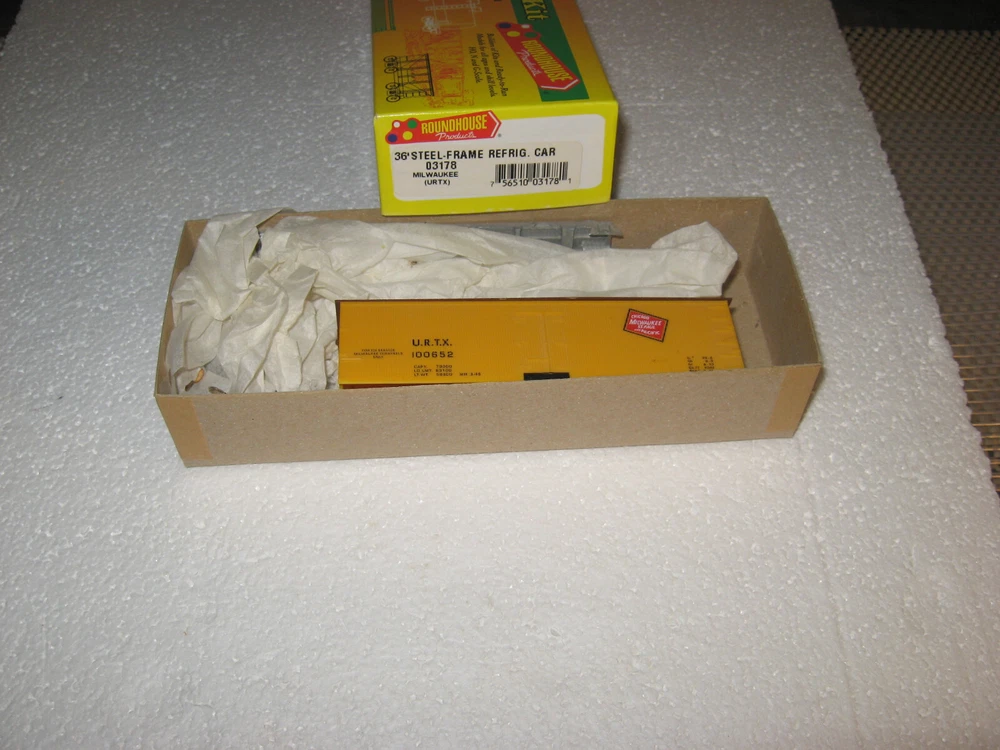 HOWDY FOLKS! THIS IS THE HO SCALE ROUNDHOUSE 36' MILWAUKEE [U.R.T.X.]STEEL-FRAME REEFER KIT! NUMBER ON ORIGINAL BOX 03176,REEFER NUMBER IS 100652.THIS KIT IS COMPLETE CHECKED BEFORE LISTING AND BEFORE SHIPPING WITH INSTRUCTIONS.PLEASE CHECK ALL PICTURES AND ZOOM RIGHT IN THERE! ONLY $ 12.00 AND YOU CAN BUY IT NOW IF YOU WISH TOO. ADD IT TO YOUR COLLECTION OR LAYOUT. WE COMBINE SHIPPING ON ALL OUR ITEMS. IF YOU NEED ANYTHING PLEASE DON,T HESITATE AND ASK! JUST USE THE CONTACT SELLER ON TOP OF THE LISTING ON EBAY EMAIL. THANK YOU AND TAKE GREAT CARE NOW!