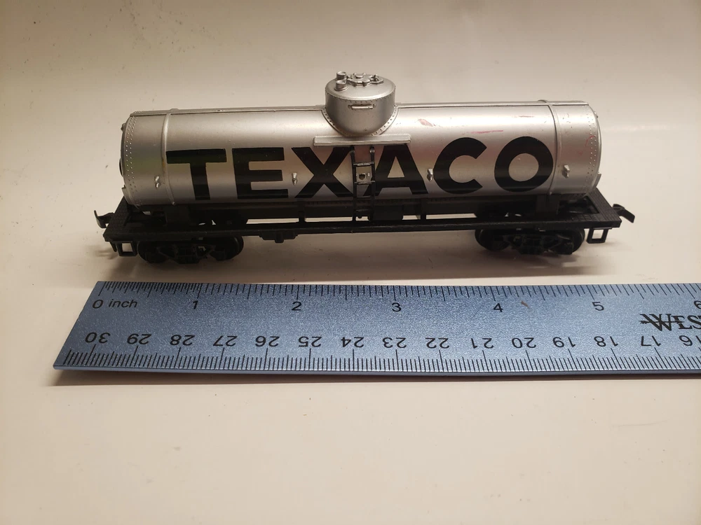 Comes with everything in the photos. The Railroad station and accessories, 4 train cars (Texaco, Cabose, Car Hauler, Log Hauler) The instructions, stickers, misc. pieces, and 5 automobiles ( some have missing wheels.) There is some wear on all the pieces.