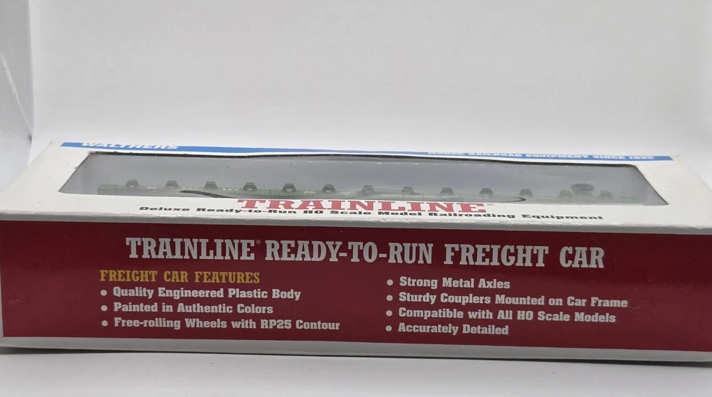 This HO Scale Walthers flat car is a must-have for any model railroad enthusiast. With its vibrant Burlington Northern green color and detailed painted design, it's sure to be a standout addition to your collection. Made of high-quality plastic and assembled to perfection, this pre-built train set is ready to go right out of the box. Featuring a two-rail system and analog control, this vintage flat car is a replica of a railroad franchise from the 1970s. It's perfect for anyone who loves transportation themes and wants to add some realism to their model train setup. At 1:87 scale, this flat car is a great addition to any HO Scale collection.