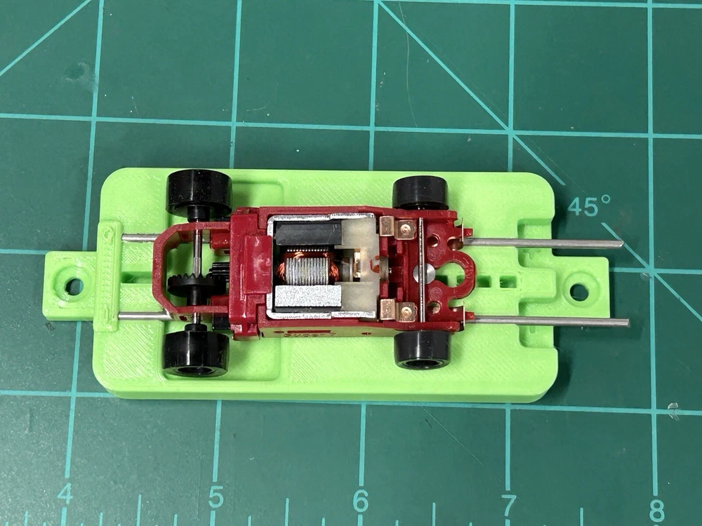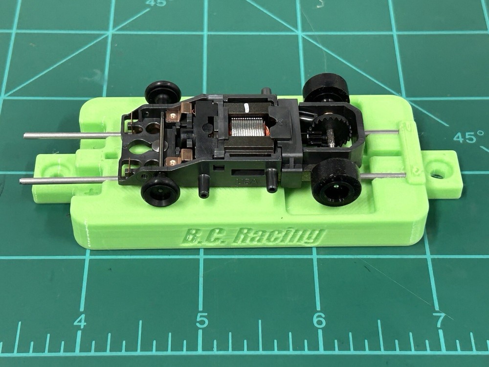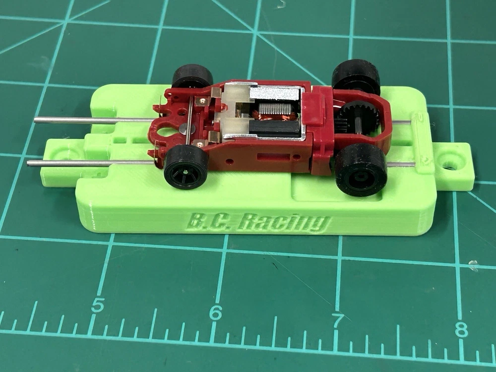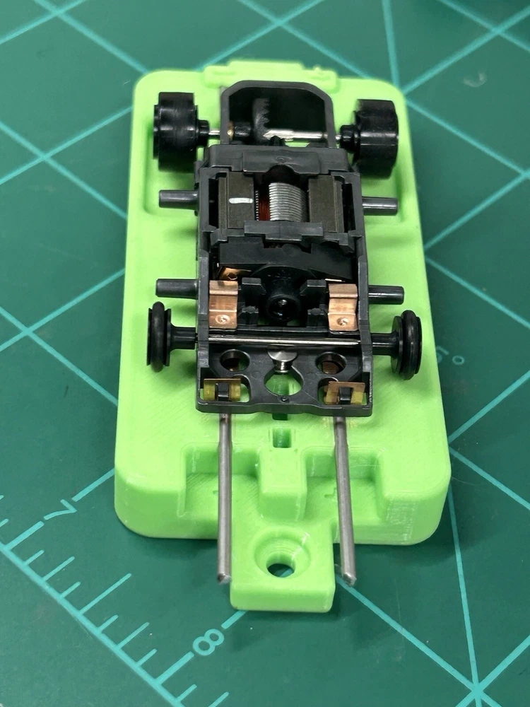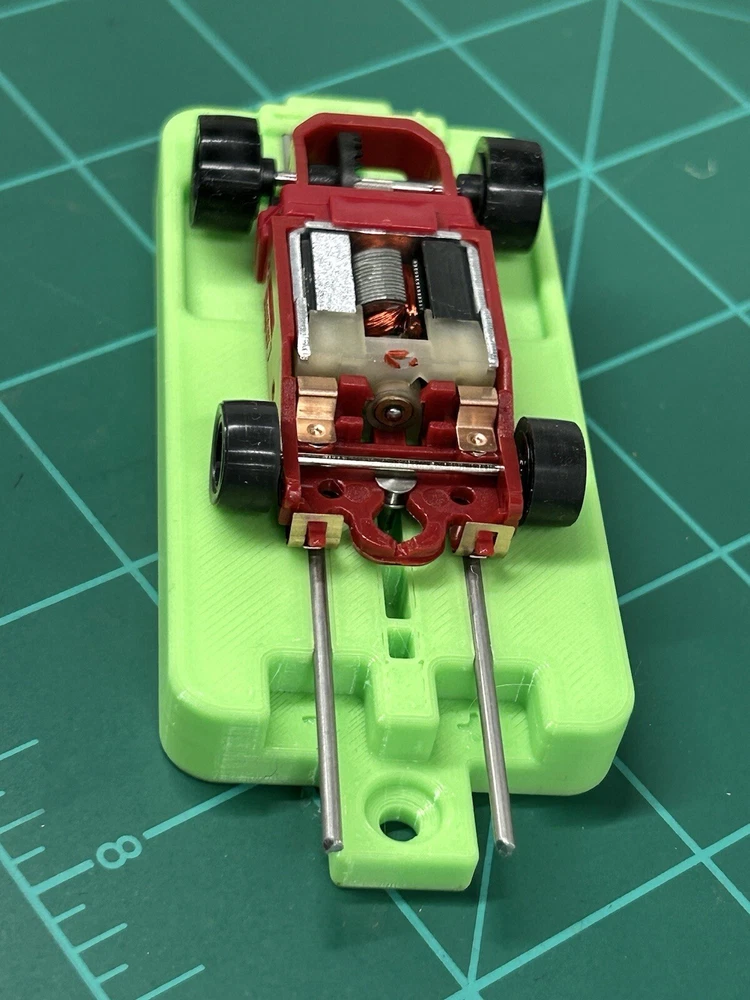 This is for SLOT CAR New style break in stand works with or without body fits many Chassis including HC slots Super 7 , Viper , Tyco AFX and many more just hook to a 9v battery or a power supply to run chassis for warm up or break in . Stand ONLY chassis are for display only. Condition is New color may vary Other colors availble See other auctions or message me