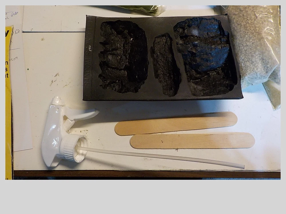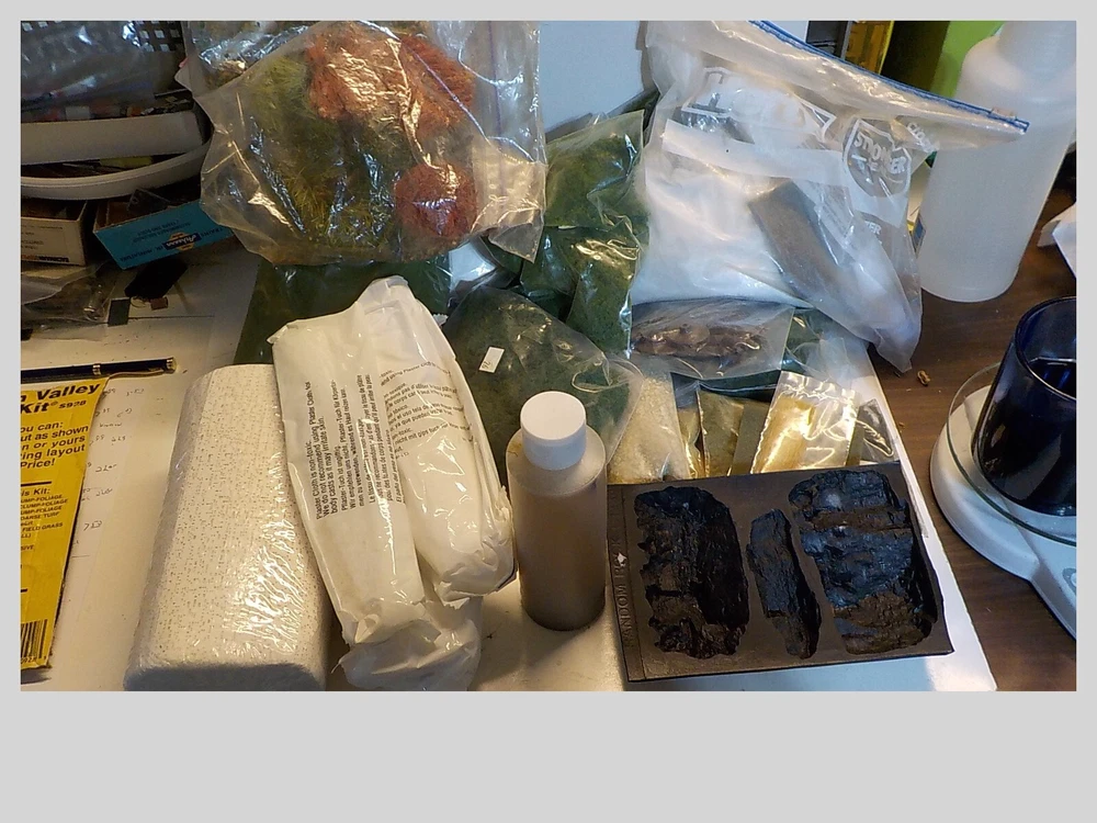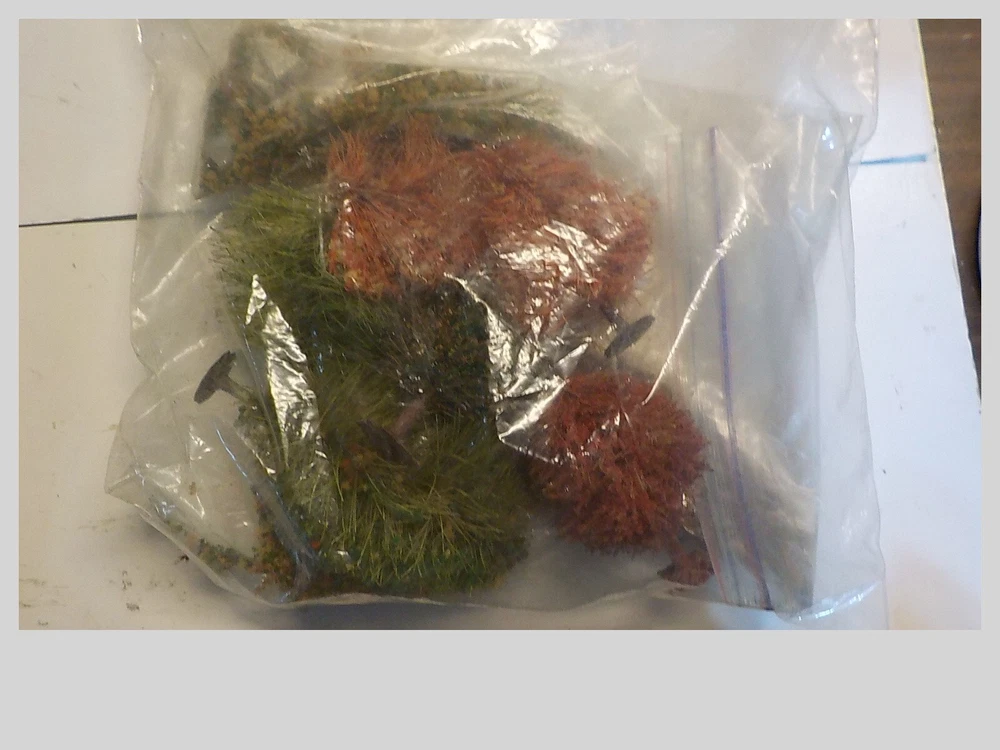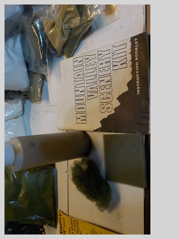loads of plaster cloth rock mold spray head stirring sticks 10 bags of forage & turf rock debris book of instructions lightweight hydrocal tree trunks bag of old trees ( flocking is cominoff of these) the box is 9 pounds